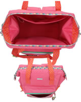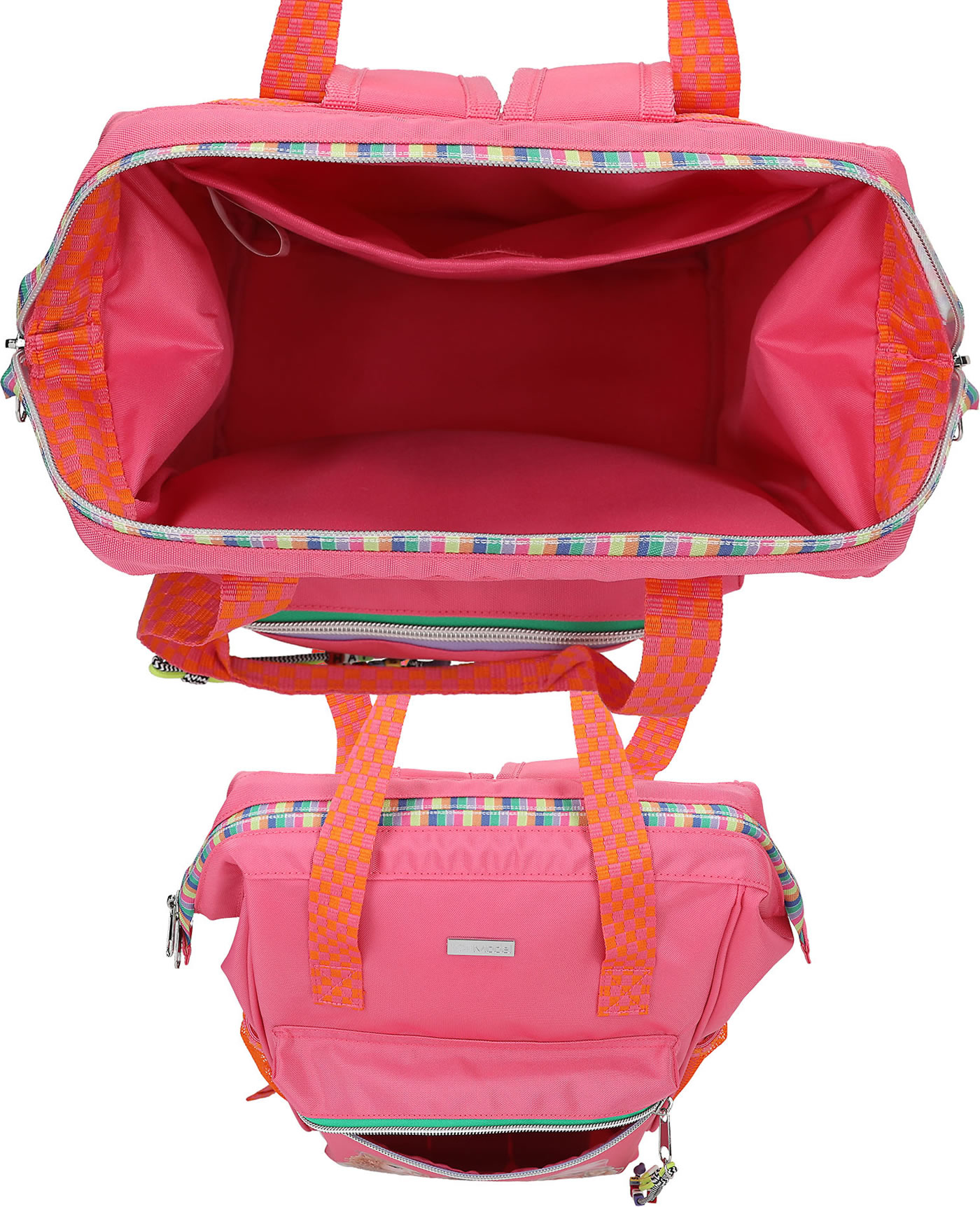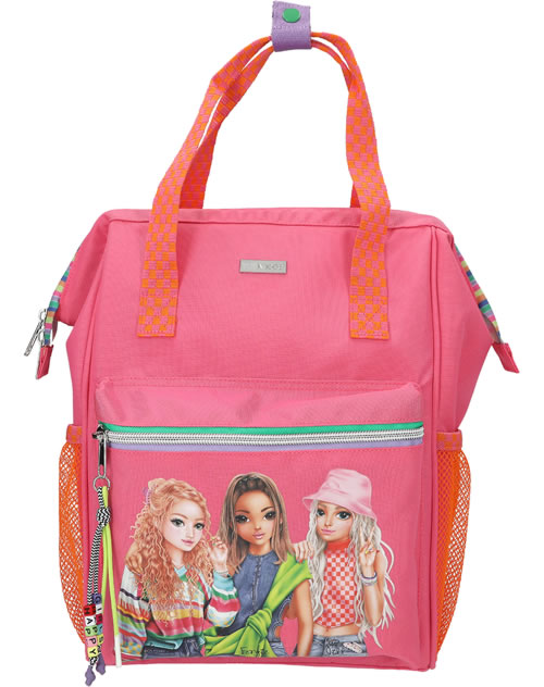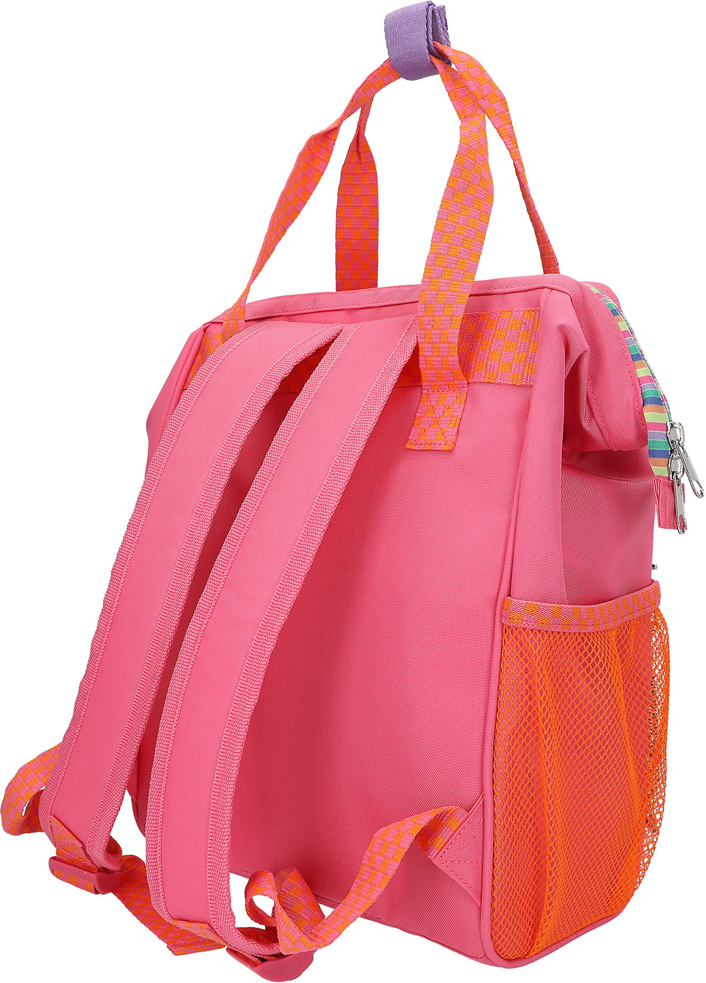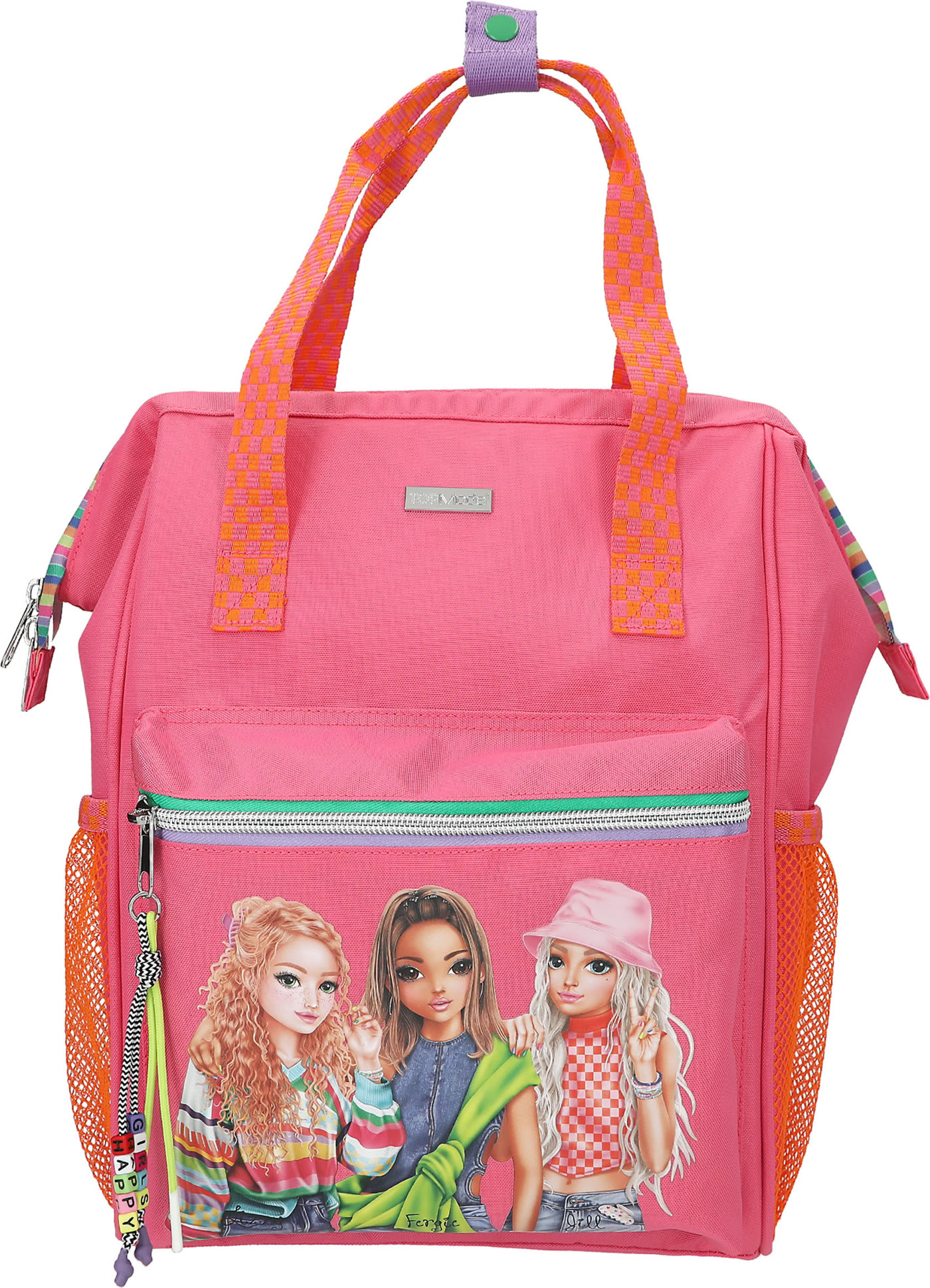 Colorful makes you happy: The pink TOPModel backpack JOY has a great motif with three models on the front pocket, colorfully patterned zipper straps, orange mesh pockets on the side, padded shoulder straps that can be adjusted in length, two carrying handles and a super cool zipper pull made of colorful ribbons and letter beads (HAPPY GIRLS). When open, the bag offers a good overview of the inside thanks to the integrated clip closure. Practical: the padded inner compartment for safe transport, e.g. of a tablet.
