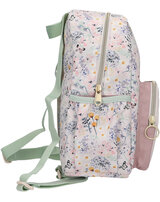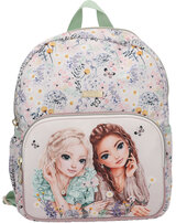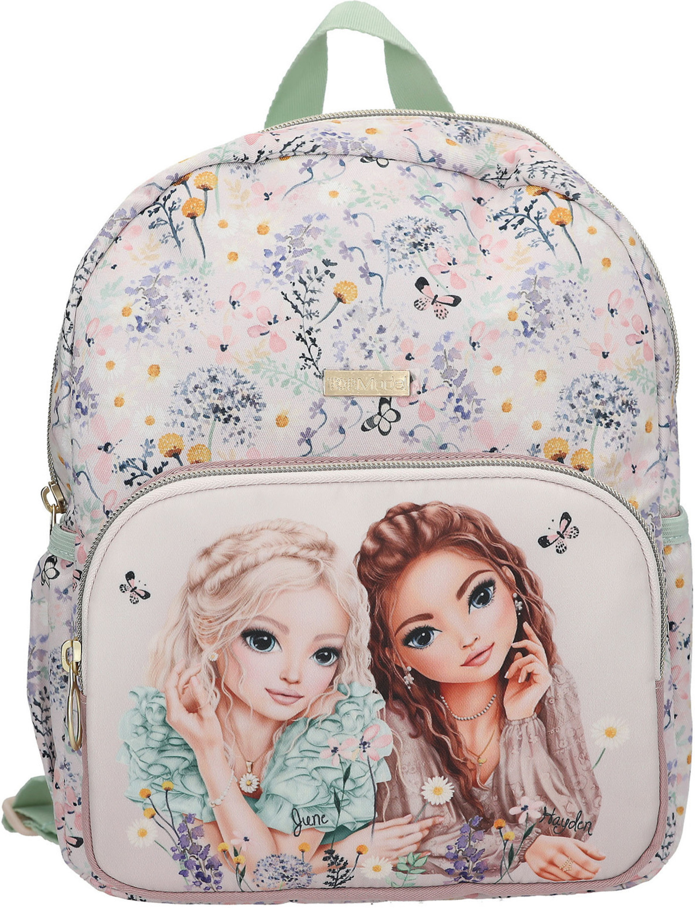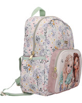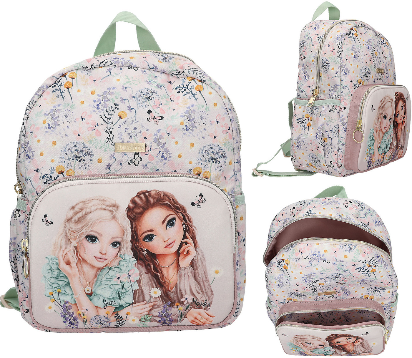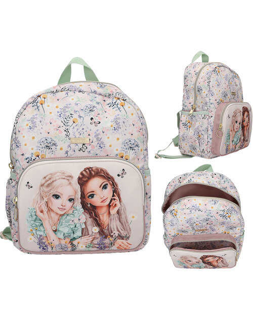 The TOPModel backpack features a romantic double-model motif on the front and a pattern of delicate flowers and butterflies all around.