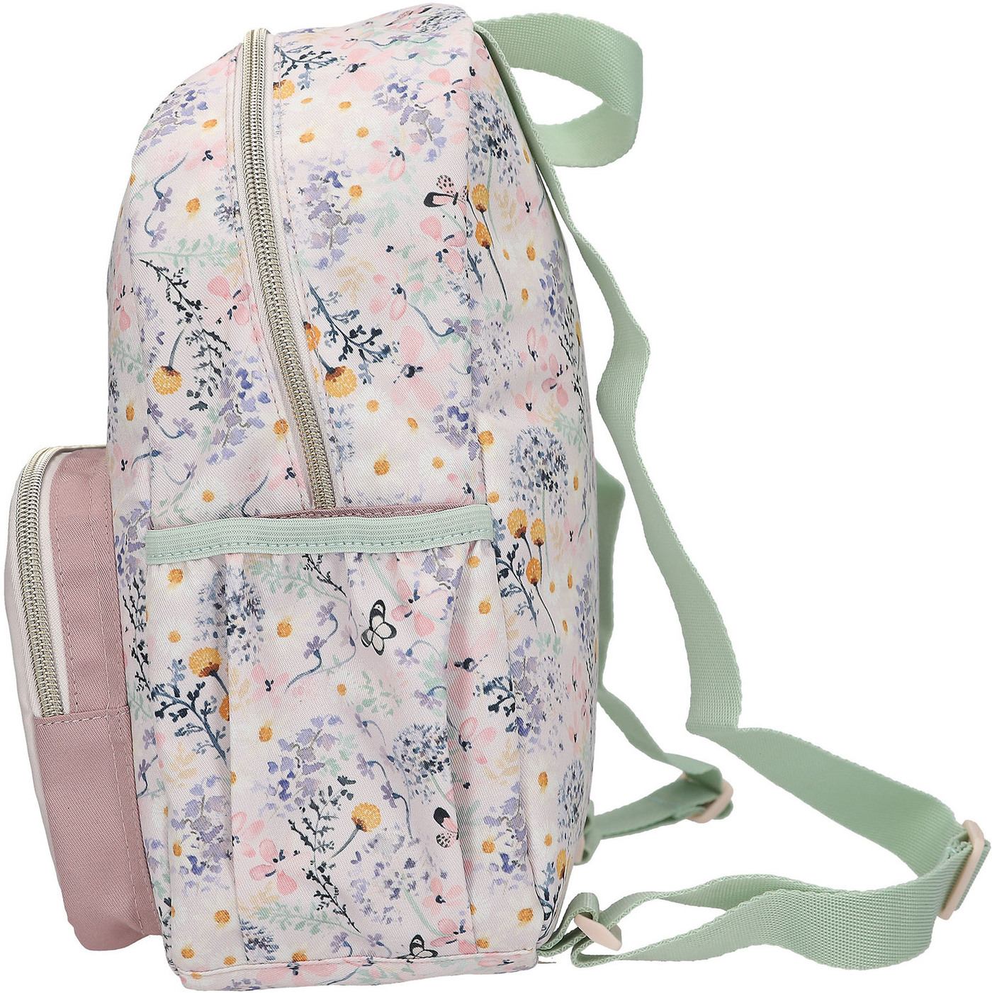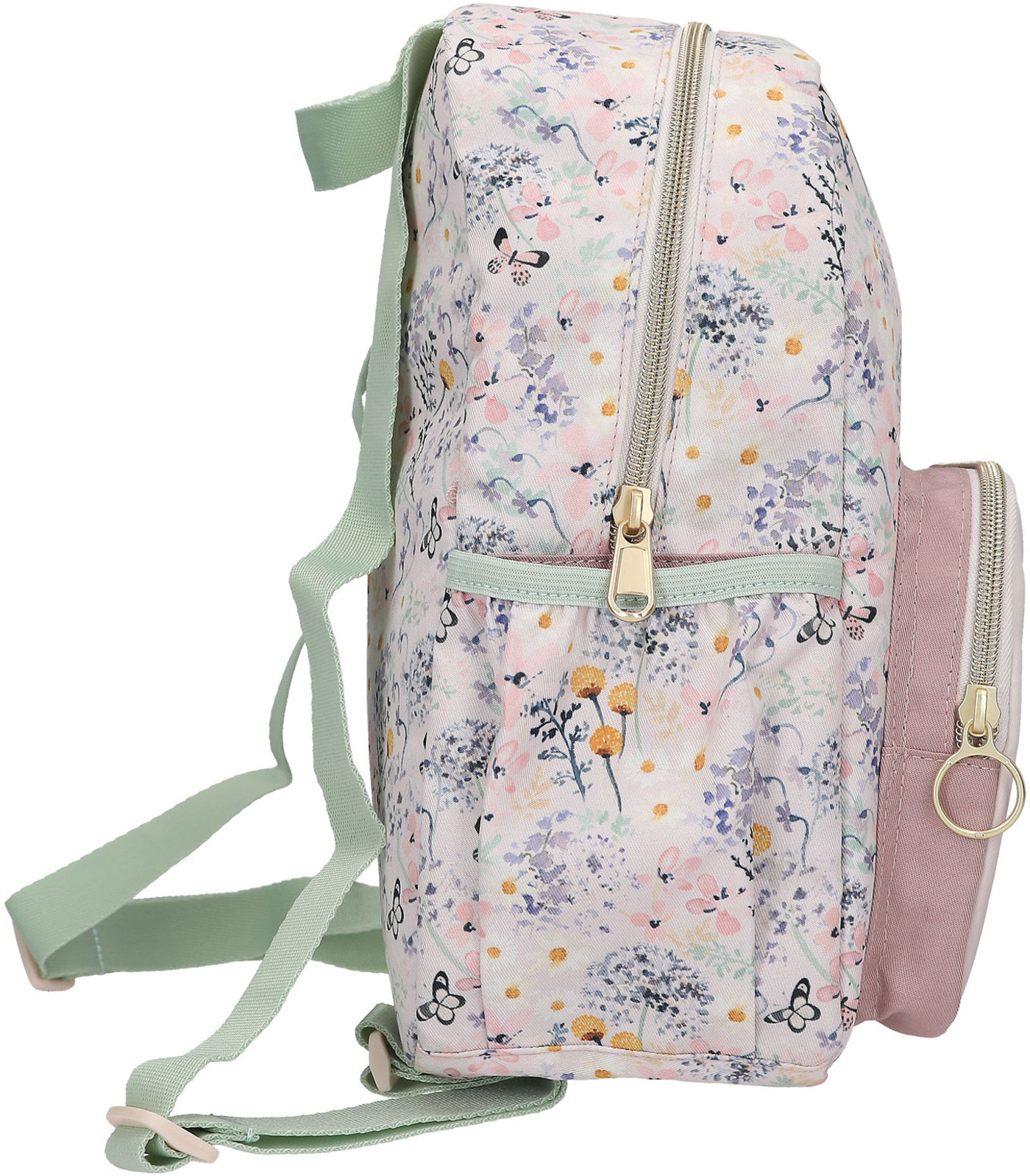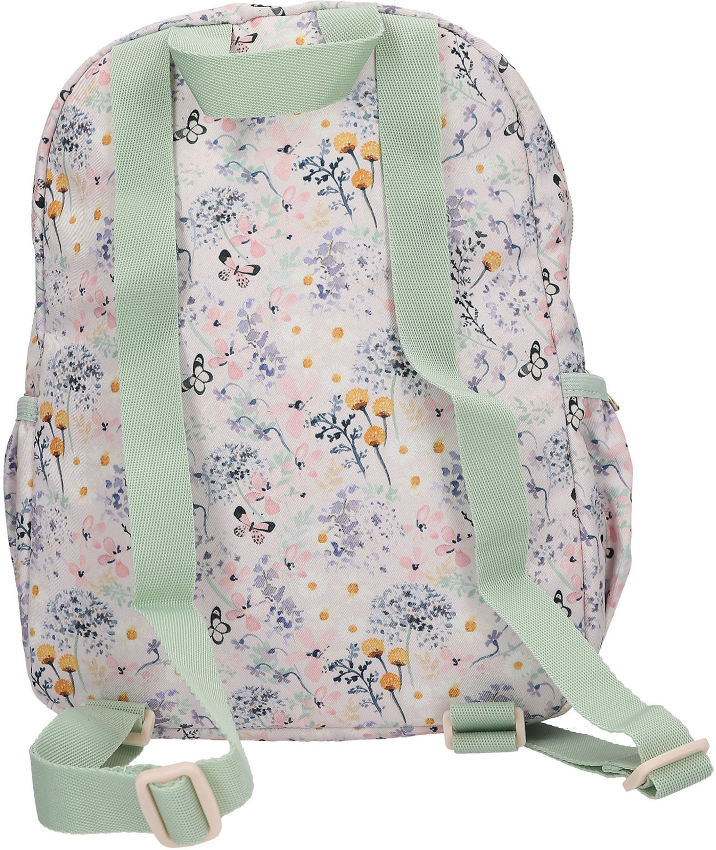 The TOPModel backpack features a romantic double-model motif on the front and a pattern of delicate flowers and butterflies all around.