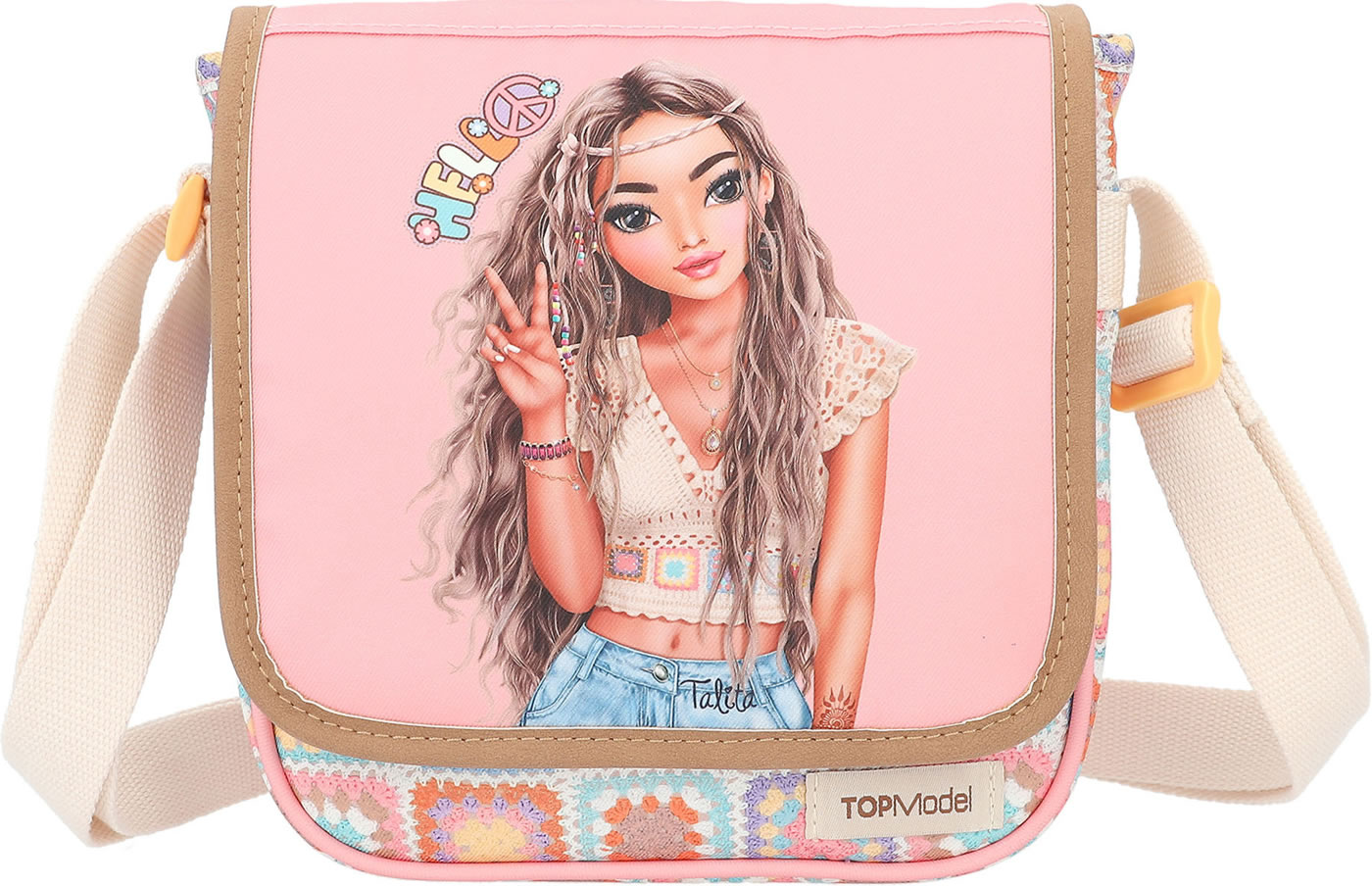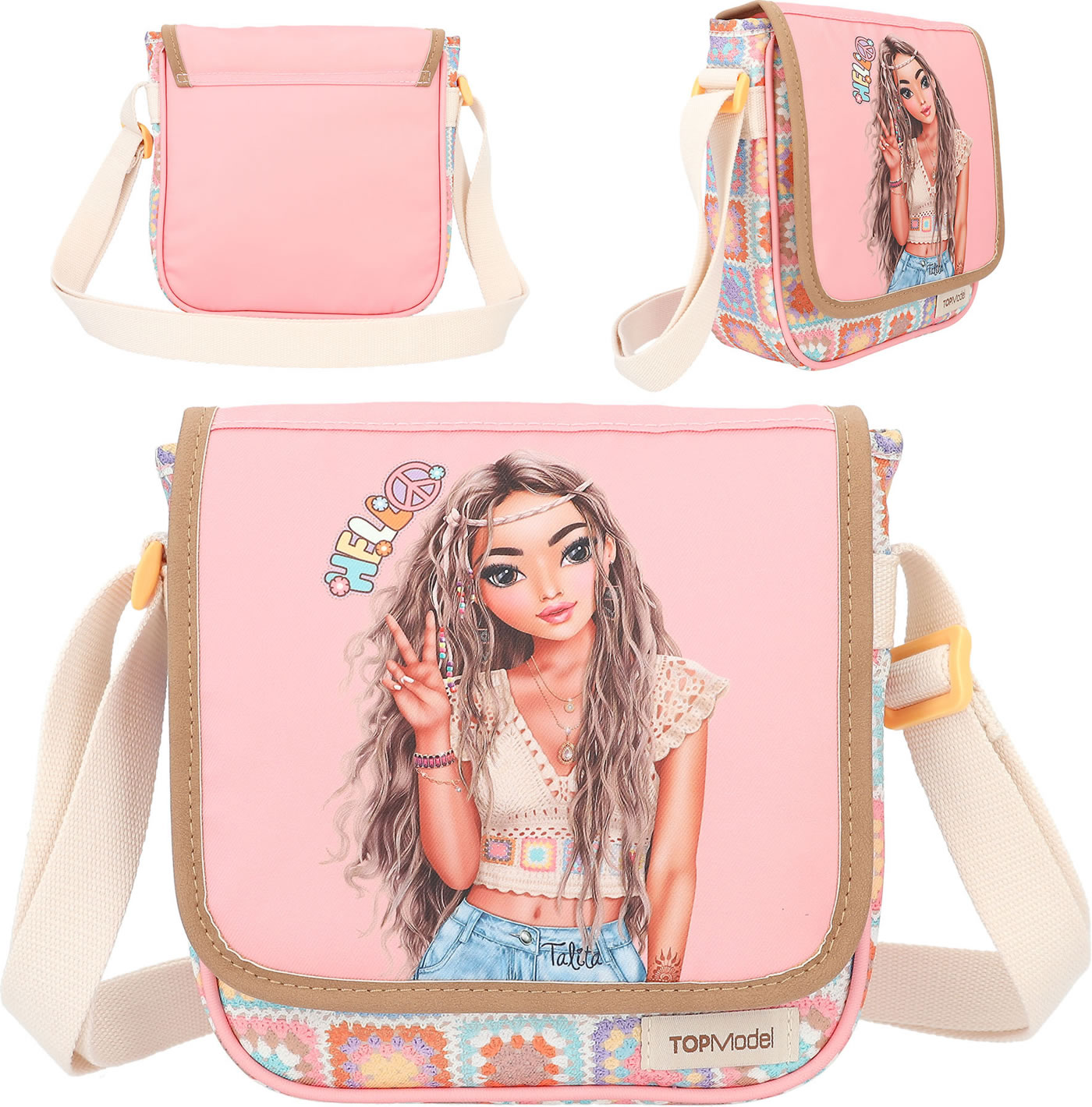 Dearest: The HIPPIE HEART shoulder bag with the TOP model Talita. Whether you're strolling around town or meeting up with your friends - all the accessories you need fit into this bag. The bag has a magnetic closure and an inner compartment. The strap is adjustable.
