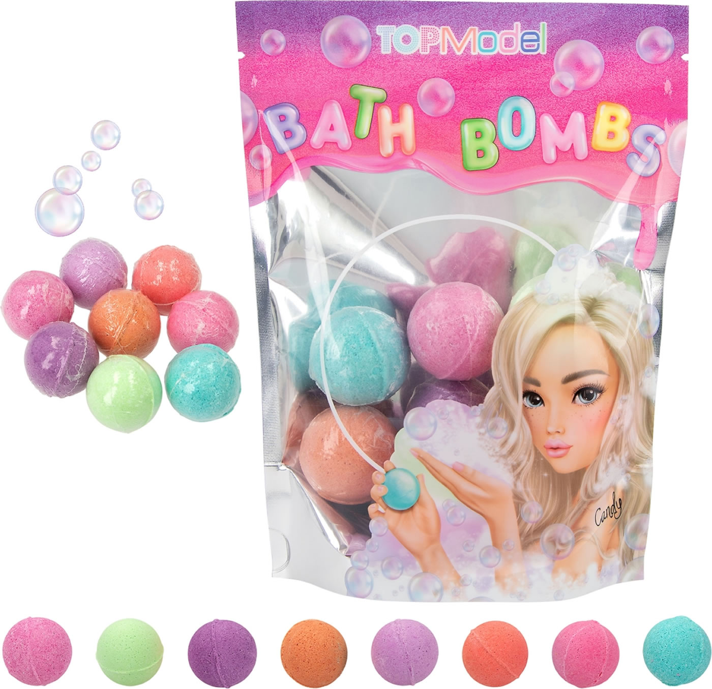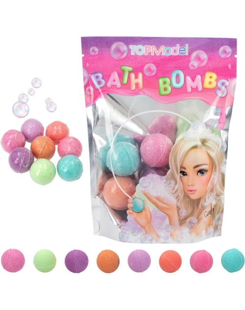 Bathing fun with TOPModel: The 8 colorful bath balls dissolve in the bath water and give off a great scent: the pink balls smell of strawberries, the purple balls smell of pineapple, the blue and green balls smell of chewing gum and the peach-colored balls smell of Vanilla.