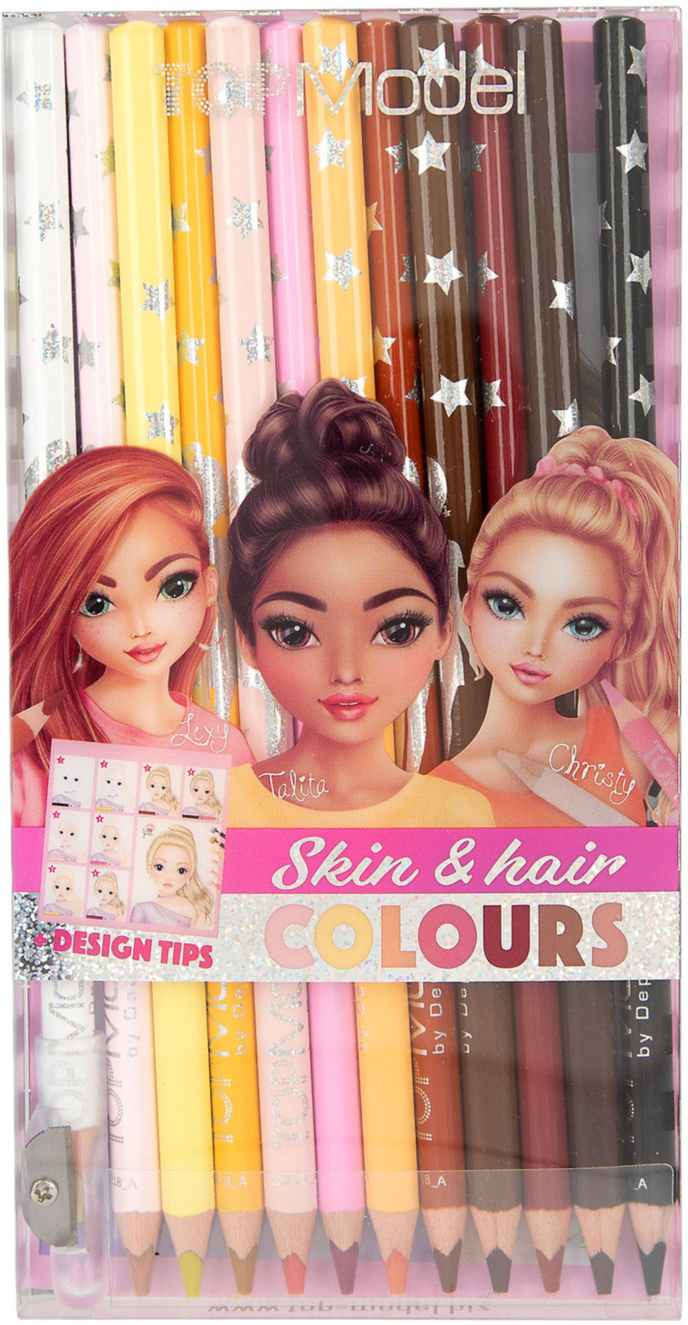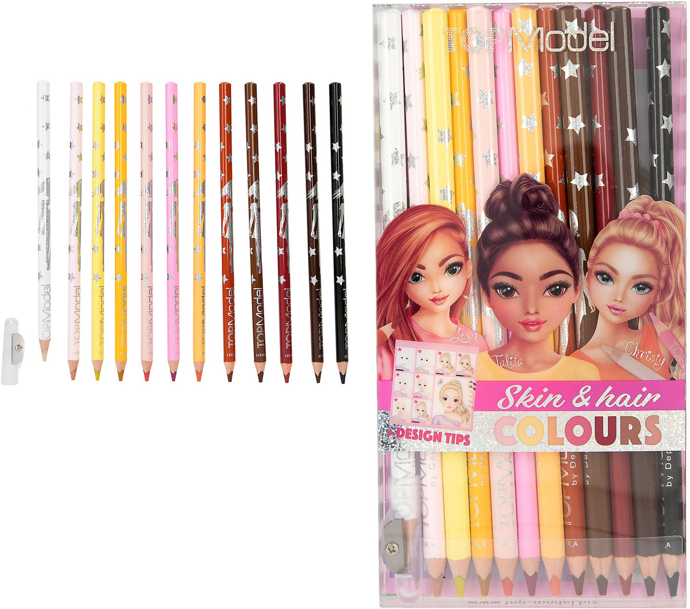 All colors for hair and skin: The TOPModel colored pencil set consists of 12 different colored pencils. The set includes: white, complexion, light yellow, gold, powder, rose, apricot, caramel, nougat, cocoa, mahogany, and black. For great results when painting hair and skin.