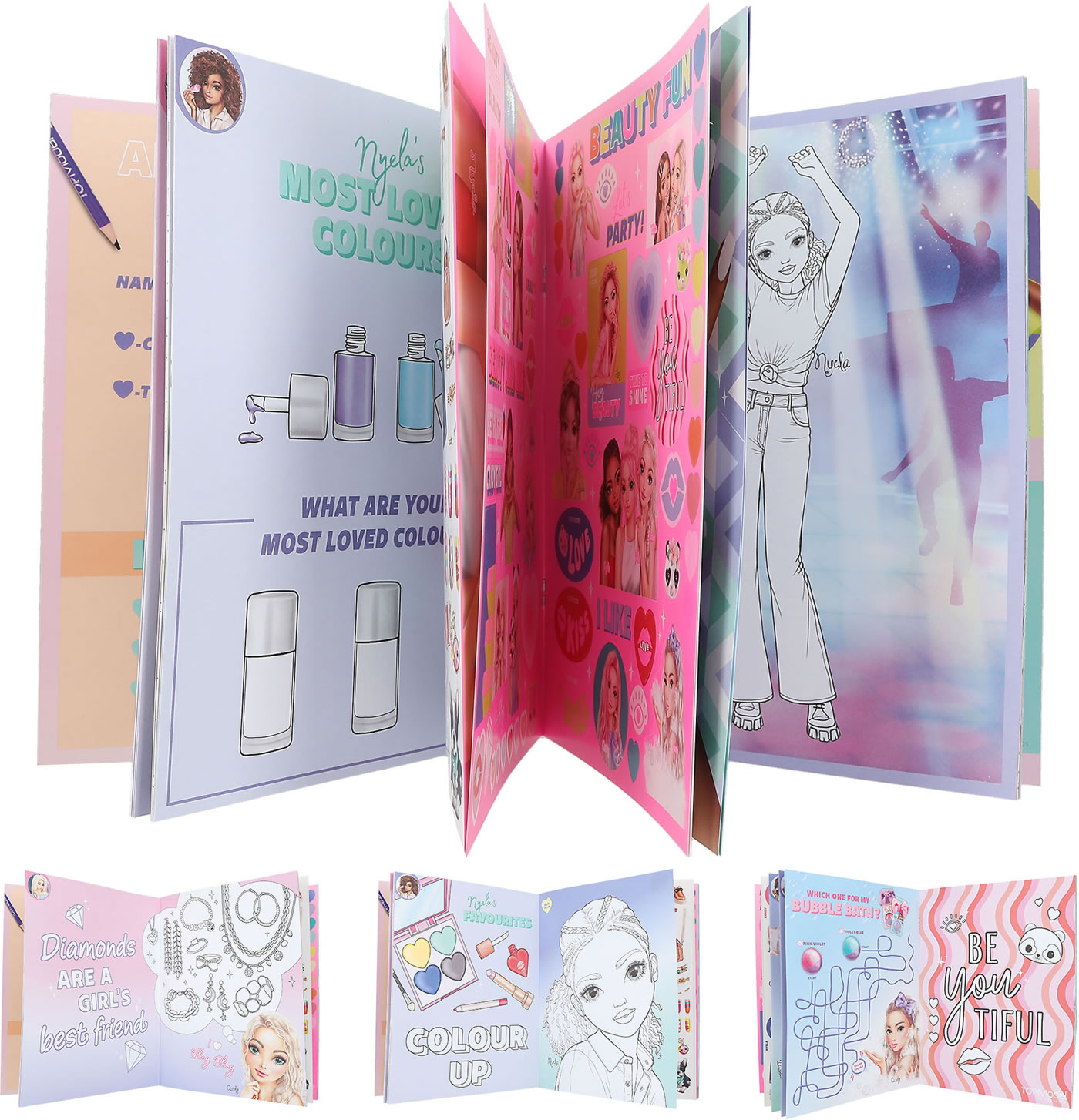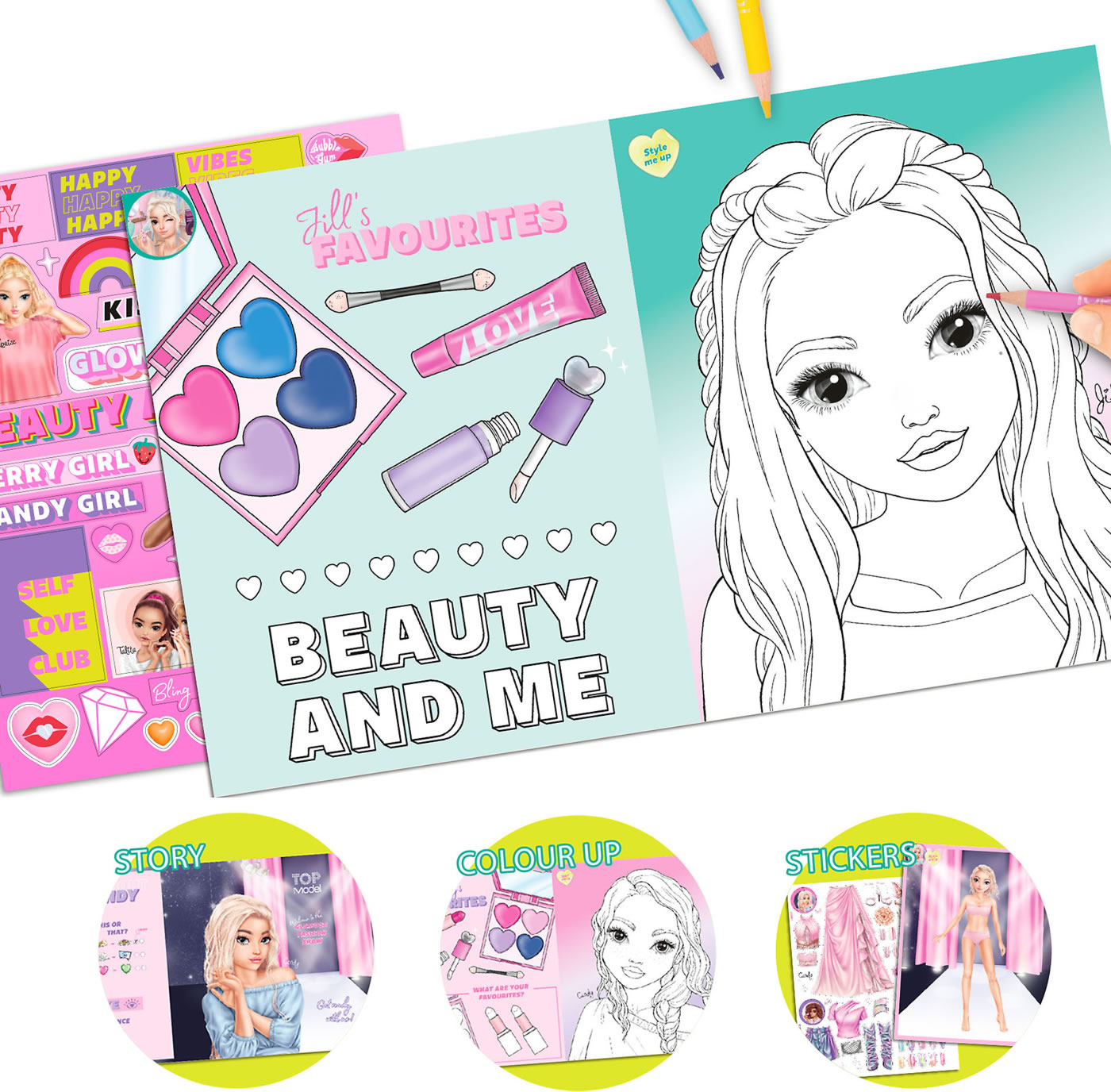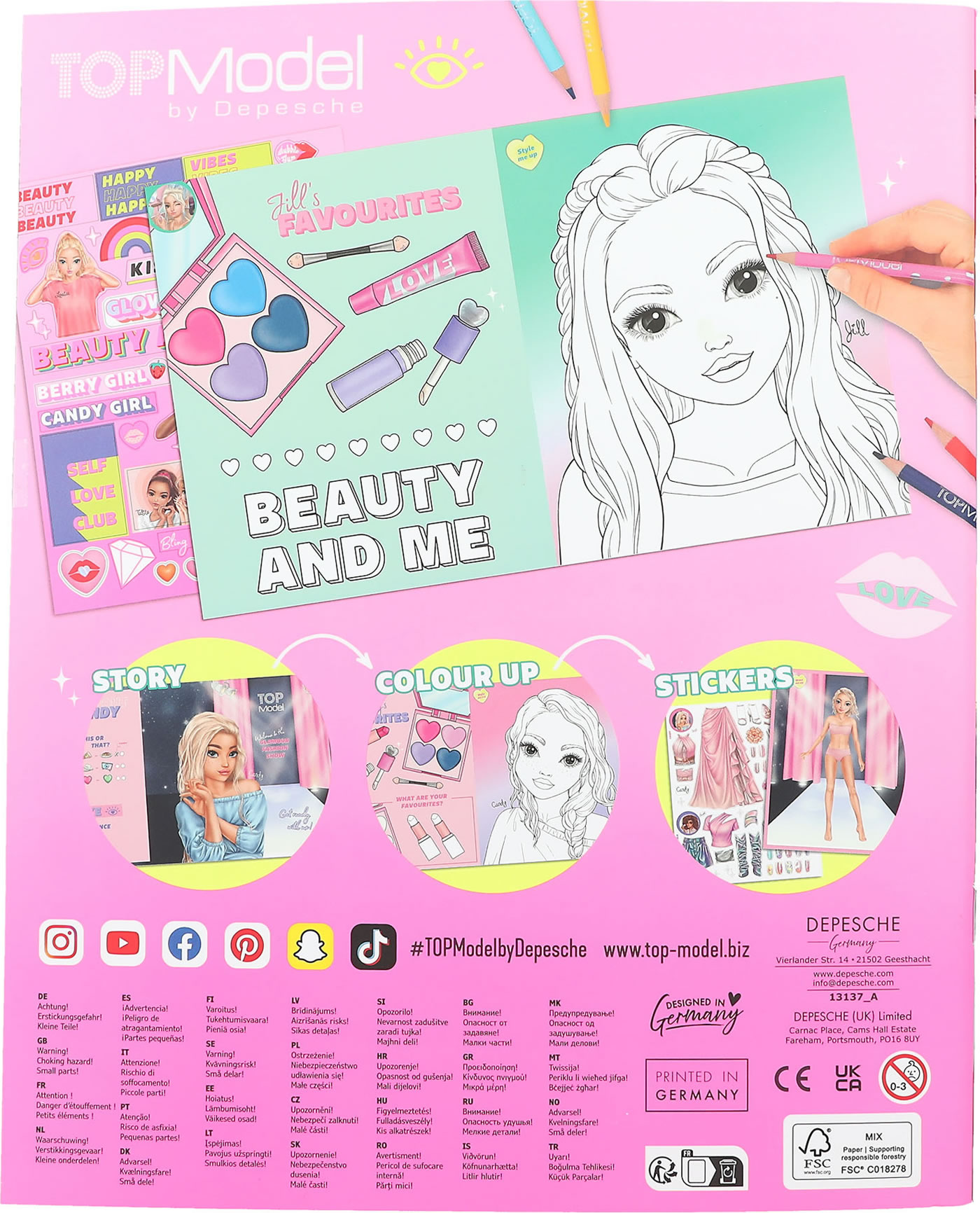 Make-up, nail design, outfits and accessories: The TOPModel coloring book on the topic of beauty has 36 pages for coloring and stickers. Included: 2 double pages of paper stickers and 1 double page of foil stickers.