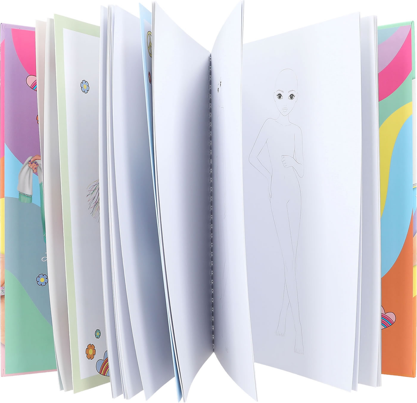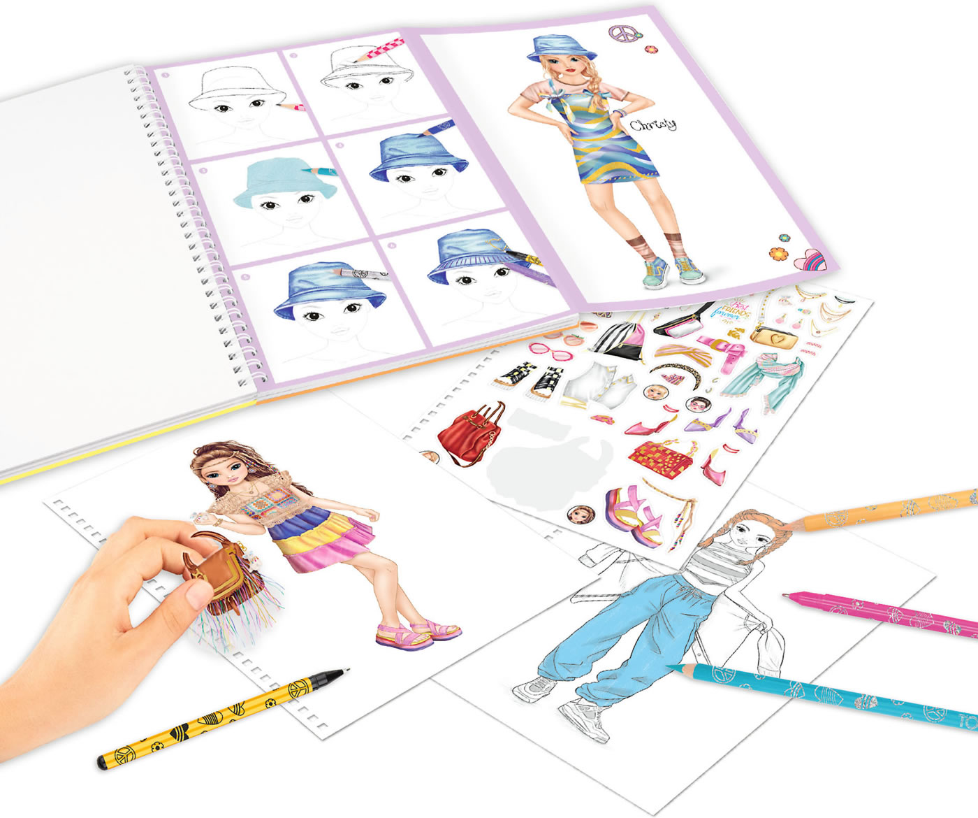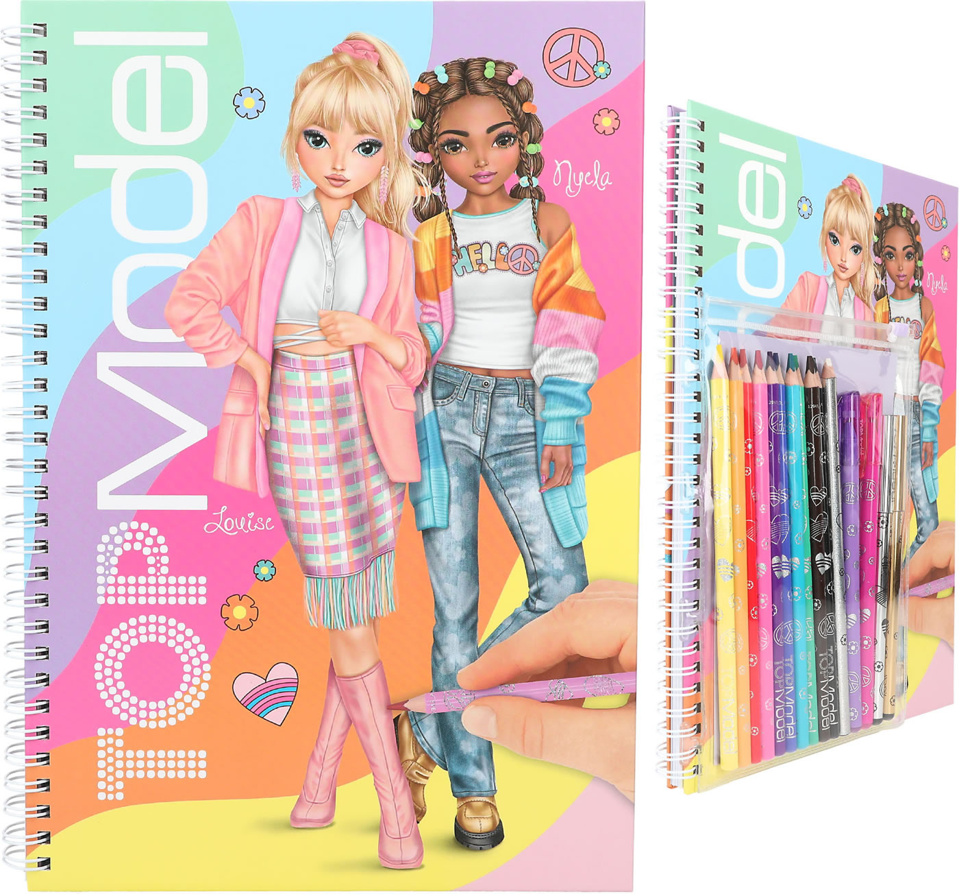 Ready for great looks: The TOPModel coloring book set in the new rainbow-colored look includes 76 coloring pages (some pre-printed in color), 2 fold-out pages with colorful coloring templates, 2 sticker sheets and pens essential for the design (10 colored pencils, 4 gel pens (gold, silver, pink, purple), 1 eraser pen).