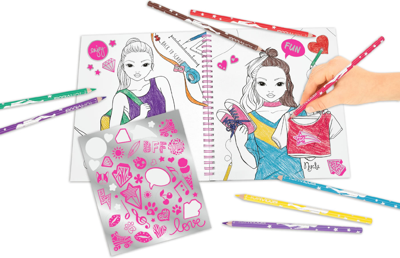 In the coloring book you will find many pictures for coloring and a sticker sheet.