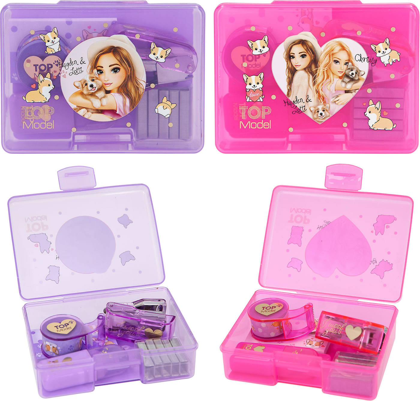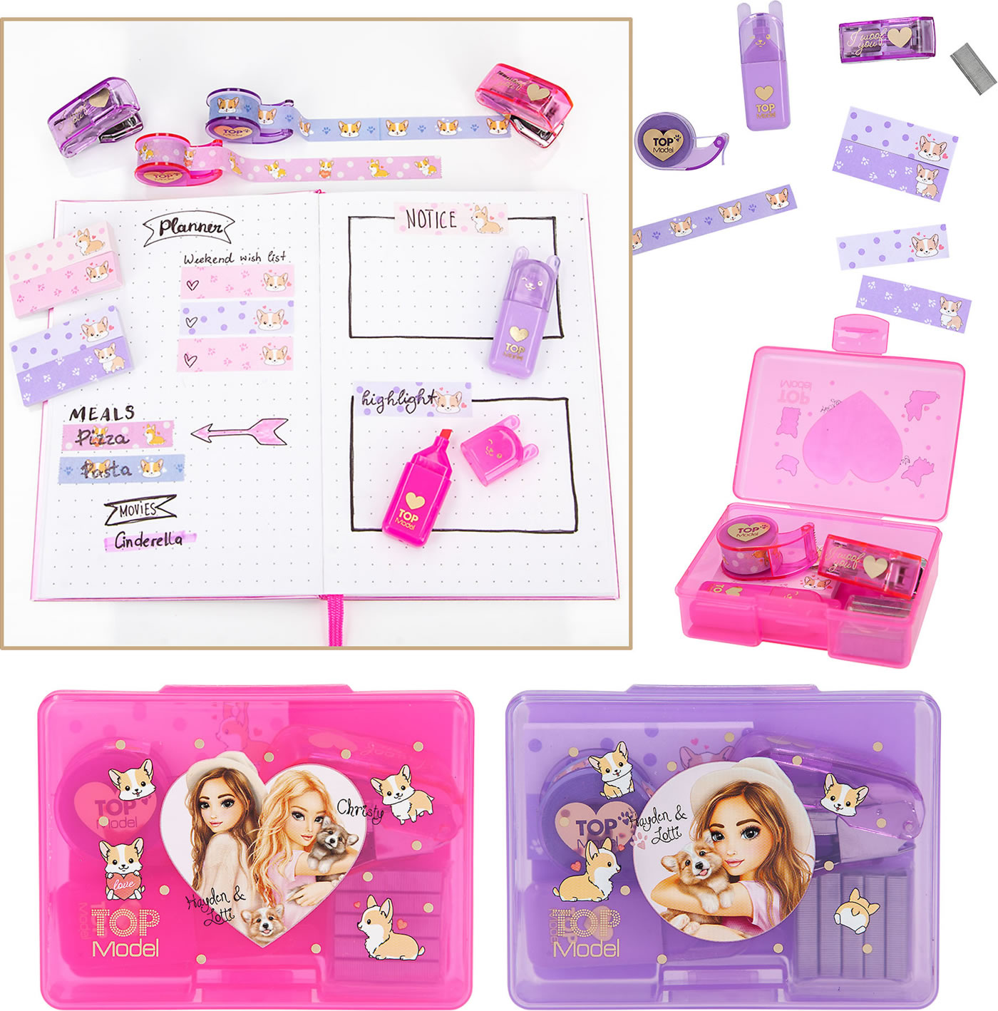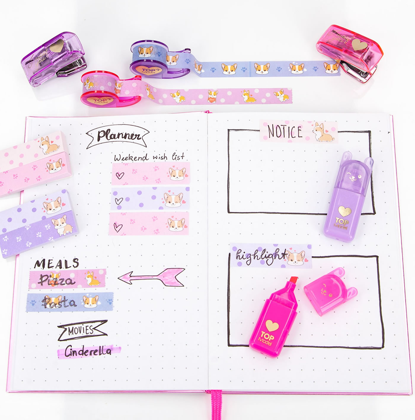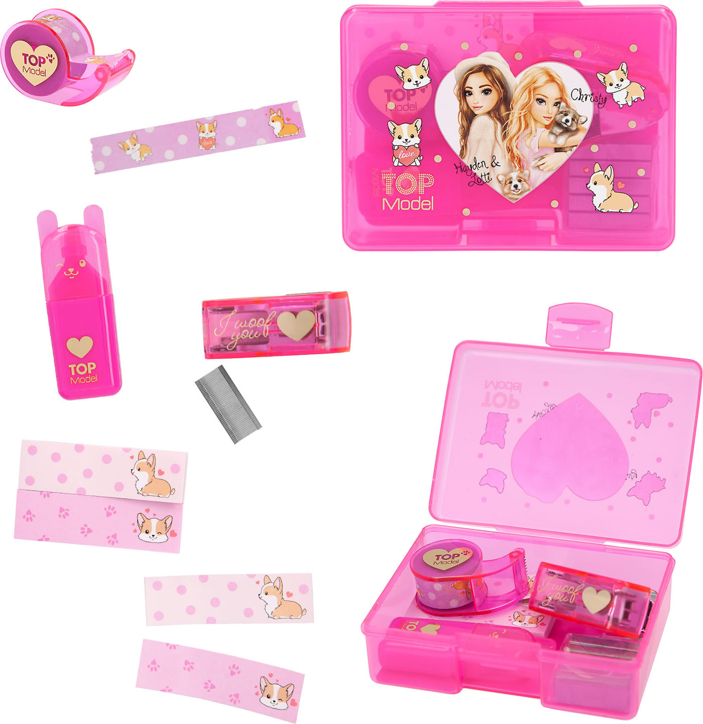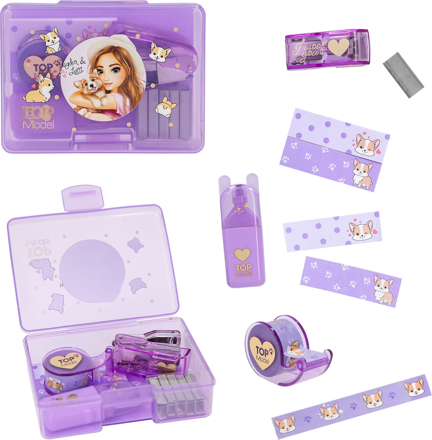 In the desk set from the current Corgi design series, the cute TOPModel fur friend is everywhere: on the 2 small sticky note pads, the highlighter with little ears, the decorative tape (4 m long, with dispenser) and, with a "Woof" , also on the tacker (incl. tacker needles for refilling, 10 mm wide, 5 mm high).