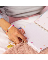 and the super cute colorful pearl bracelet with a HAPPY statement. The inside of the diary is colorfully illustrated and finely lined.
