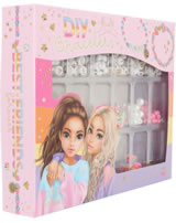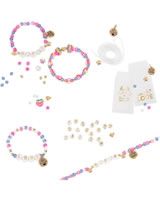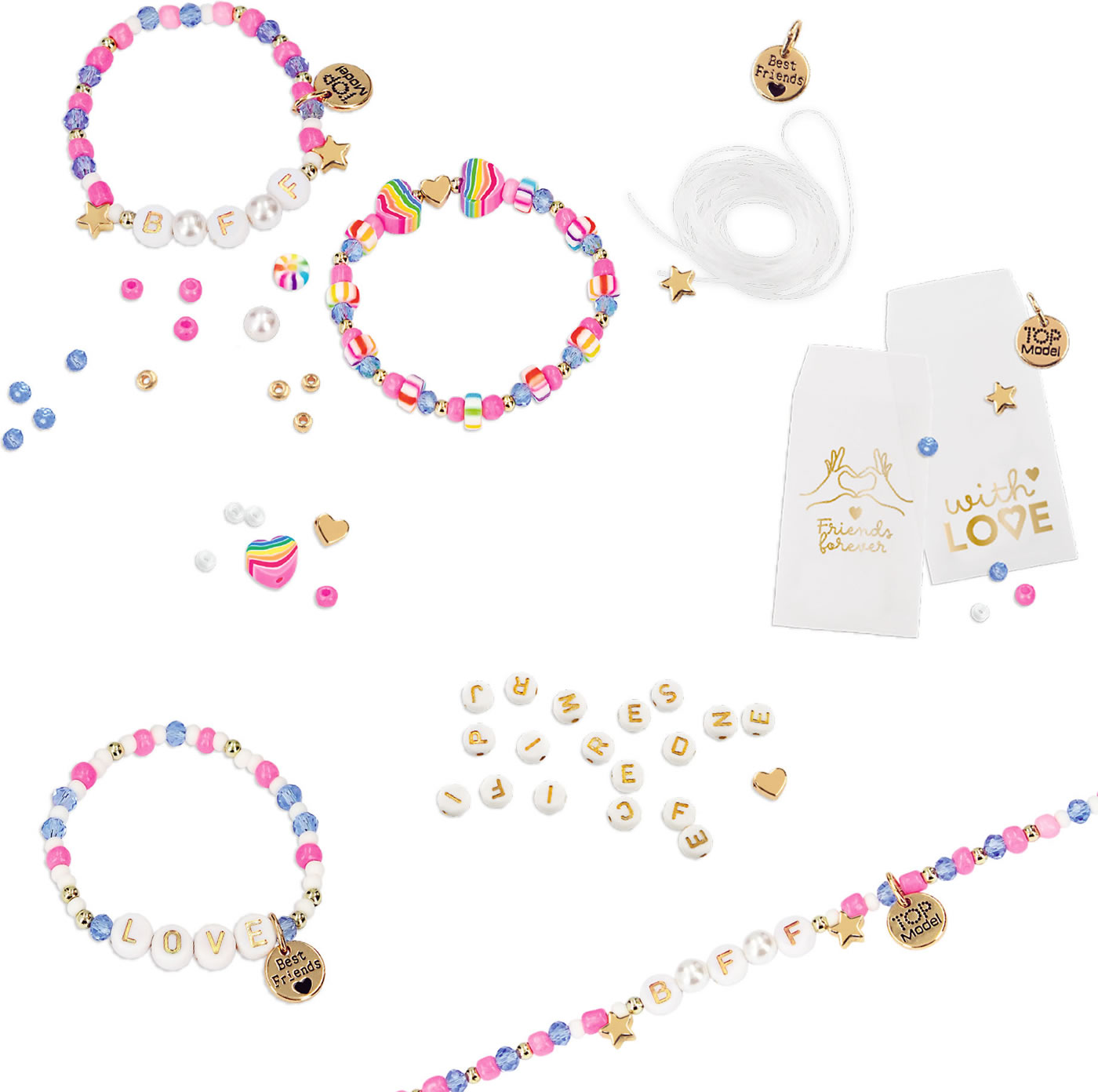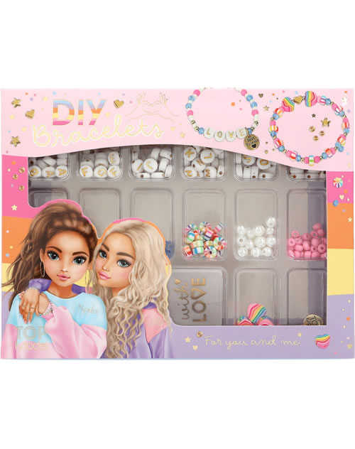 Lots of beads for lots of creativity: white and gold letter beads, matt white glass beads, rainbow-colored clay beads, light blue diamond beads, small gold beads, pink glass beads, shimmering white beads and 6 gold metal pendants (2x TOPModel logo, 2x heart, 2x star). Together with the elastic band (2 m) and the enclosed instructions for the correct knot, you can create trendy bracelets. by TOPModel.