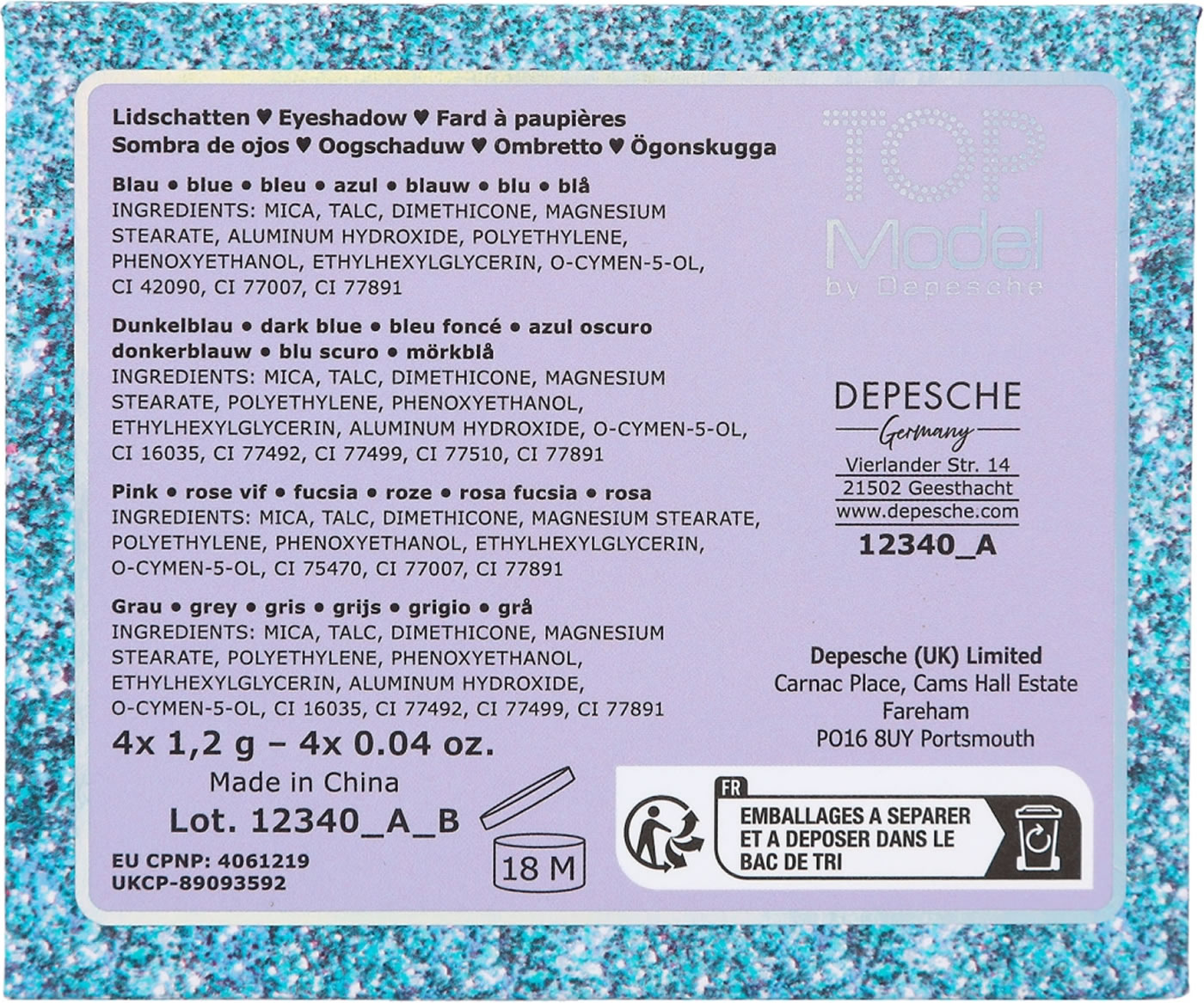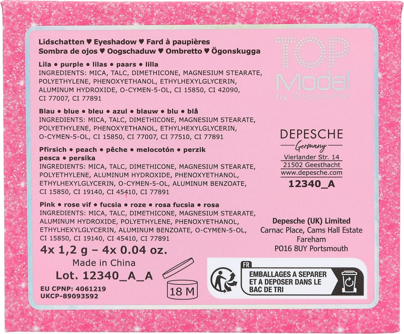 Beauty and me: The small eyeshadow palettes from the TOPModel Beauty series each have 4 eyeshadow colors (peach, pink, lilac, lilac and pink, blue, grey, petrol). With an applicator for application and a mirror in the lid. Content eye shadow: 1.2 g per