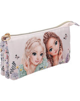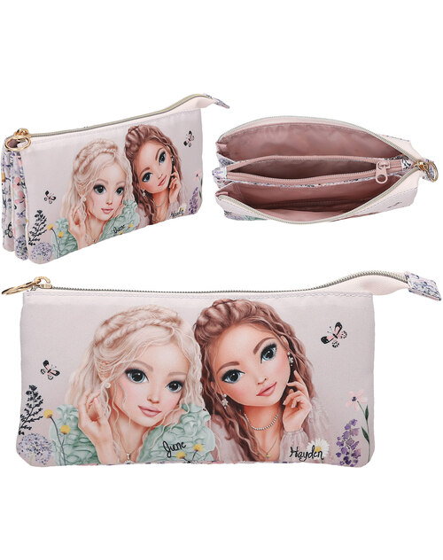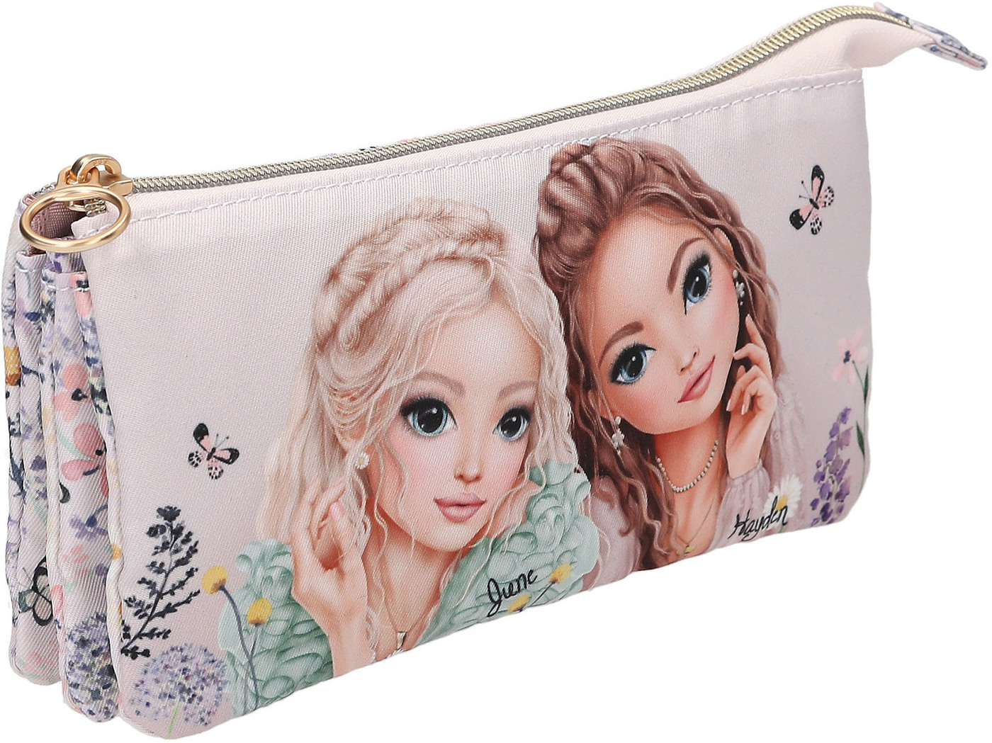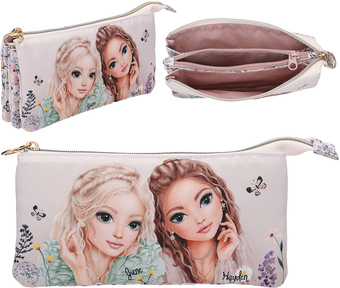 The gold-colored zipper opens to reveal three separate compartments.