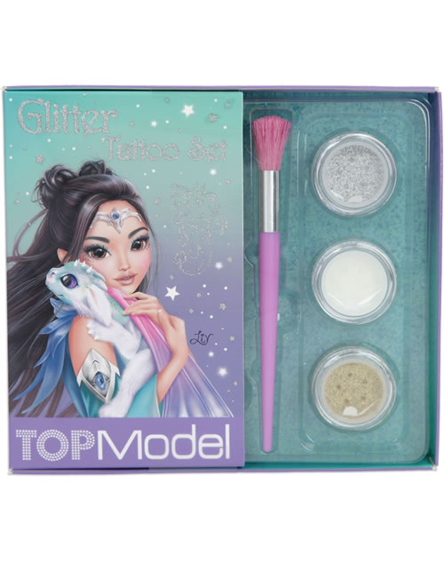 Contents: 51 tattoo stencils, 3 glitter powders, 1 brush, instructions.