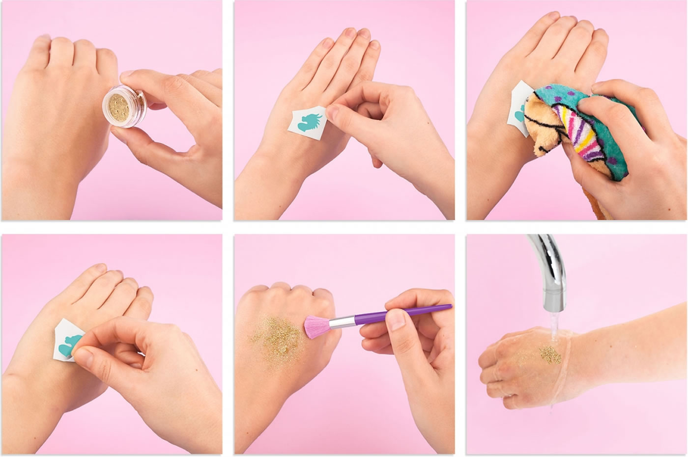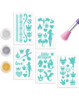 Design your own glitter tattoos! Chose from 51 designs and three glitter powders - snd create sparkling eye catchers on your skin.