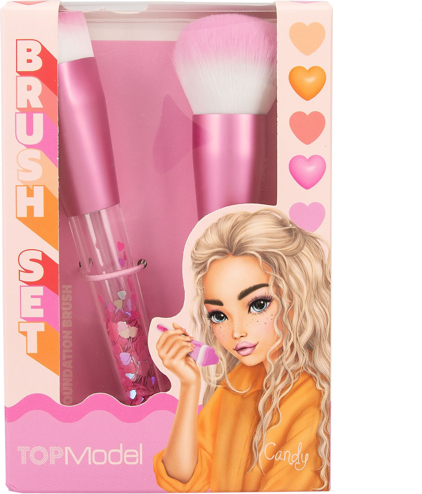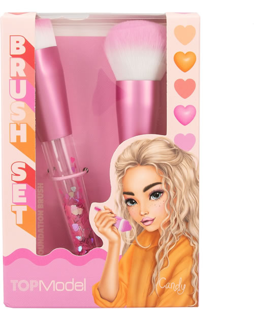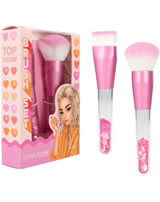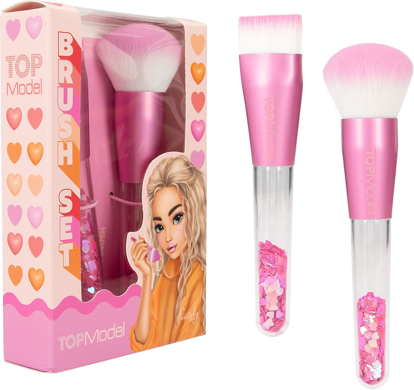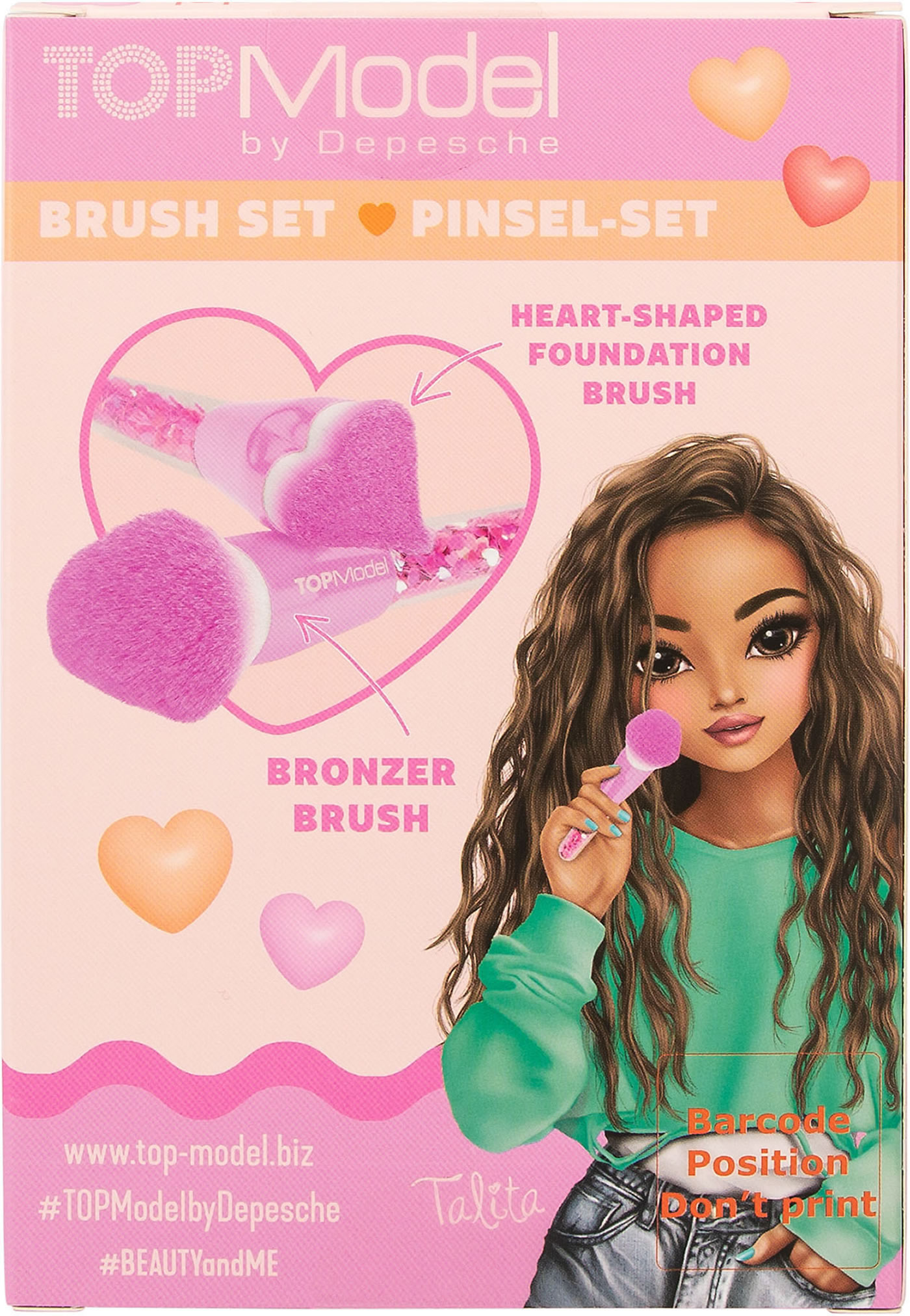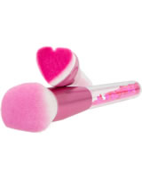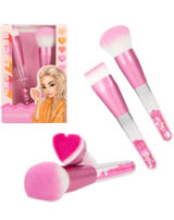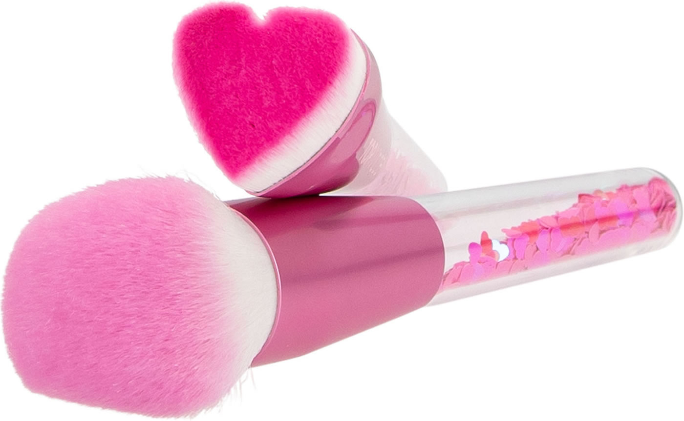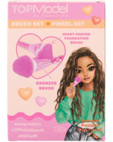Lovely brush set from TOPModel Beauty and ME: The soft white-pink brush hairs of the foundation brush form a cute heart shape. The brush hairs of the same color on the bronzer brush are gently rounded. Both brushes have transparent handles in which pink heart confetti moves fun back and forth.