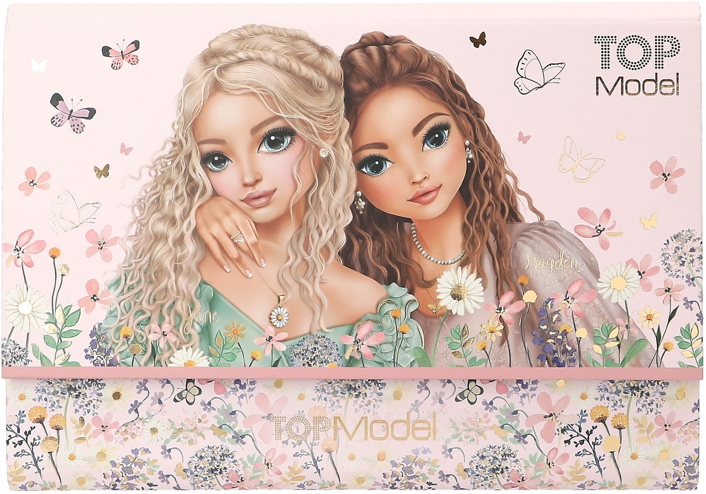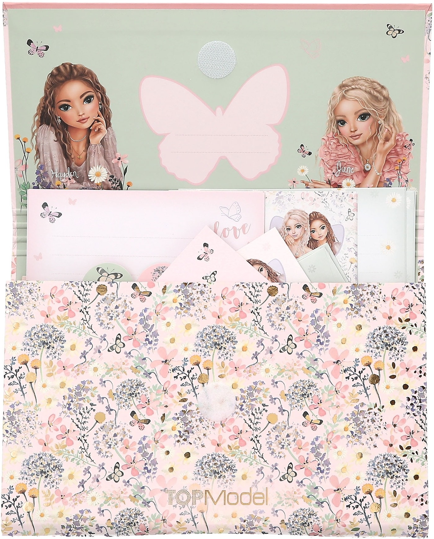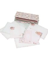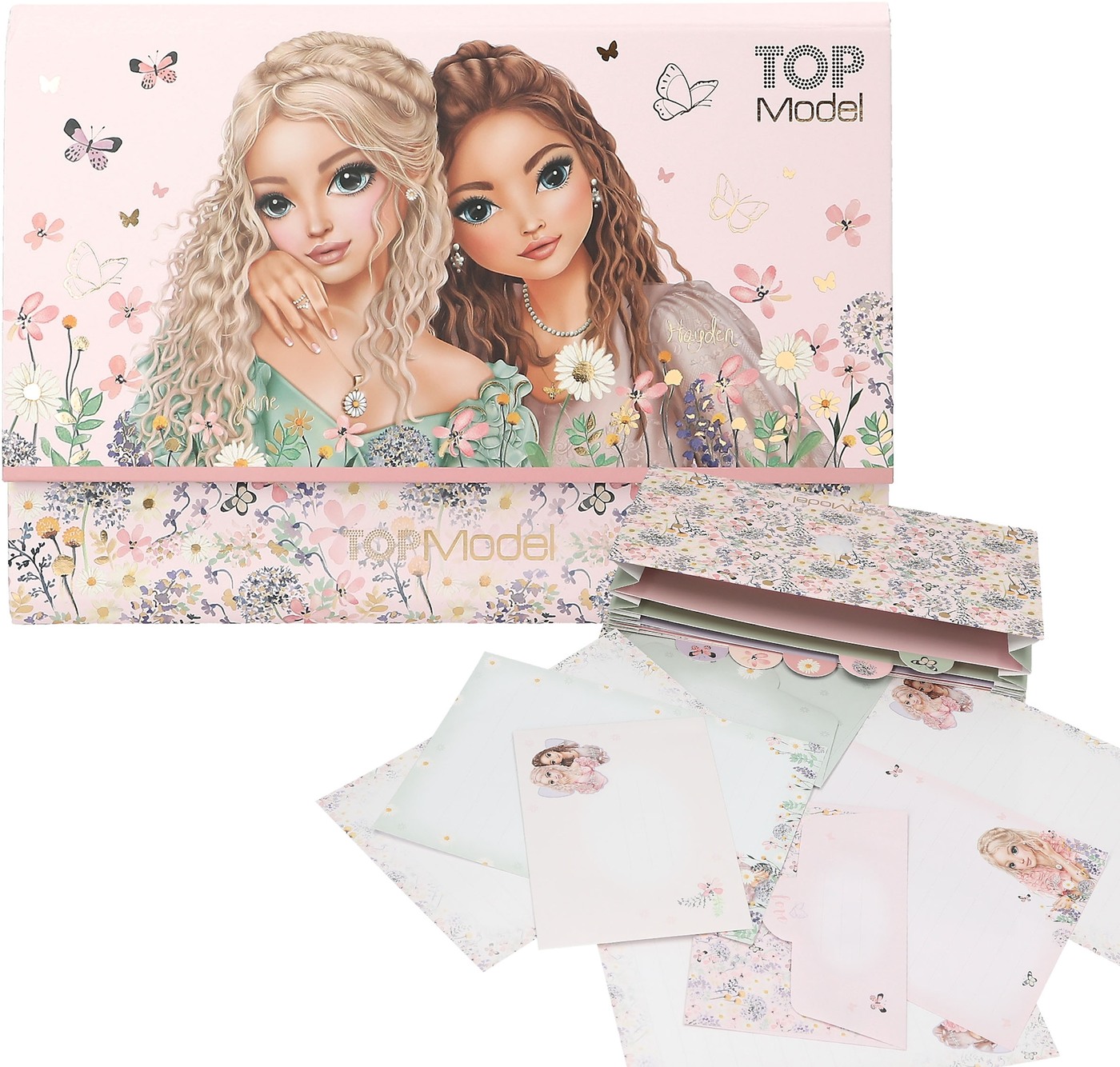 springlike, delicate colors, delicate flowers and butterflies, and beautiful TOPModels. The set includes 24 sheets of stationery