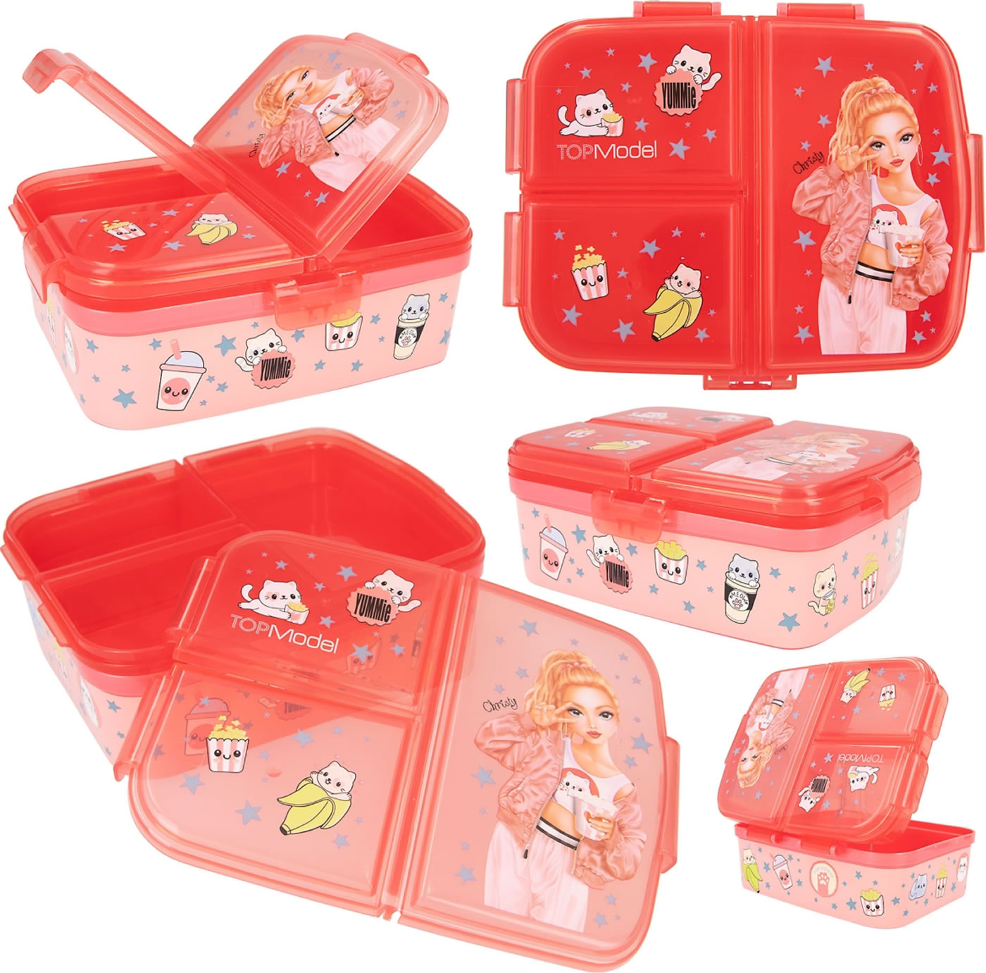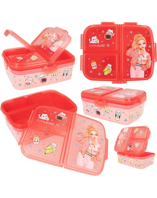 The coral-colored lunch box from the TOPModel Cutie Star series with a great model print and super cute cat icons has 3 separate compartments (2 small compartments, 1 large compartment) with a clip fastener. Due to the imprint, washing by hand is recommended.