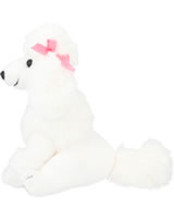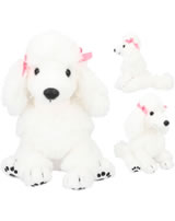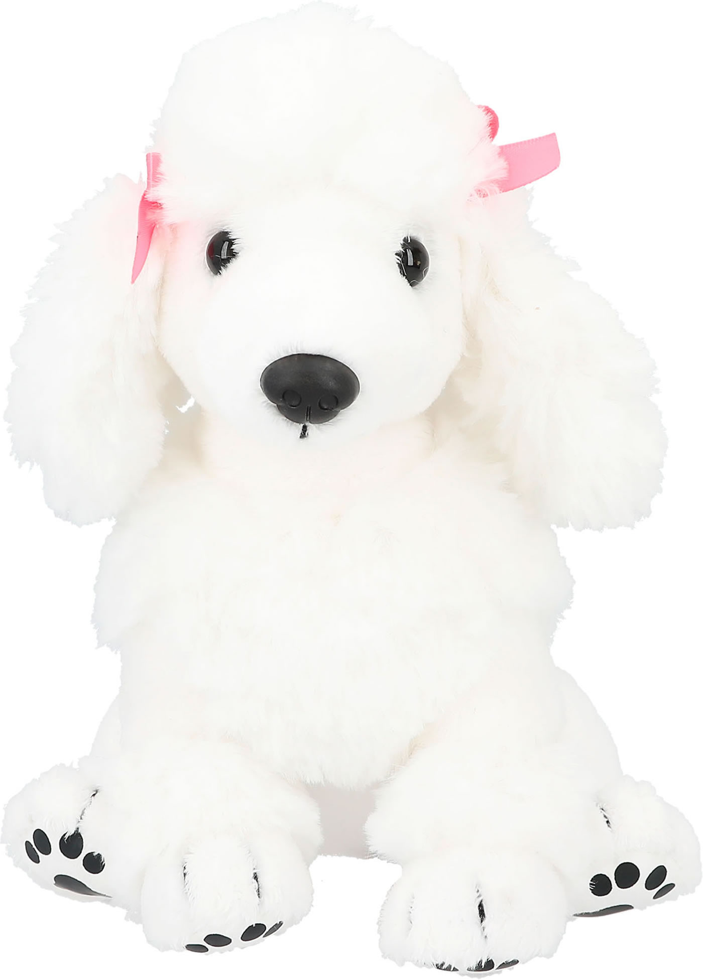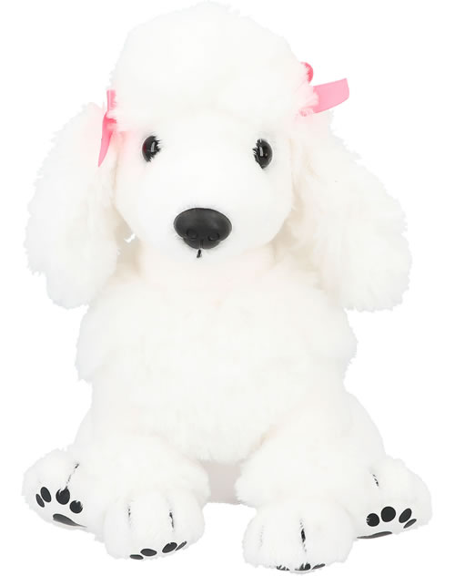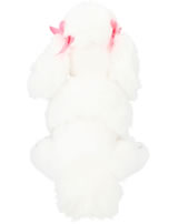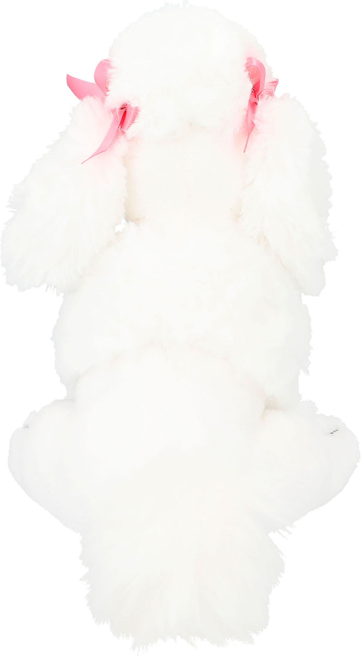 Super cute and cuddly soft: the white plush poodle Chanel has black button eyes and a pink bow on each ear.