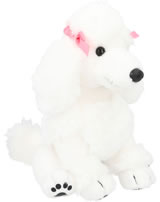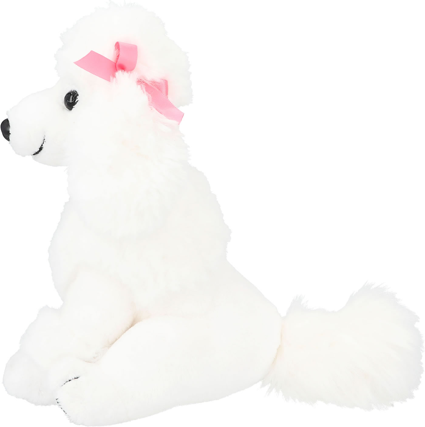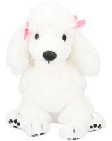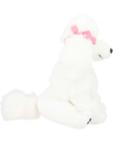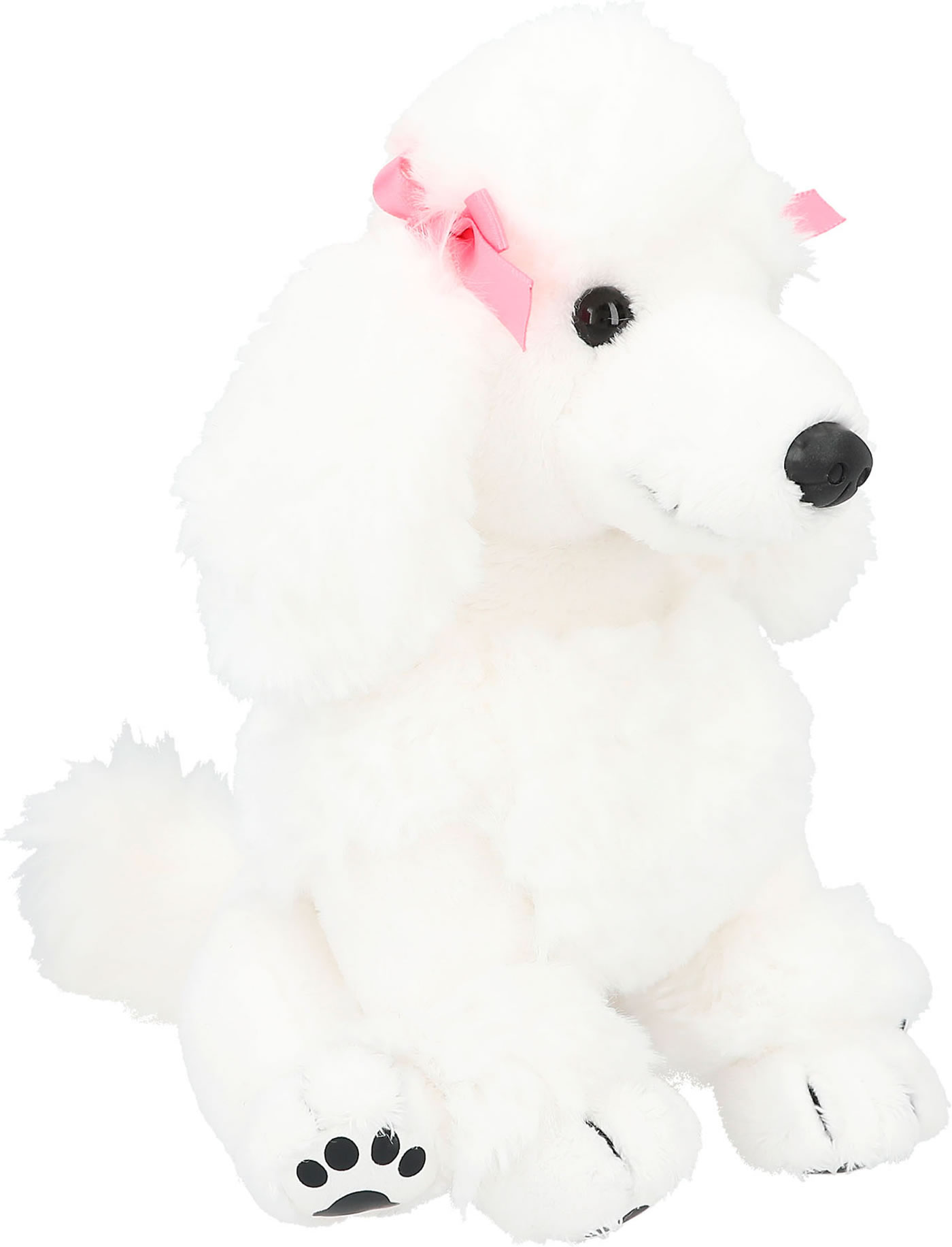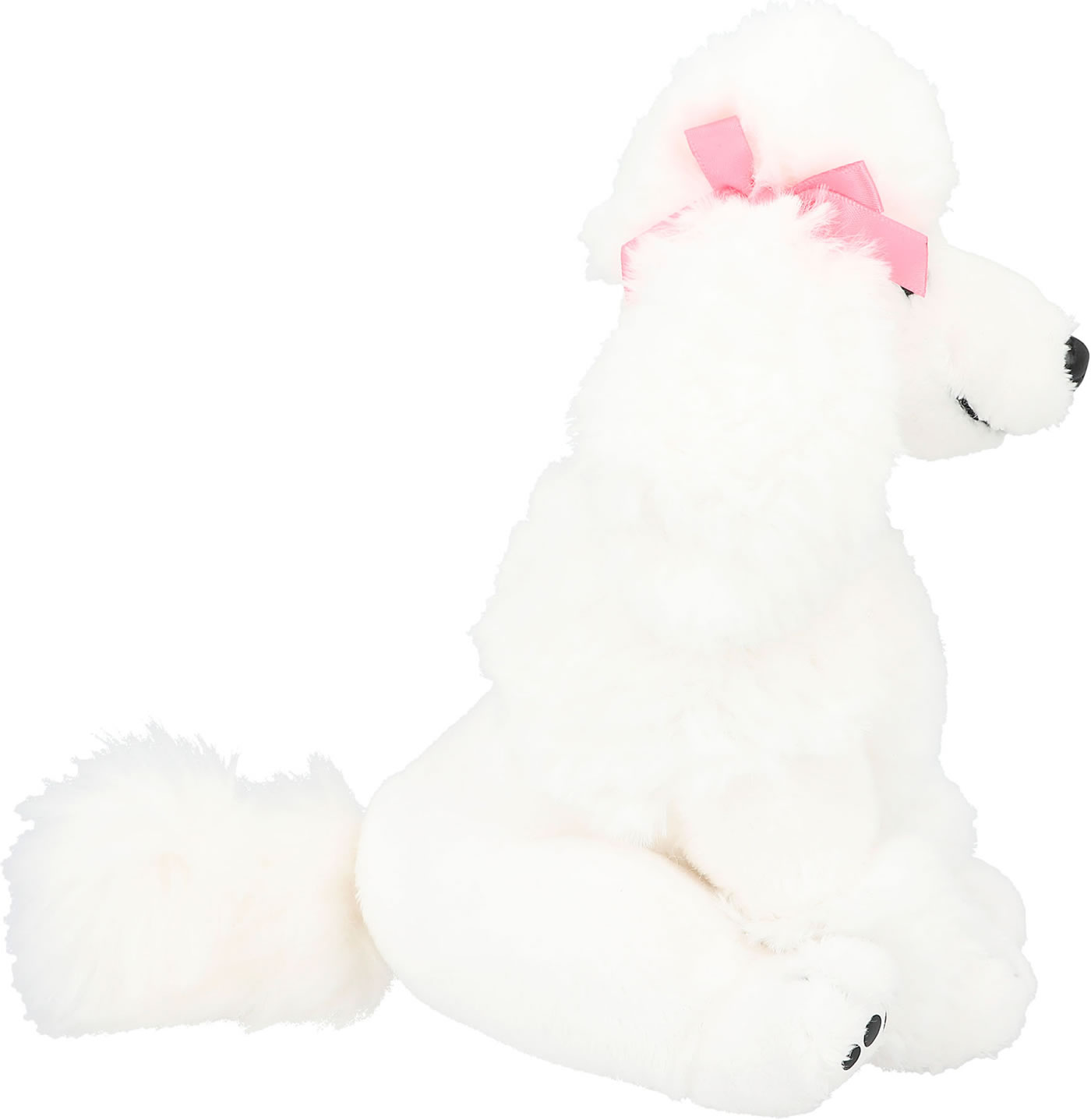 Super cute and cuddly soft: the white plush poodle Chanel has black button eyes and a pink bow on each ear.