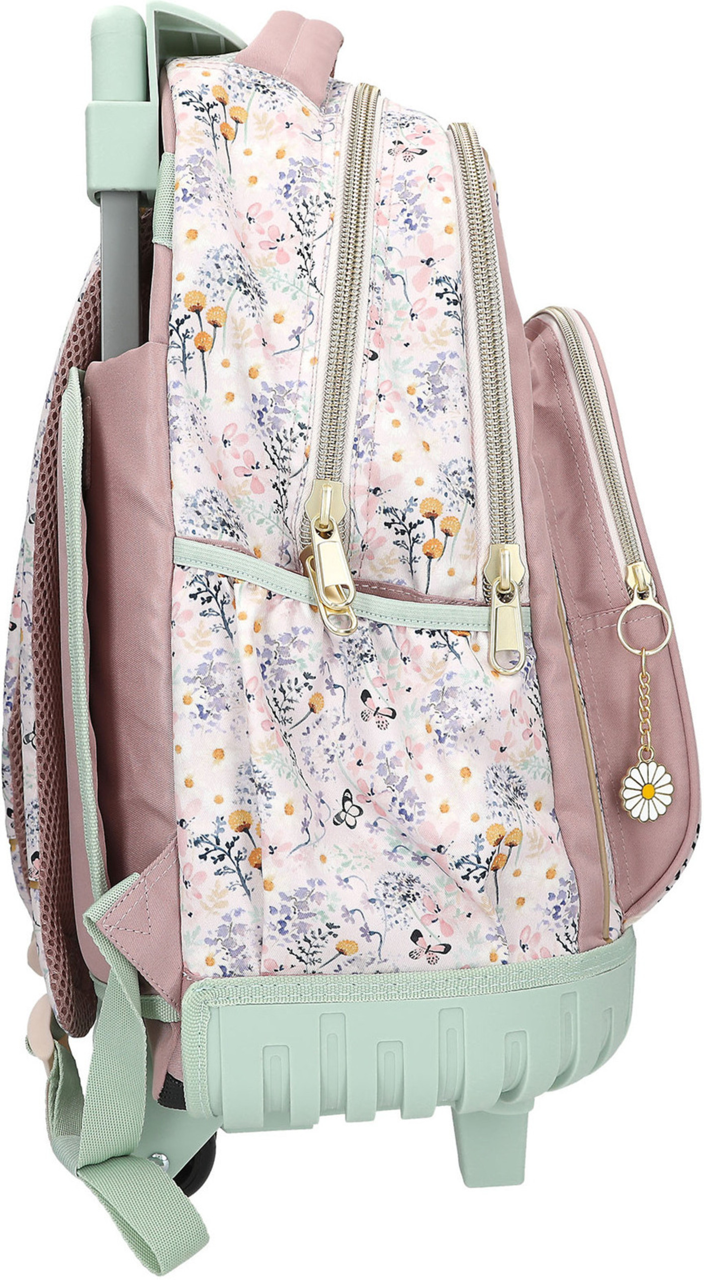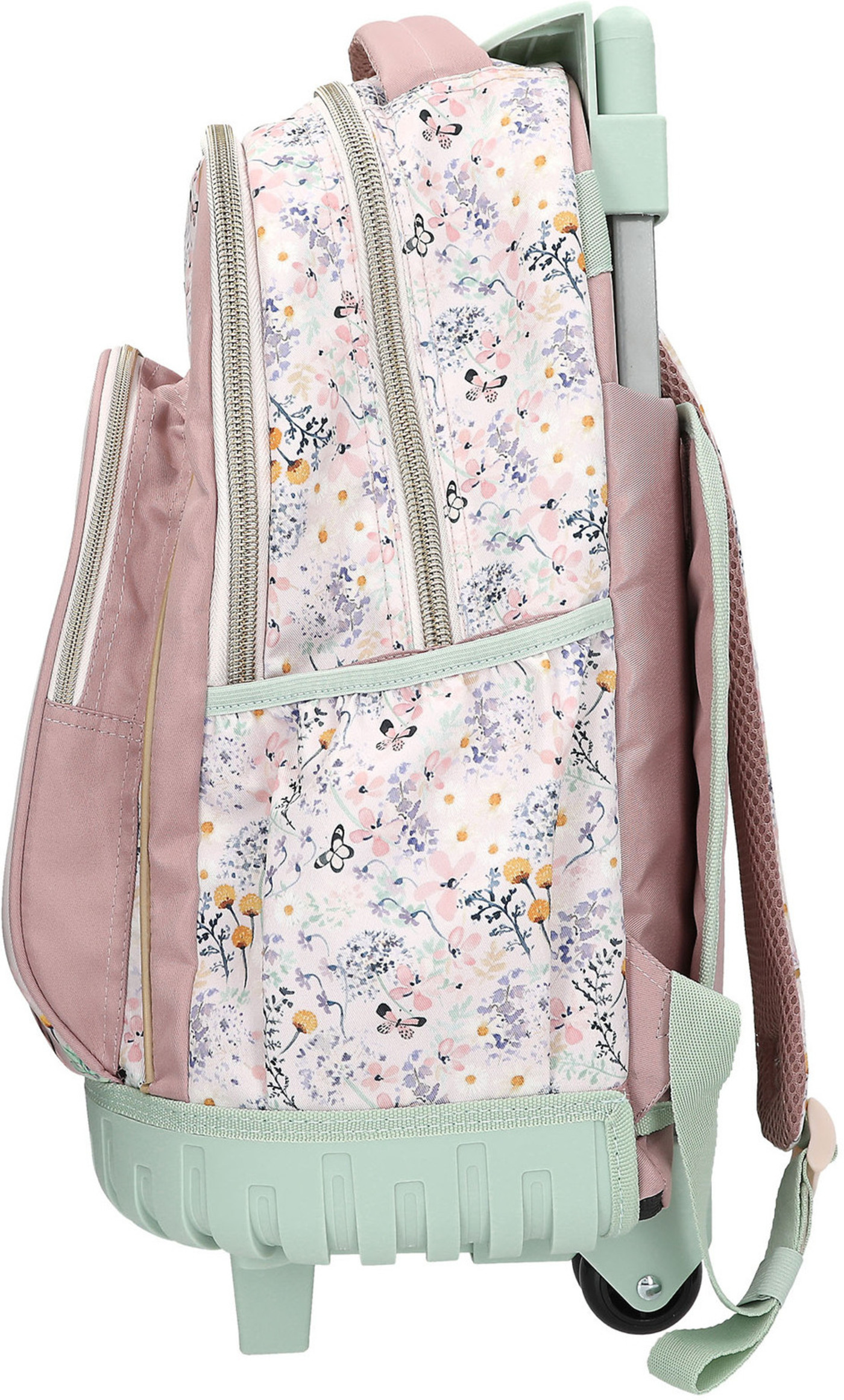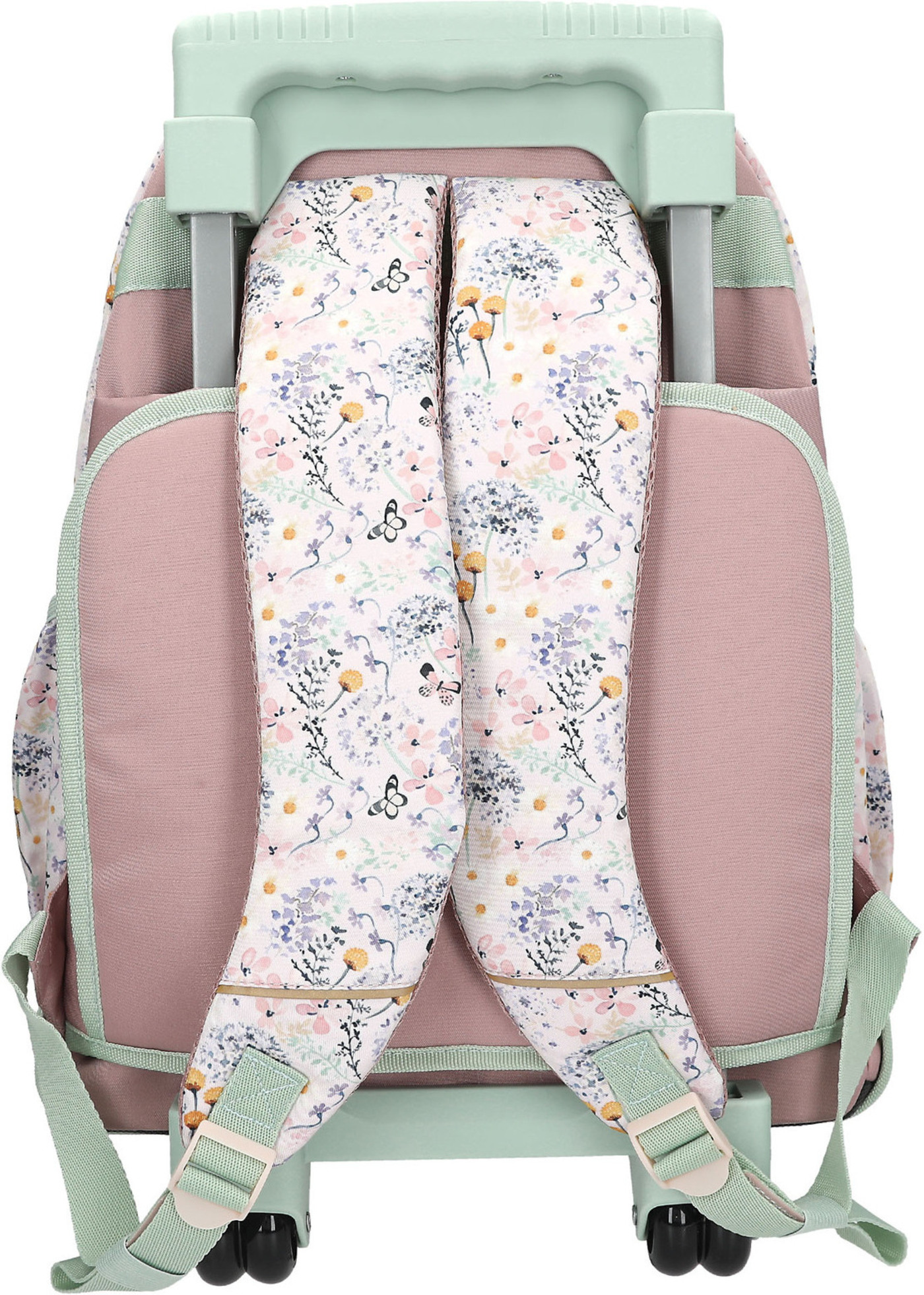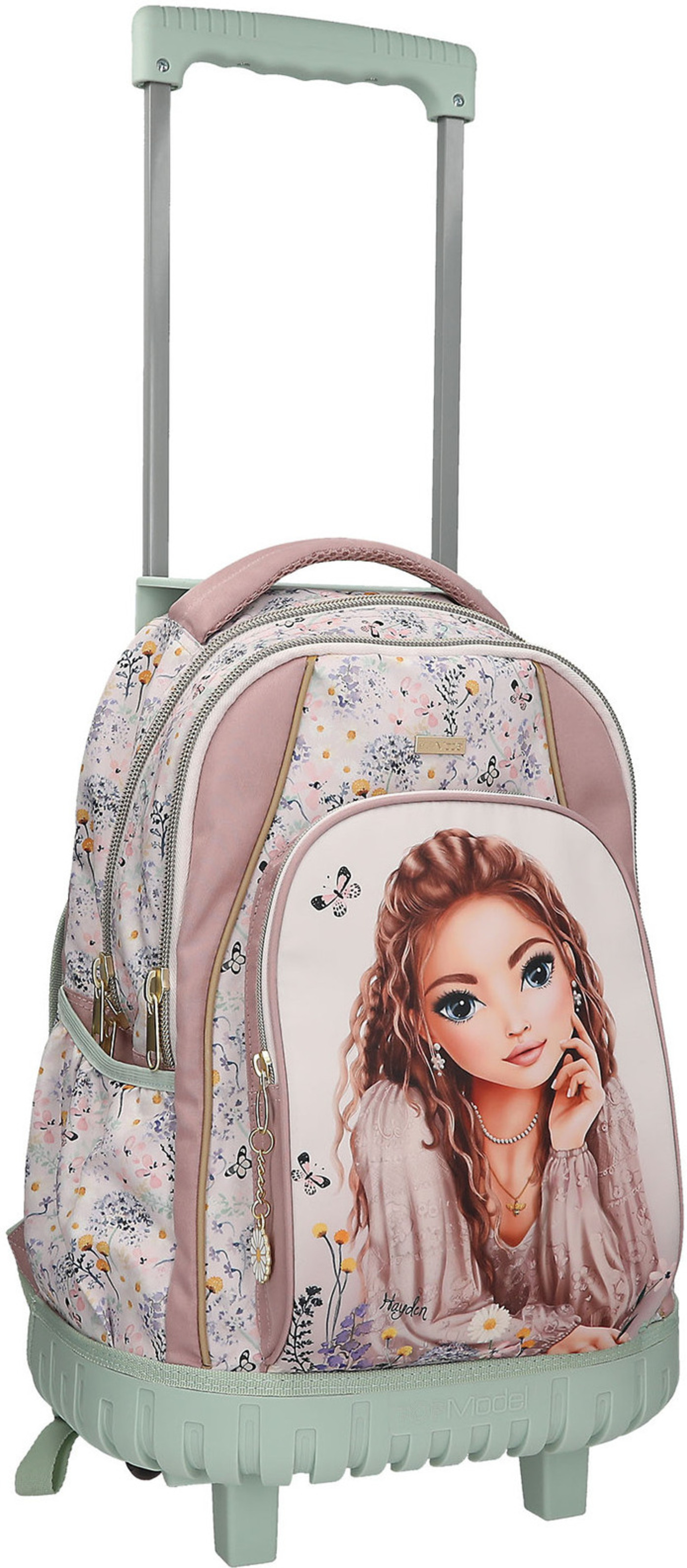 The TOPModel school backpack with integrated trolley features a large, romantic model motif on the front with delicate flowers and butterflies, which are also found on the side pockets and shoulder straps. It features soft pink tones and trendy sage green. A cute touch: the flower charm on the zipper. The trolley's telescopic handle extends to approximately 86 cm, and the wheels roll smoothly. When worn on the back, there's a back flap that can be slipped over the wheels to protect clothes from getting dirty. The three compartments and side pockets offer plenty of space (volume: 28 l) for school supplies and breakfast.