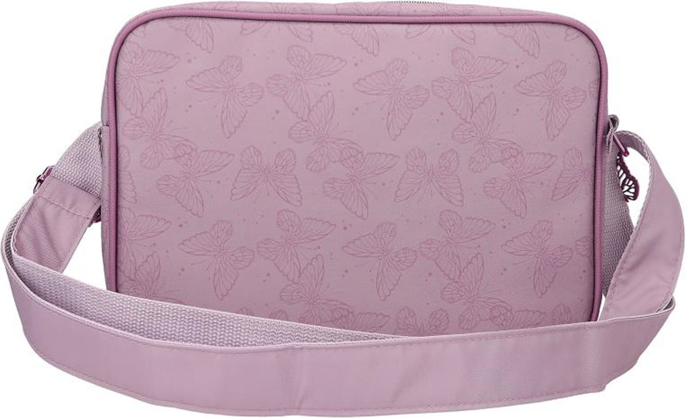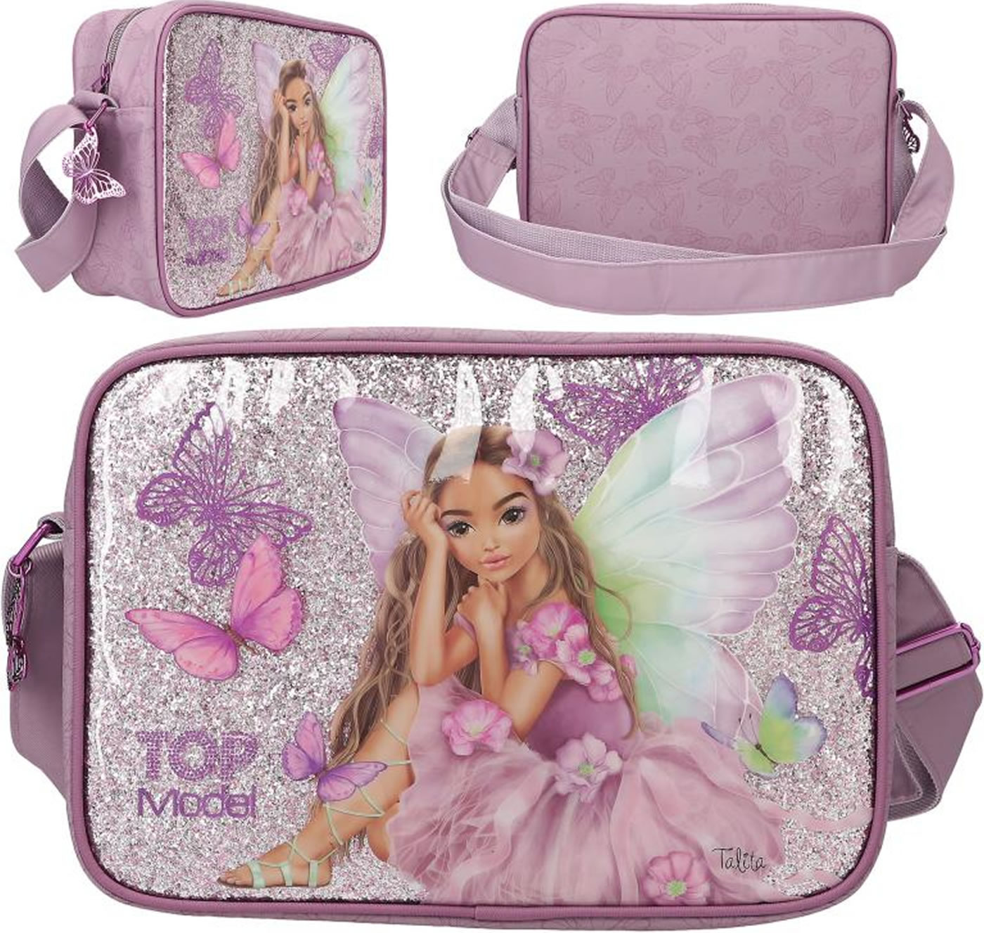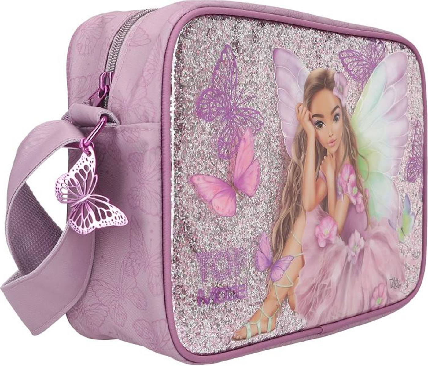 Fairy-fantastic! The mauve-colored TOPModel shoulder bag has a front completely lined with glitter and an imaginative fairy model motif. Fluttering all around: delicate butterfly prints. Pretty plus: the shimmering metal butterfly on the zipper. The length-adjustable carrying strap has a slight shine. With plenty of space in the spacious main compartment, an inside pocket with a zip and a separate slip pocket.