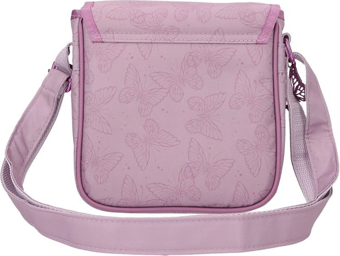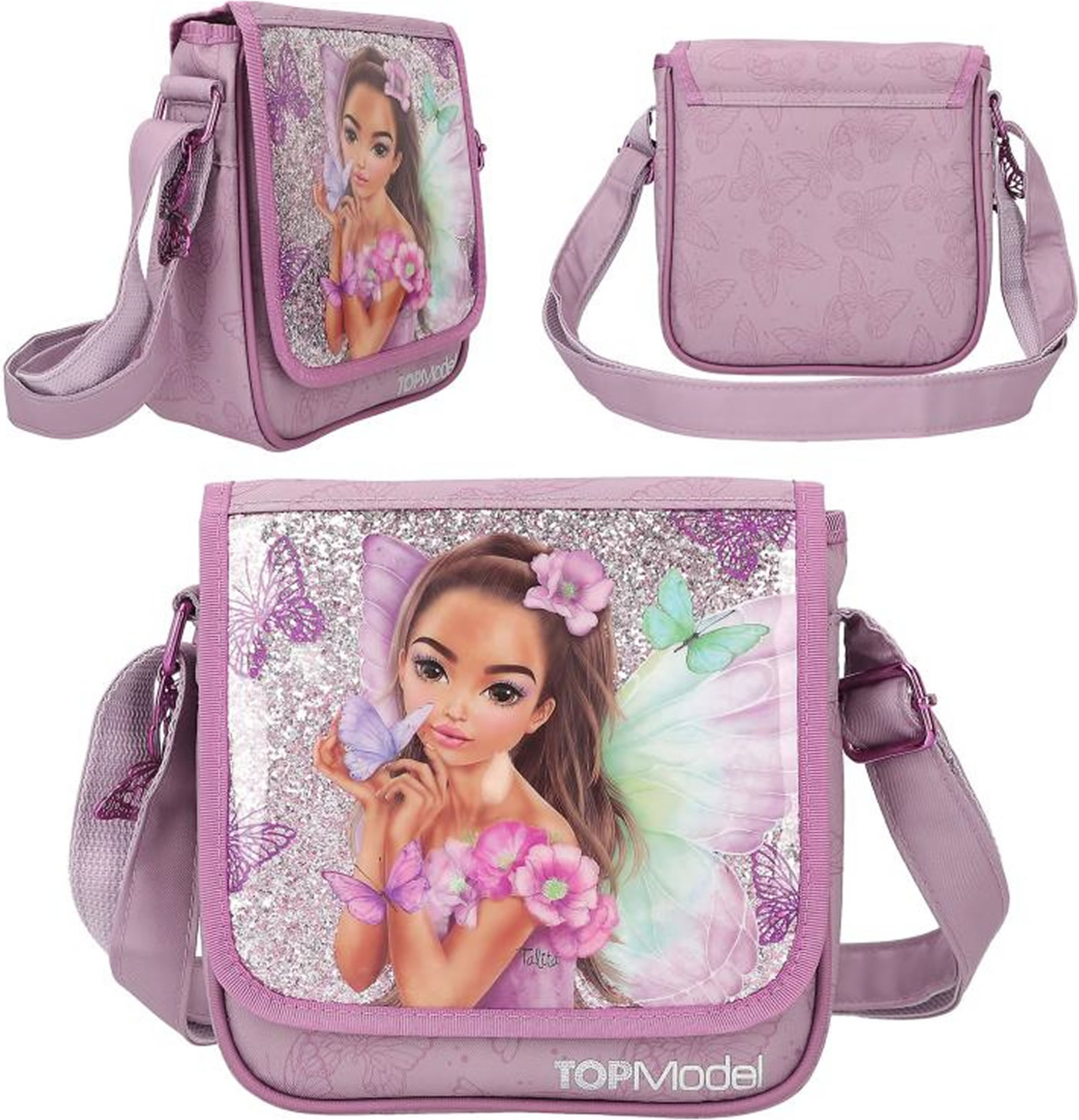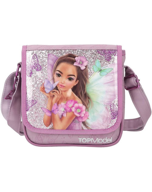 Fairy-fantastic! The small mauve-colored TOPModel shoulder bag has a front flap completely lined with glitter and featuring an imaginative fairy model motif. Fluttering all around: delicate butterfly prints. Pretty plus: the shimmering metal butterfly pendant. The length-adjustable strap has a slight shine and the flap has a practical magnetic closure. With a spacious main compartment and an extra inner pocket.
