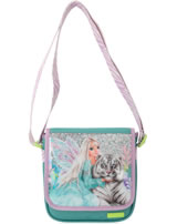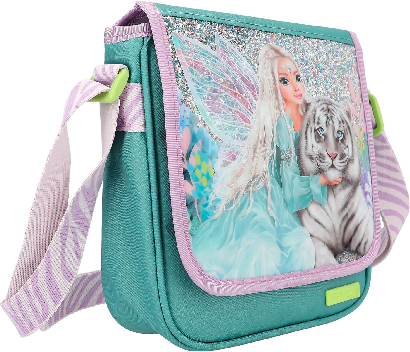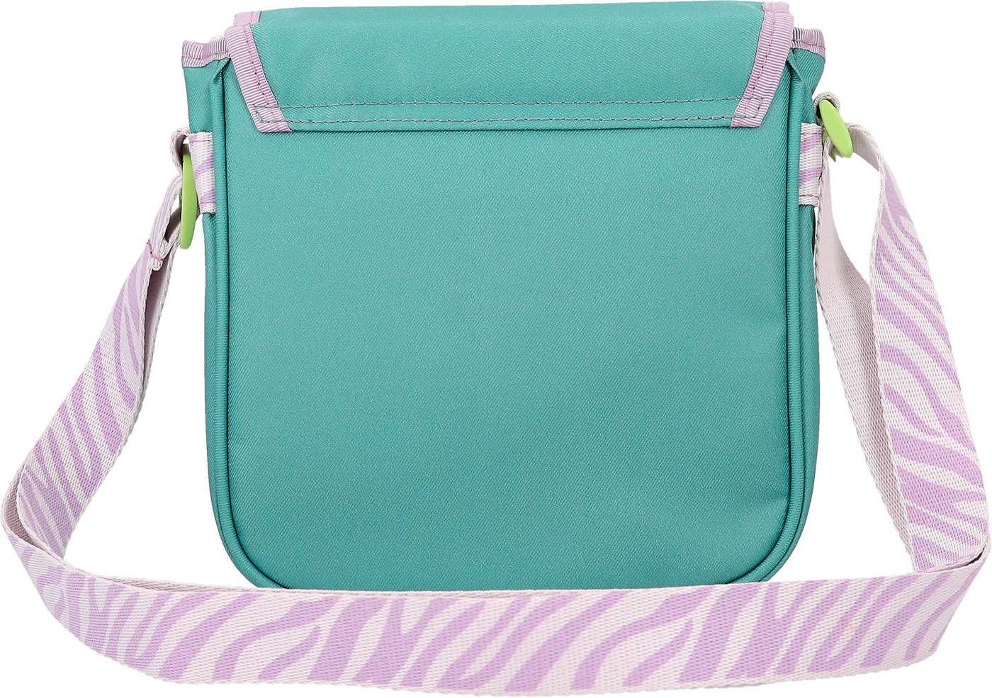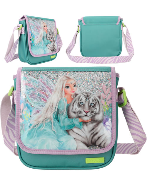 The small TOPModel shoulder bag in great petrol and lavender tones and with lime-green details has a super glittery front with a cool TOPModel tiger motif. The shoulder strap printed with tiger stripes is adjustable in length. The flap has a magnetic closure and in the main compartment there is a separate inner pocket with a zip
