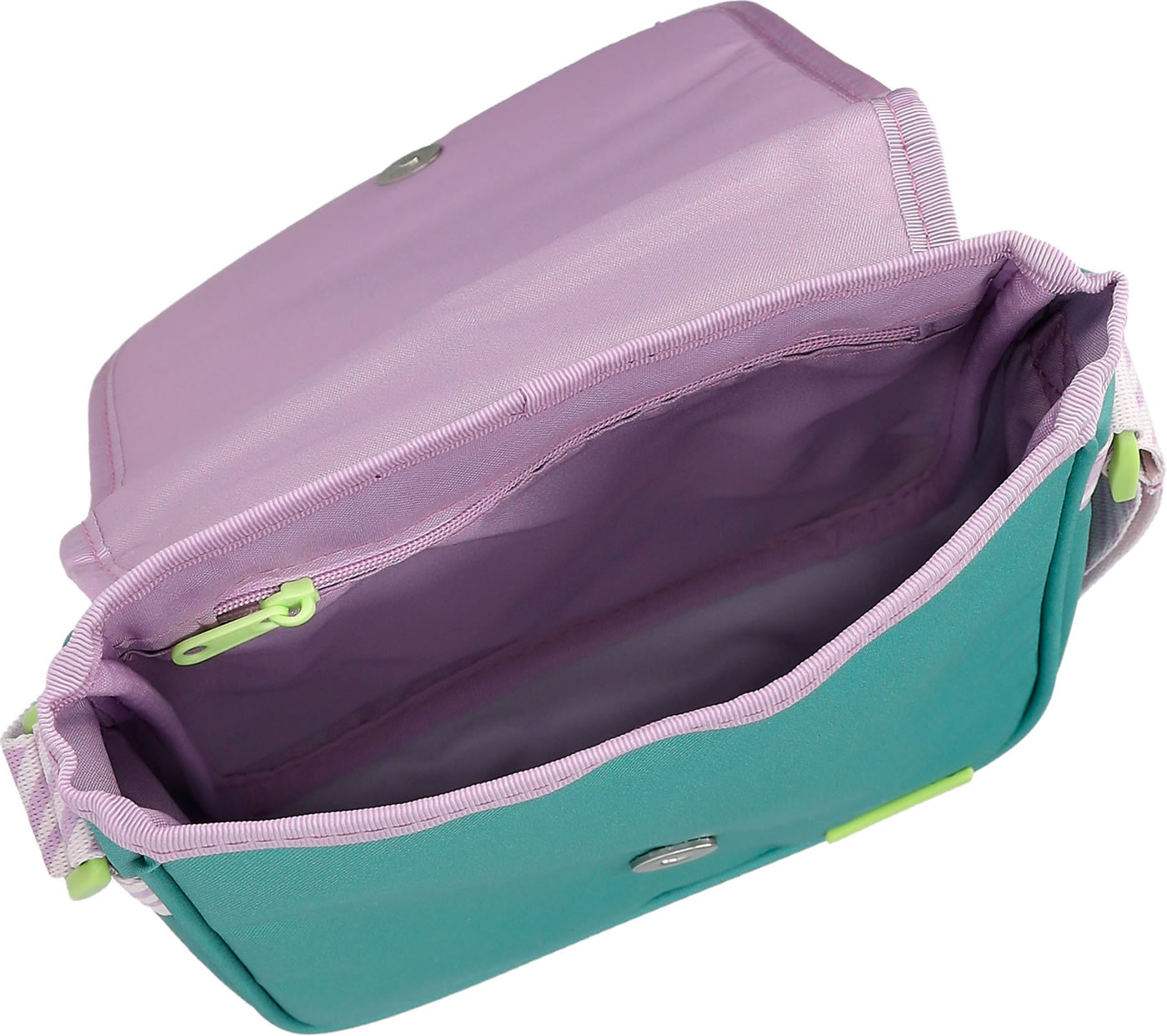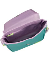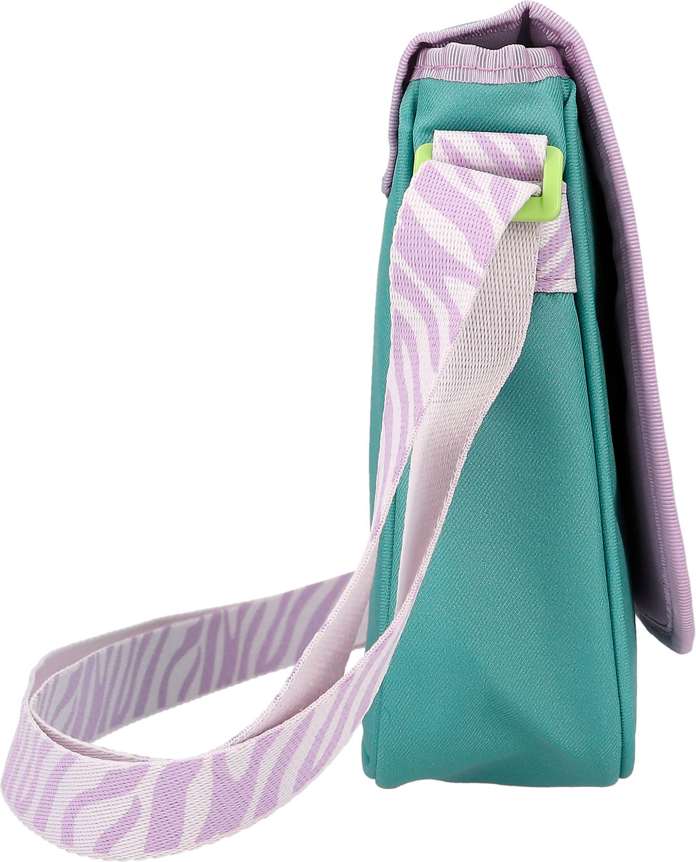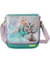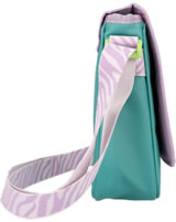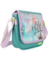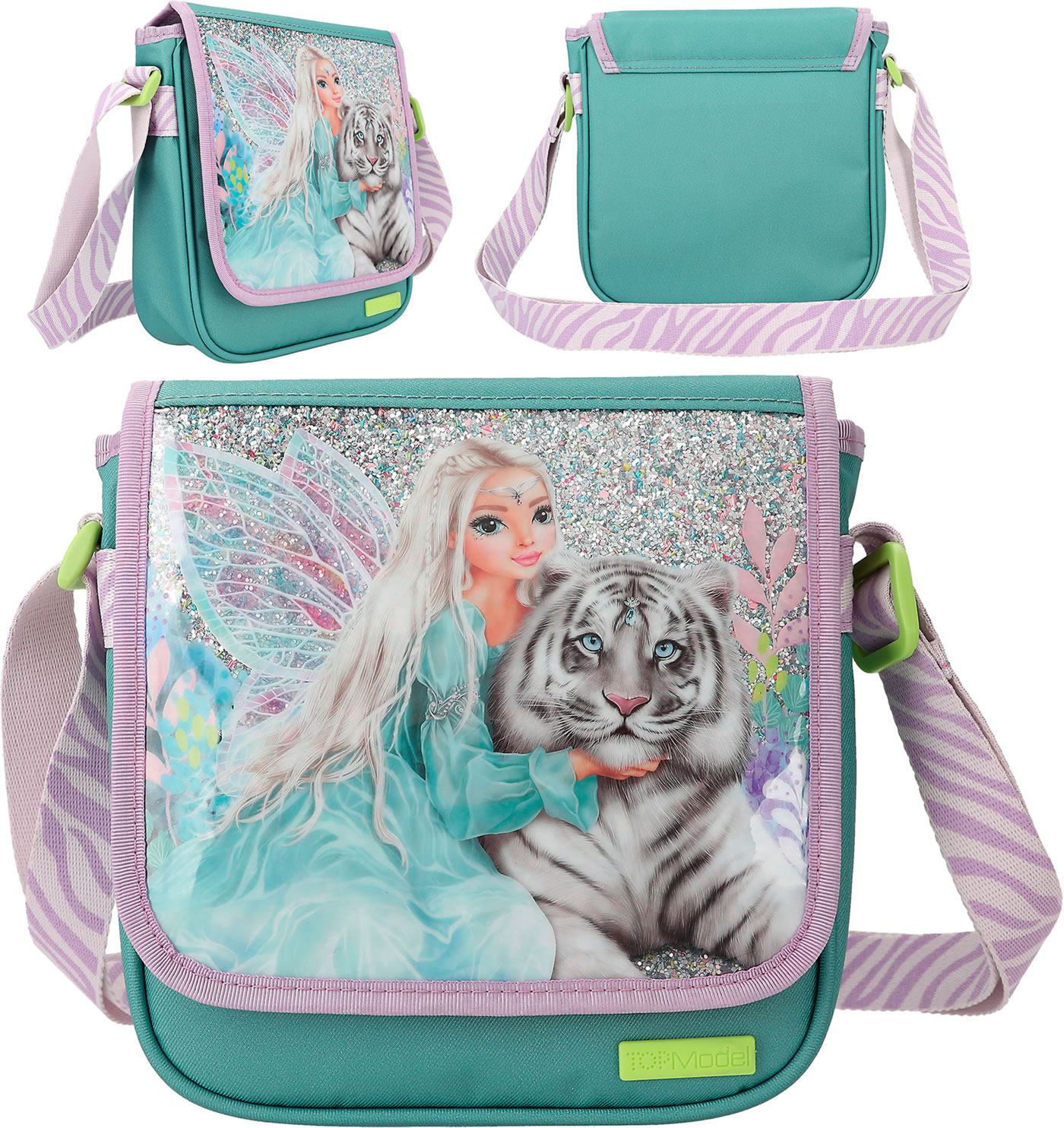 The small TOPModel shoulder bag in great petrol and lavender tones and with lime-green details has a super glittery front with a cool TOPModel tiger motif. The shoulder strap printed with tiger stripes is adjustable in length. The flap has a magnetic closure and in the main compartment there is a separate inner pocket with a zip