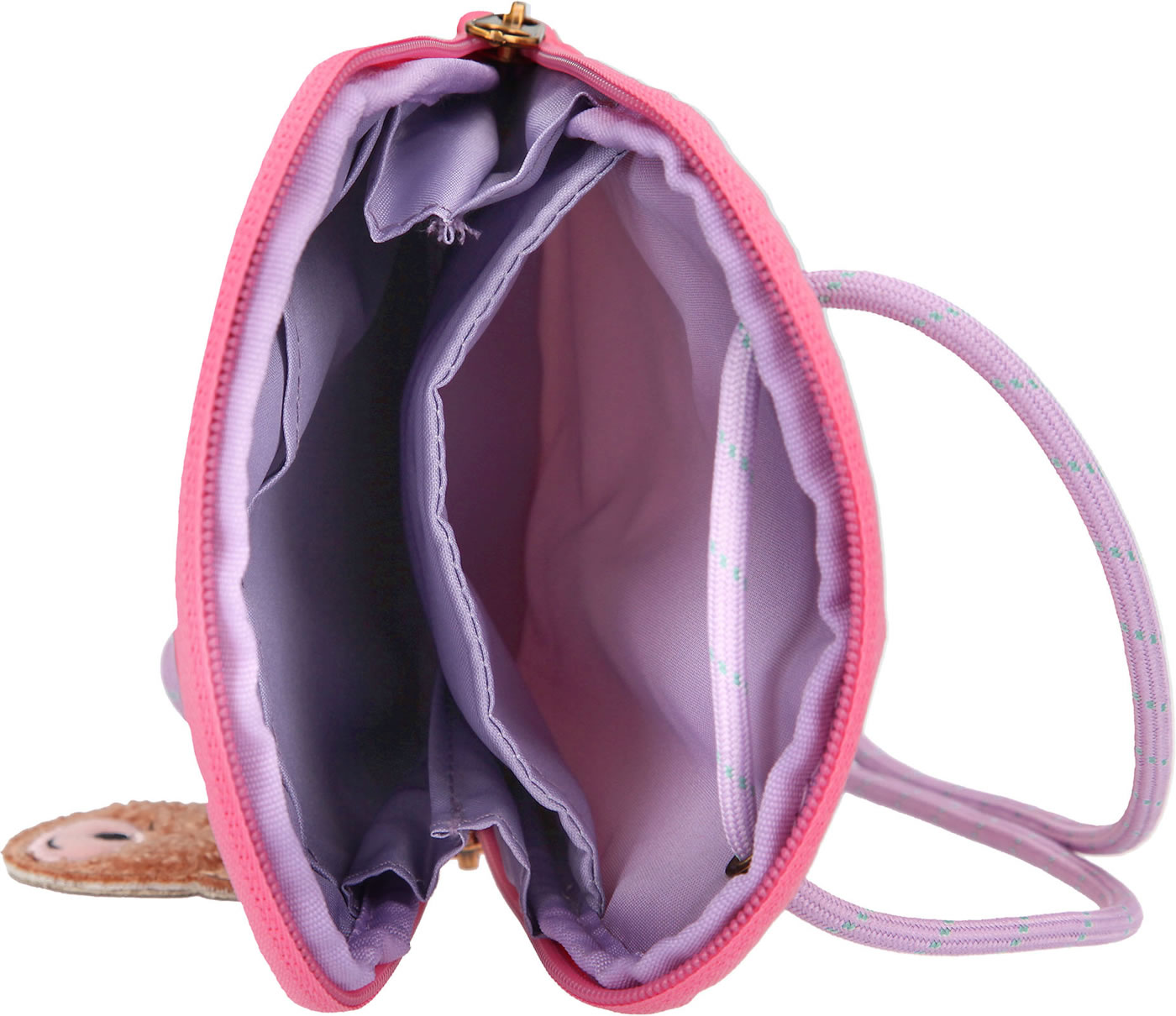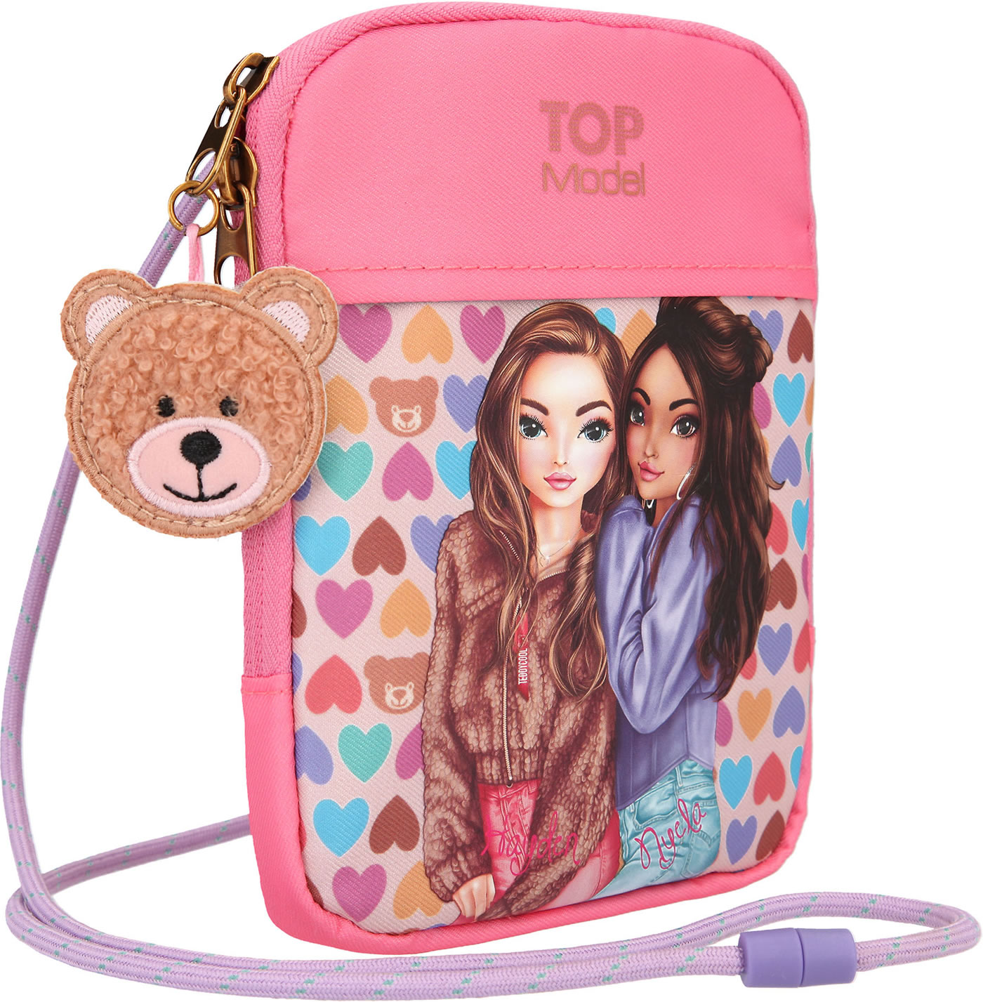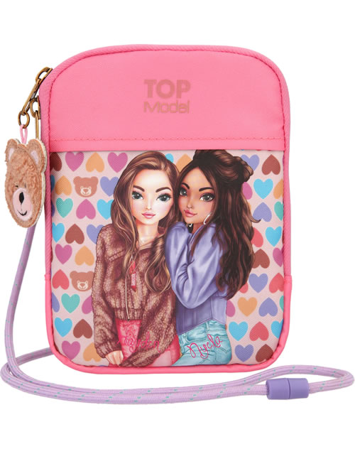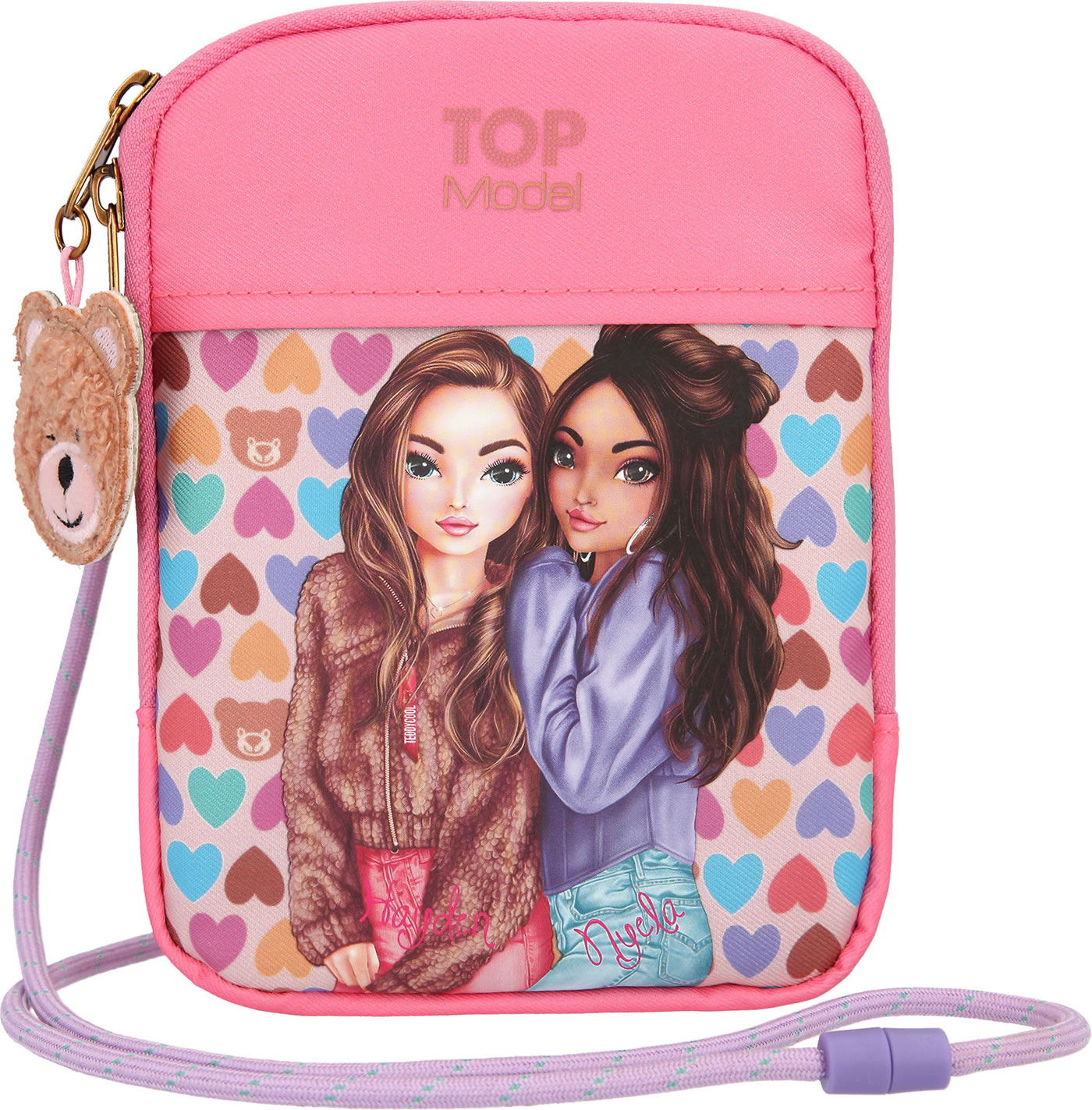 An eye-catcher is the front with hearts and the TOP models Hayden and Nyela. The bag has a zipped compartment with three inner compartments and a cord for hanging. A great detail is the teddy pendant.