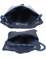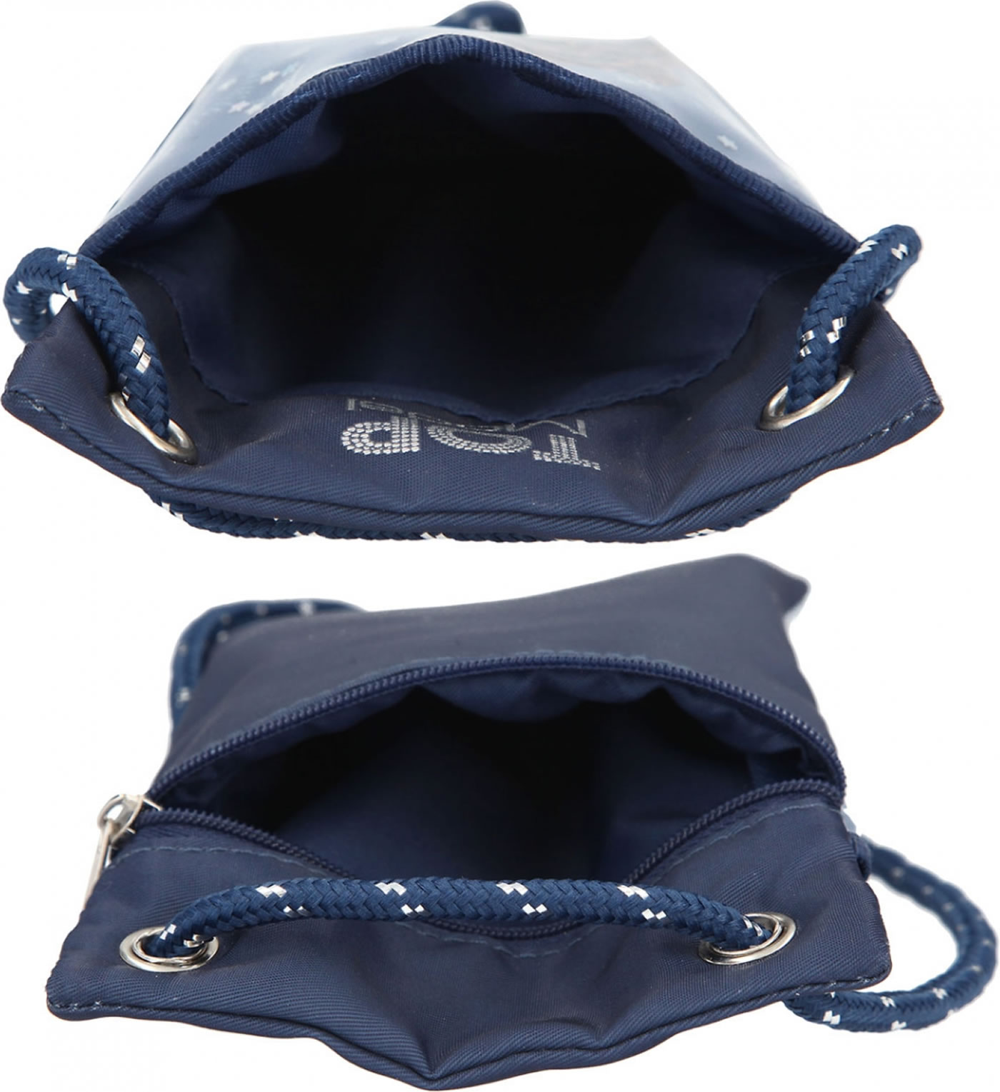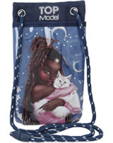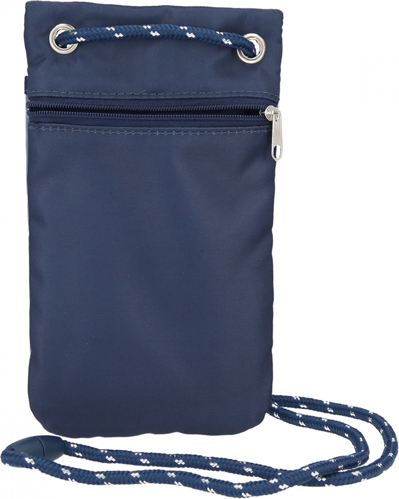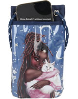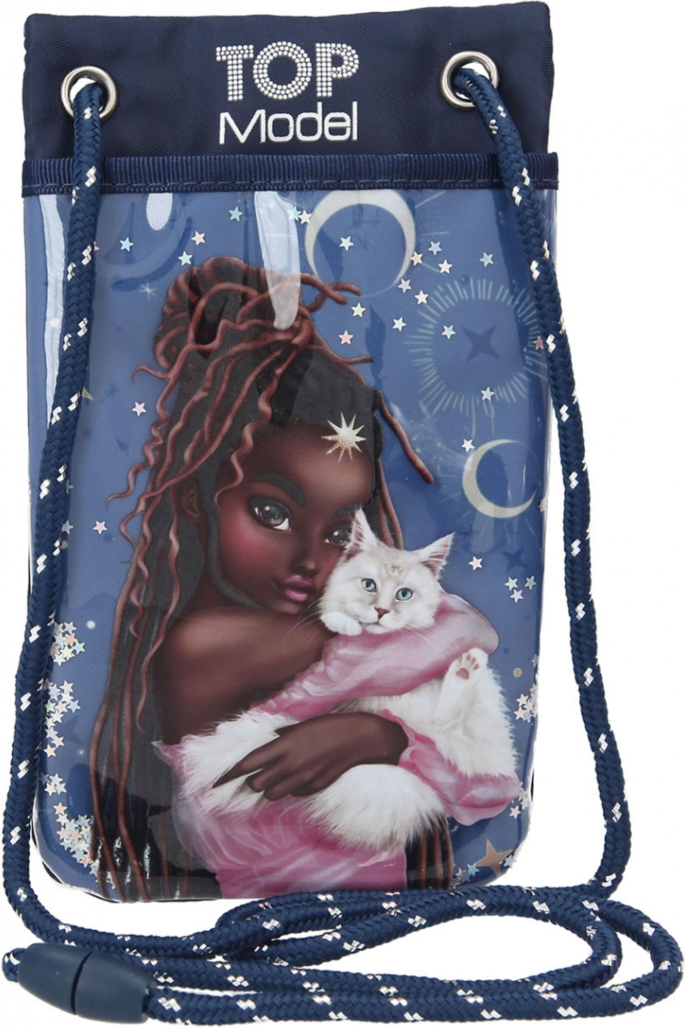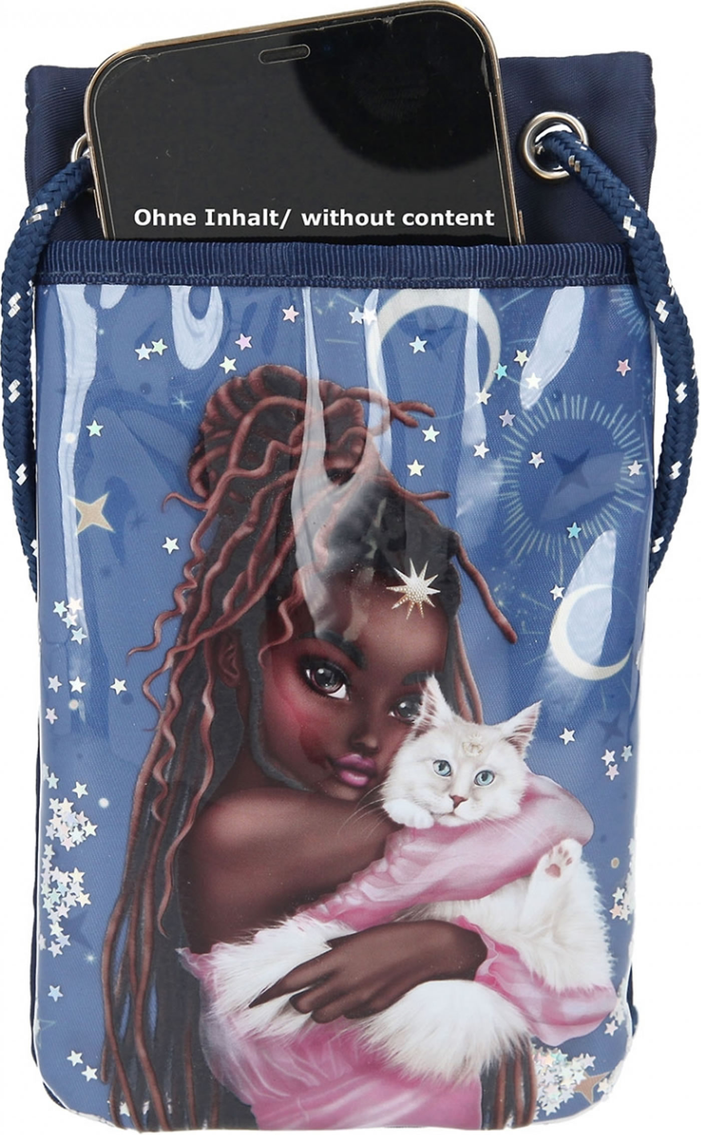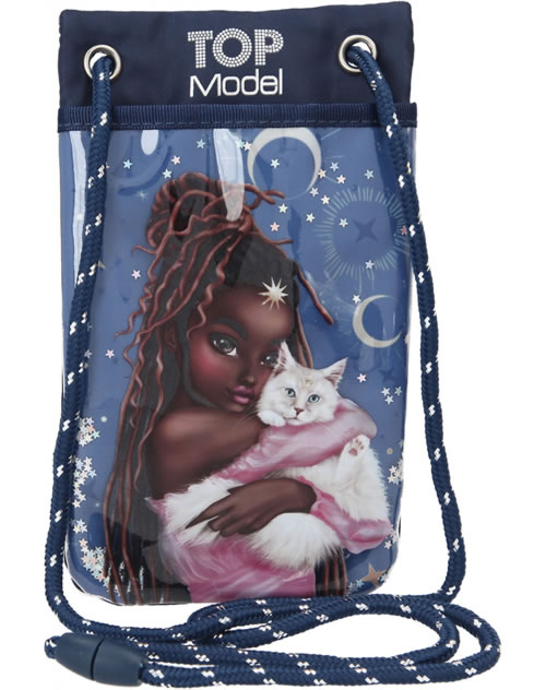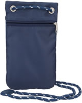 Most popular cell phone sizes fit in this bag. With the ribbon it can be worn around the neck.