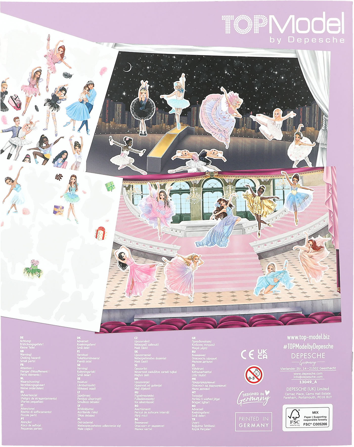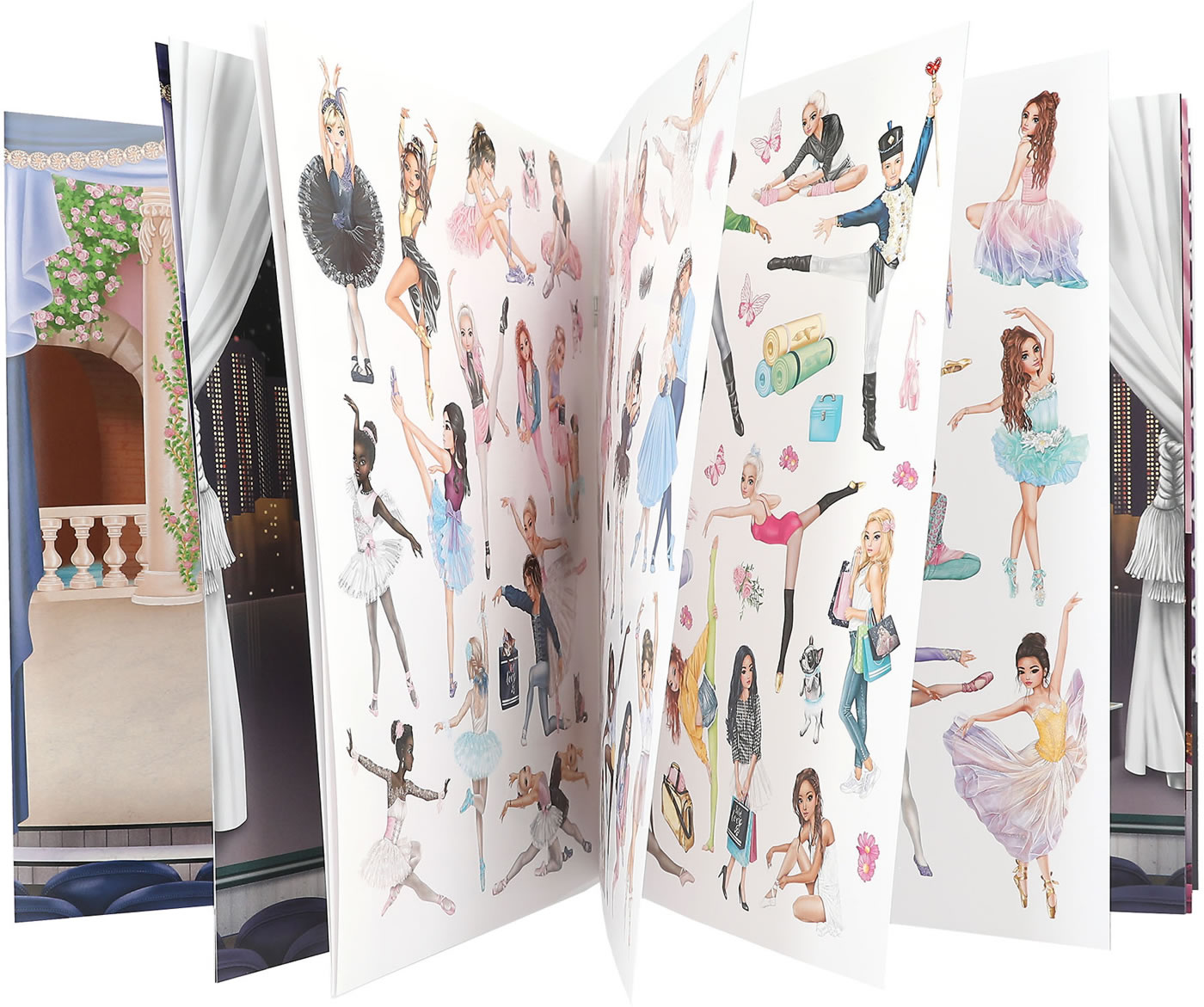 TOPModel's ballet sticker world is all about dancing: 20 beautifully illustrated background pages and 3 double pages full of clothing and accessories stickers.