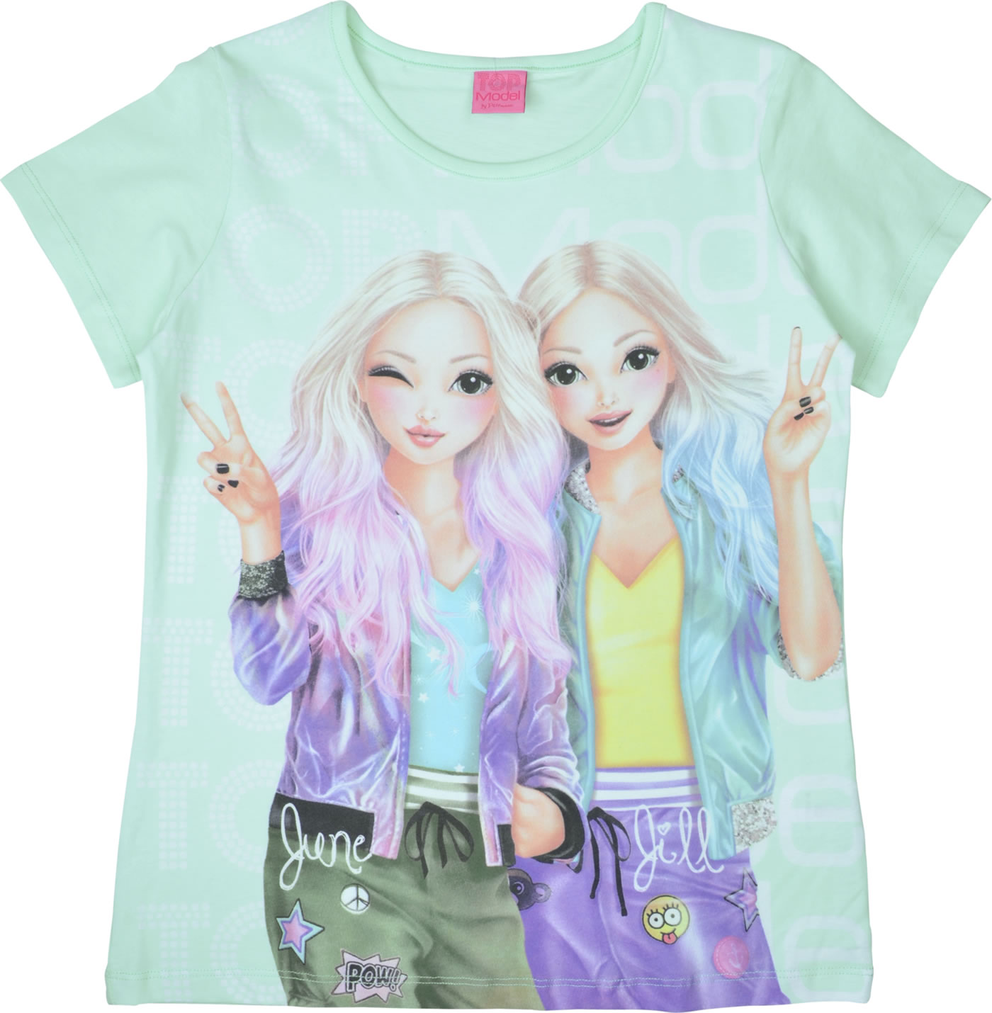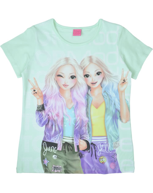 Summery short-sleeved shirt in green by TOPMODEL with models June and Jill on the front.