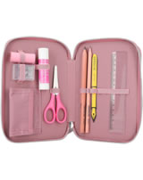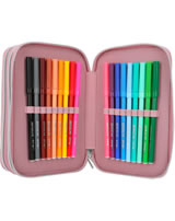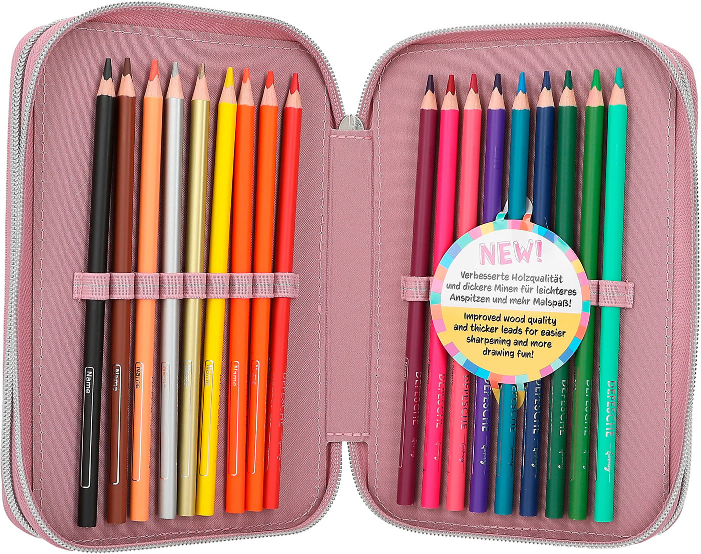 Glitter, glamor, ingenious: The 3-compartment pencil case from TOPModel with lots of delicate rosé has a large model motif on the front completely backed with glitter and, as a sweet highlight, a small press-stud pocket made of glitter fabric as a zipper pendant. The three separate compartments are completely filled with 18 colored pencils and felt-tip pens, 2 pencils, sharpener, eraser, ruler, scissors, glue stick and a small Velcro bag.