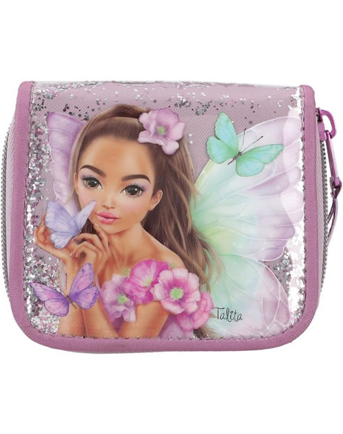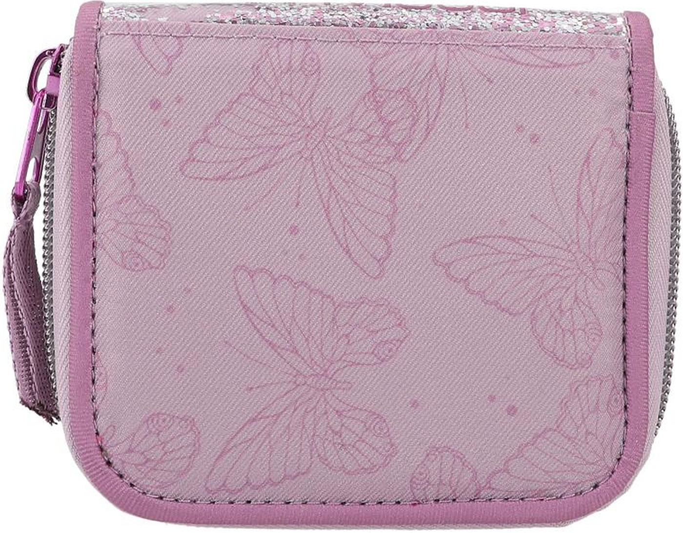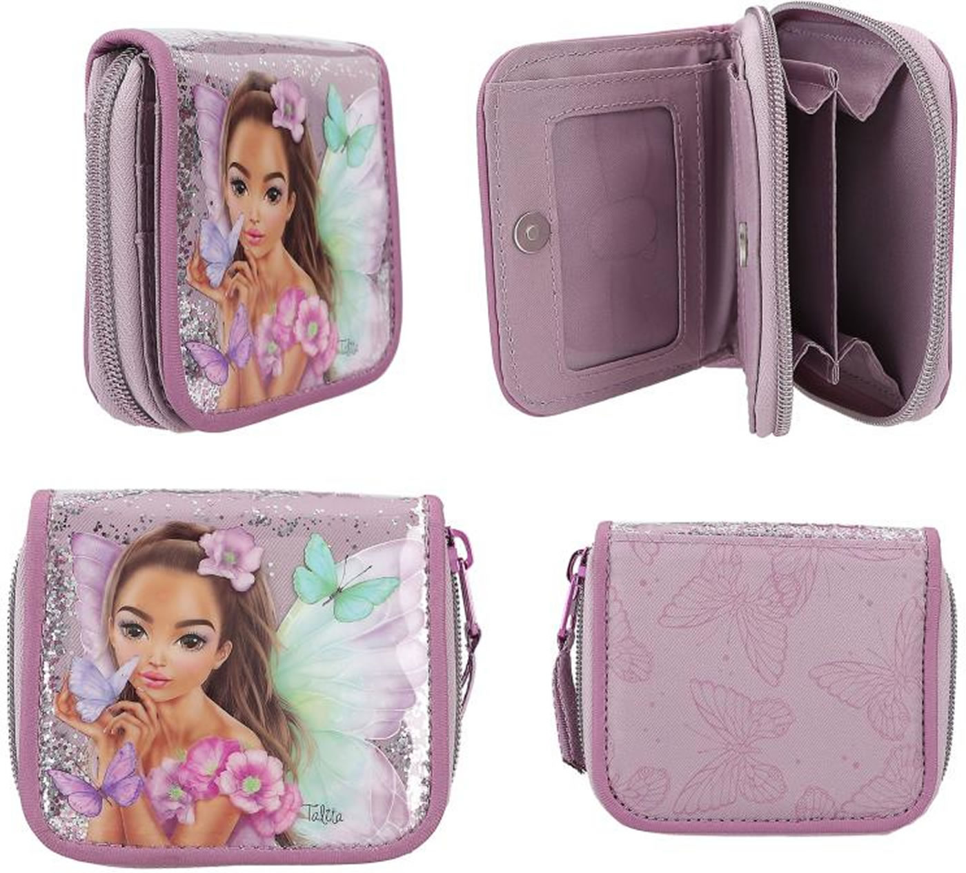 Fairy-fantastic! The mauve-colored TOPModel wallet has a front completely lined with glitter and an imaginative fairy model motif. Fluttering all around: delicate butterfly prints. With snap fastener and zipper as well as compartments for coins, notes and cards (including name card compartment with transparent window).