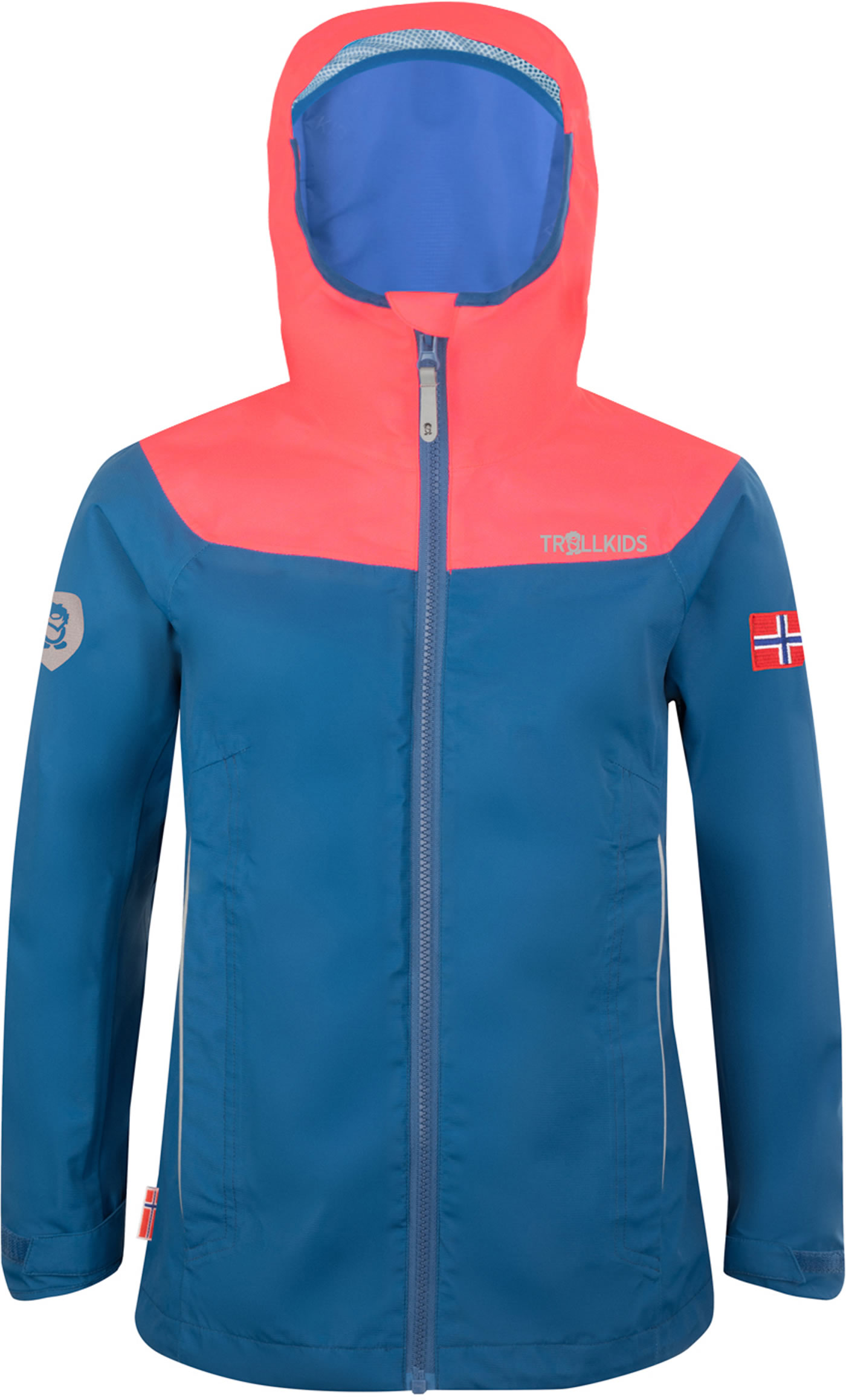 The GIRLS BERGEN JACKET by TROLLKIDS is a waterproof and breathable lightweight rain jacket with a pack-away function: the jacket can be folded up and stowed away in a special pocket next to the front zip, so that it hardly takes up space in a backpack or schoolbag. The cut, adjustable hood and shoulder area are contrasted in color, and the most important little things can be safely stowed away in two hip pockets with zippers.