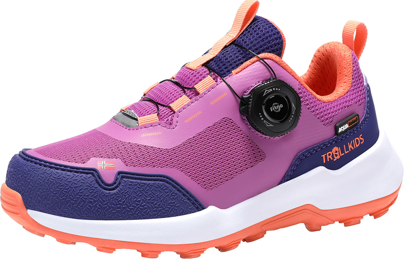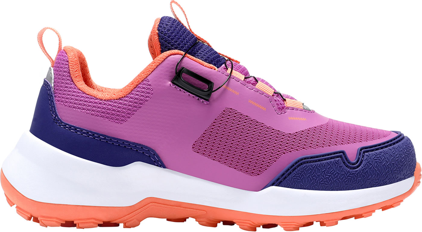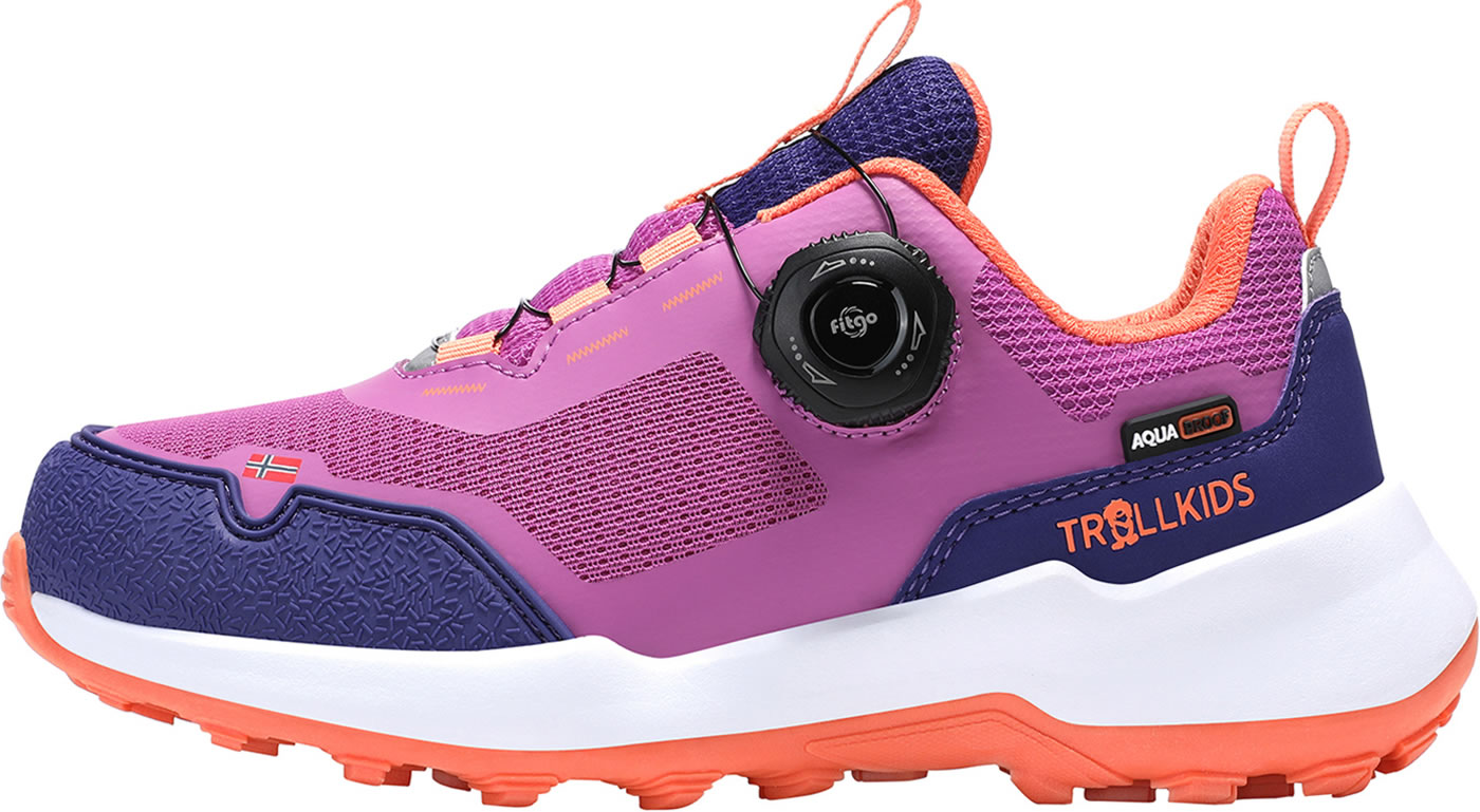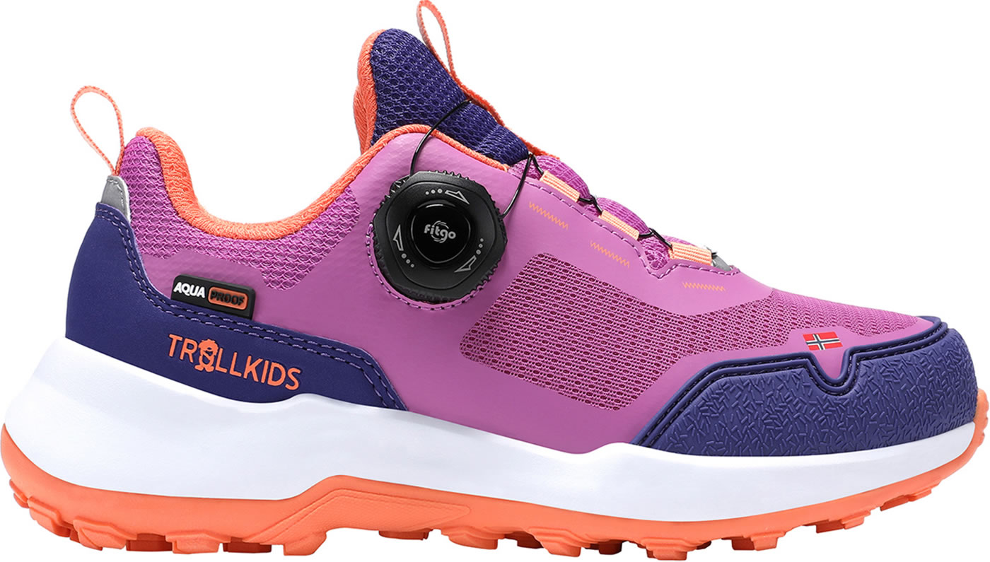 The KIDS TROLLFJORD HIKER LOW is a sporty, lightweight all-round shoe. Thanks to its waterproof membrane, this shoe is in its element in rainy weather, and the FitGo quick lacing system ensures optimal, individual adjustment to the foot and can be opened or closed in a flash with just one hand. The reinforced toe and heel areas make the shoe insensitive to impacts and protect the foot. The particularly cushioned midsole offers a high level of comfort on any surface. Reflective details ensure better visibility in the dark and at dusk.