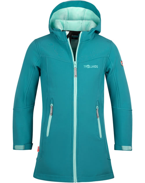 Softshell coat by TROLLKIDS for girls (slightly tailored) with contrasting zips, water-repellent and windproof, flexible-elastic and fluffy warm. A real must for the transition period and for activities that require a high degree of freedom of movement. In addition, a fashionable eye-catcher! Velcro straps on the arms ensure that the sleeve length can be adjusted and no wind penetrates through the cuffs. Reflectors are on the arms; the Norwegian flag and the popular Lonely Troll with the Trollkids logo are shining on the upper arms.