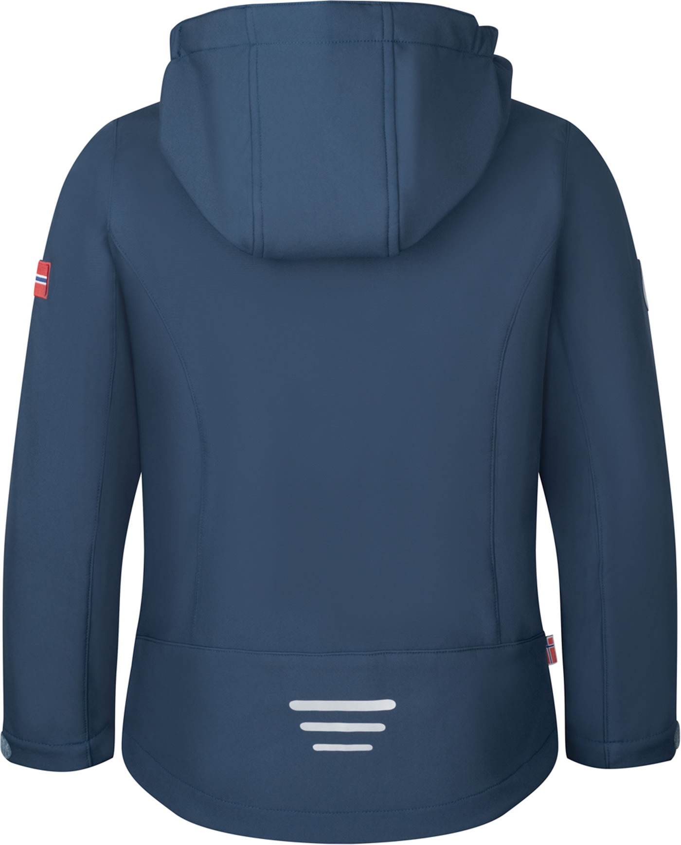 Softshell jacket with a detachable hood by TROLLKIDS with contrasting zips, water-repellent and windproof, flexible, stretchy and fluffy and warm. A real must for the transitional period and for activities that require a lot of freedom of movement. In addition, a fashionable eye-catcher! Velcro fasteners on the arms ensure that the sleeve length can be adjusted and that no wind penetrates the cuffs. Reflectors are located in front and behind. Inside the jacket is lined with soft fleece.
