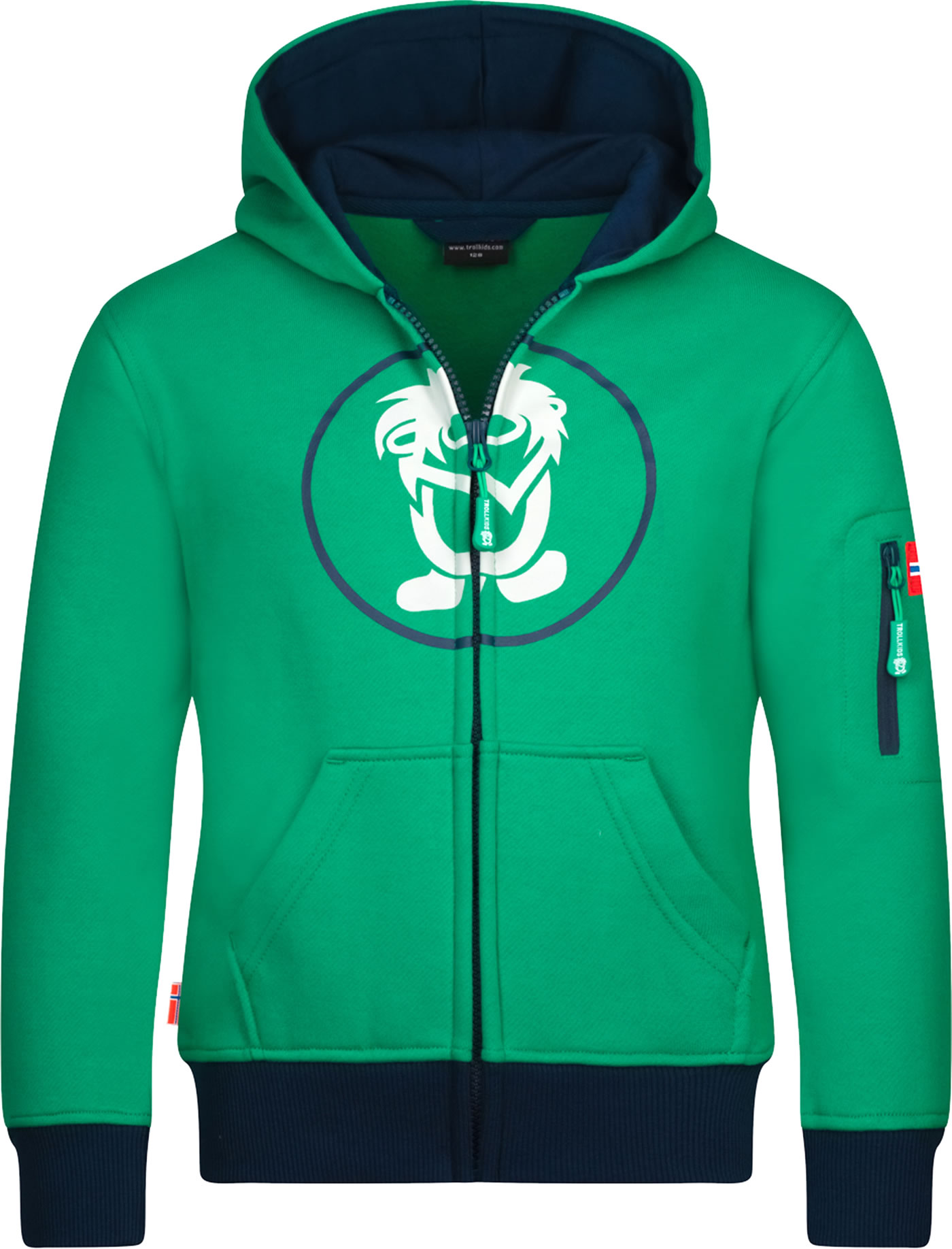 The all-rounder KIDS SORTLAND JACKET is made of soft, easy-care cotton-polyester blend by TROLLKIDS. Front zipper, cuffs and hood lining are contrasted in color. The logo print on the front, the large kangaroo pocket and the sleeve pocket with a contrasting zip make the sweat jacket a casual eye-catcher.