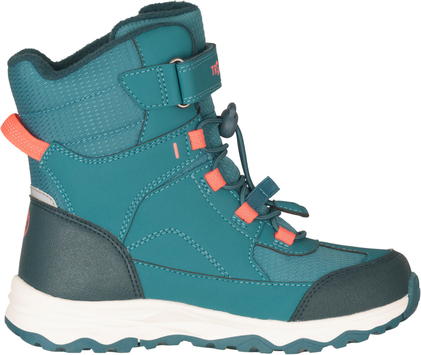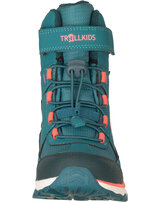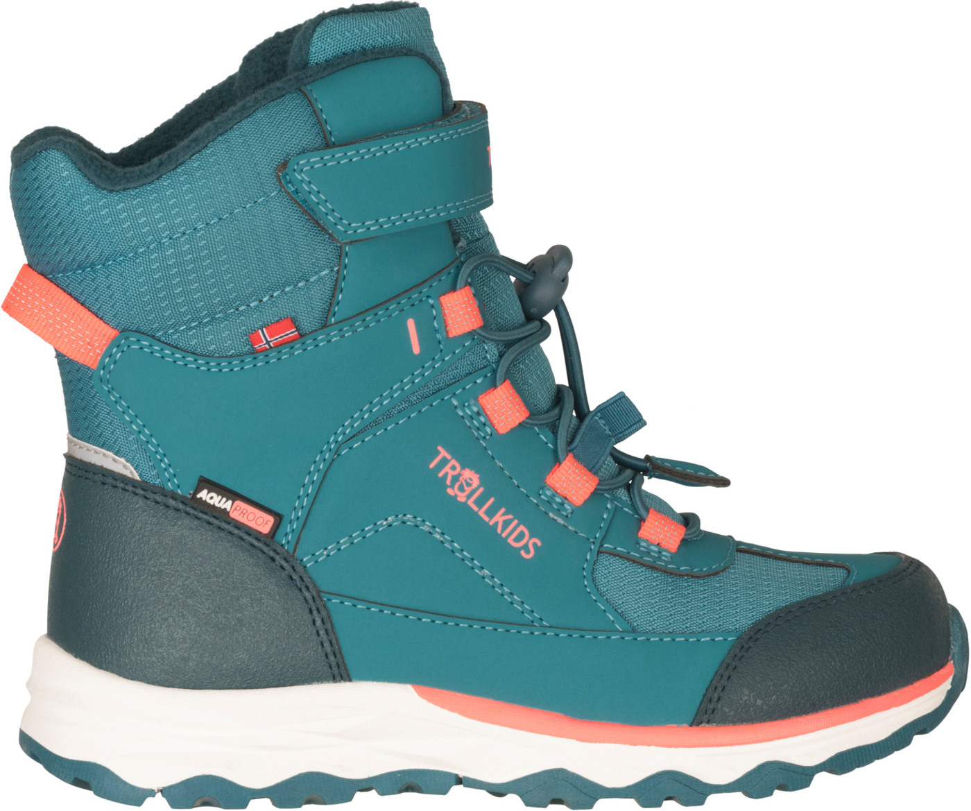 Waterproof and robust winter shoe HAFJELL by TROLLKIDS. The stable, high shaft supports the child's foot. The inside of the shoe is insulated with a fluffy fleece fabric and thanks to the zipper and the two Velcro fasteners, the shoe can be put on and taken off in a flash. The warm winter shoe has reflective elements. With a practical pull-on loop on the heel and removable insole.