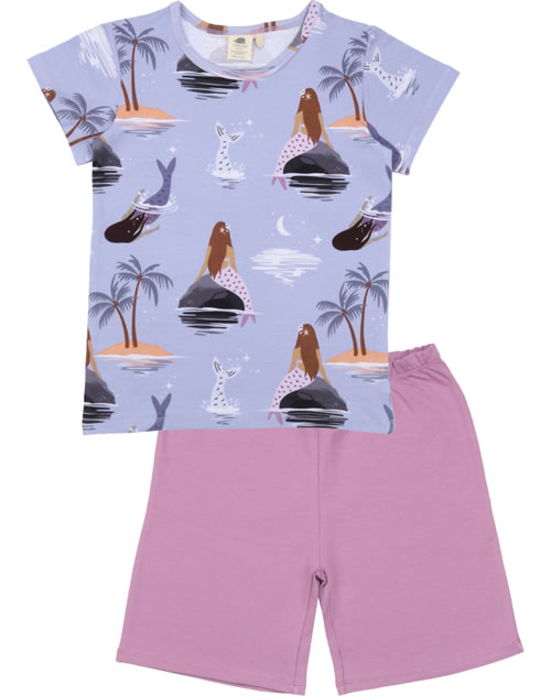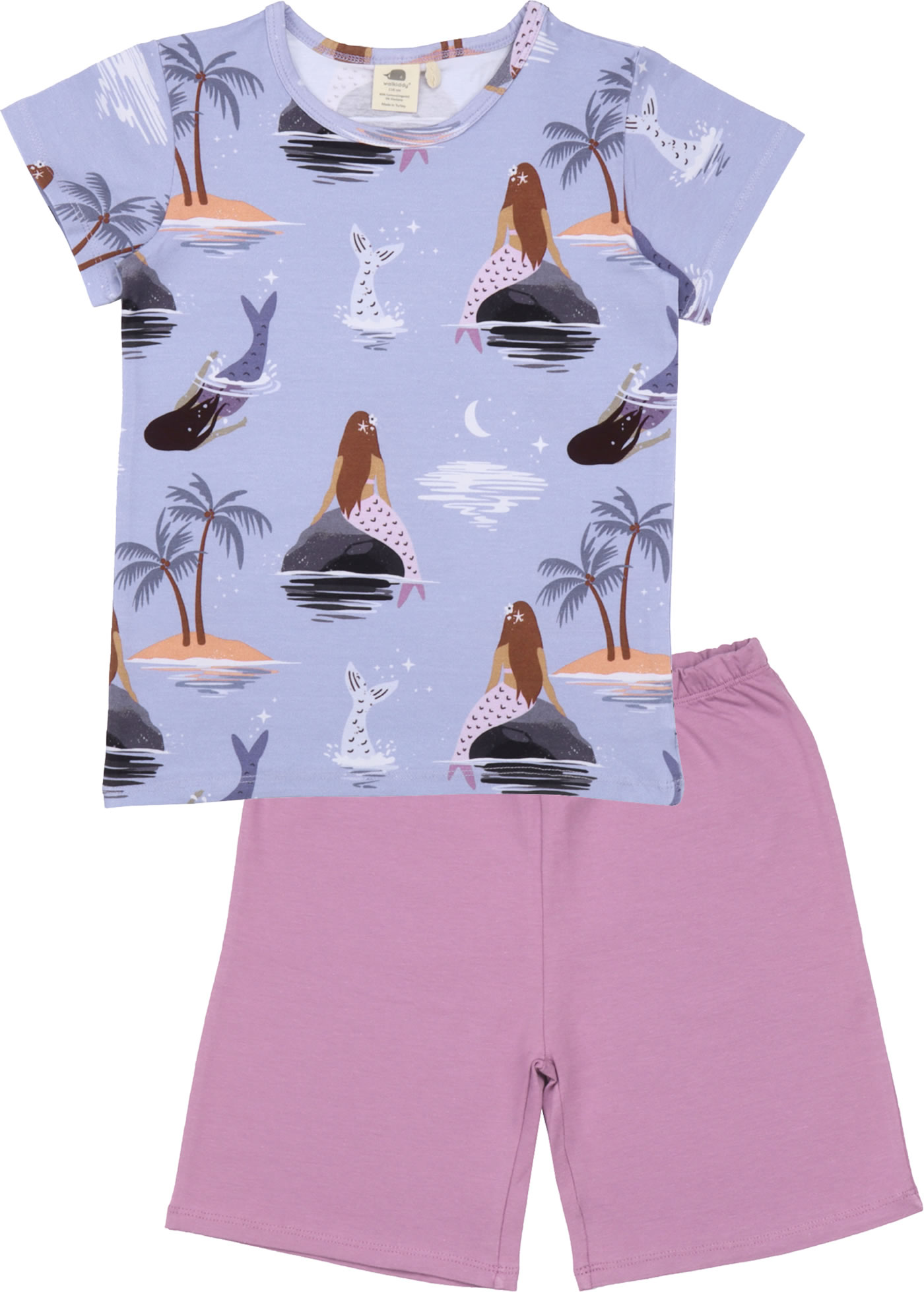 The two-piece pajamas by WALKIDDY in purple has a great mermaid patern on the shirt. The elastic waistband on the plain-colored trousers ensures a good fit. The soft material made of ecological cotton offers a high level of comfort.