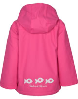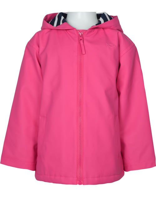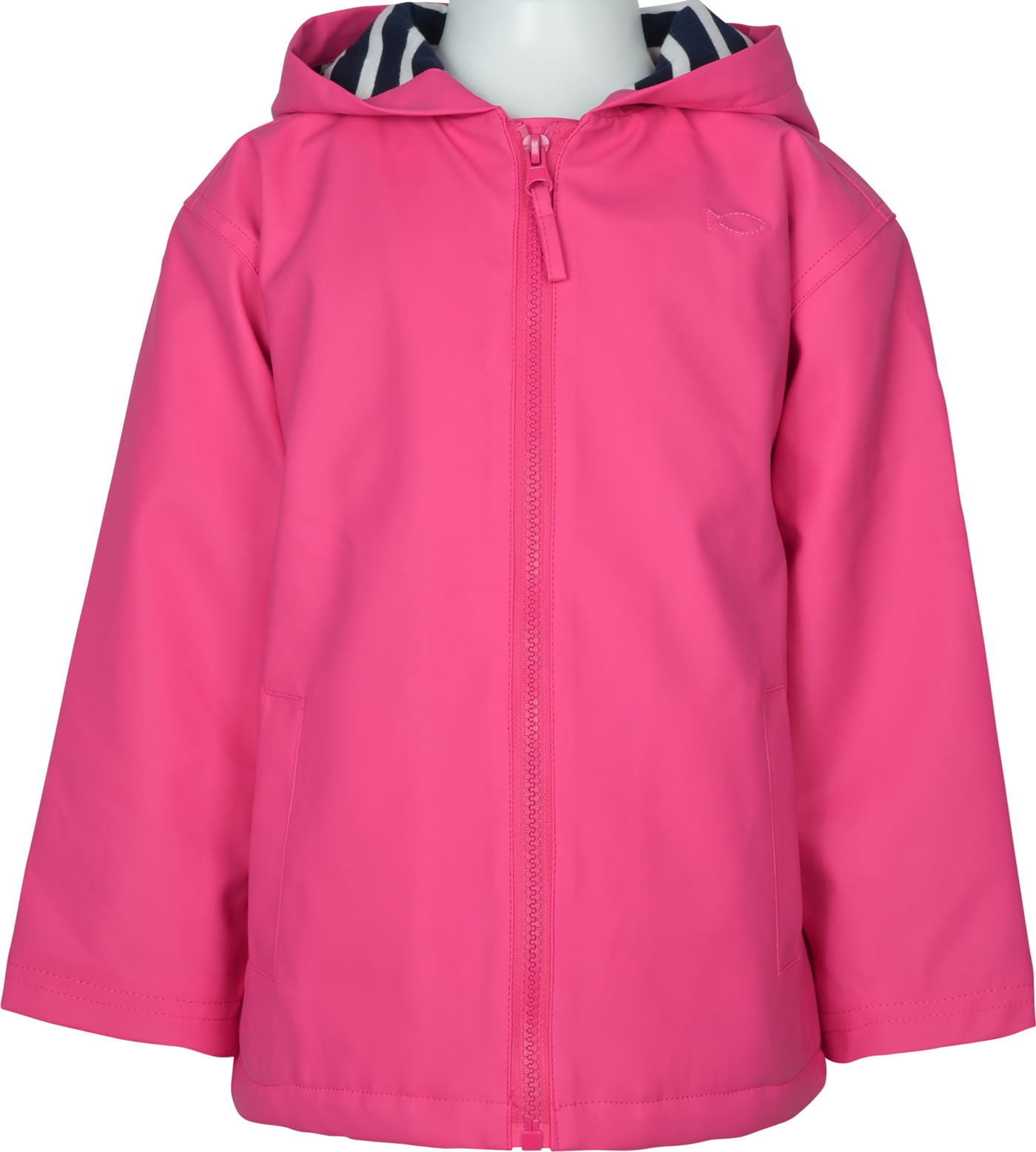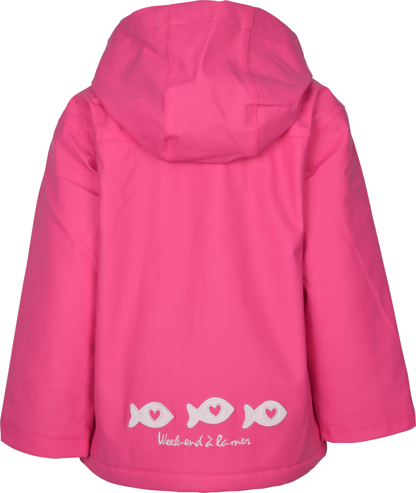 Lined rain jacket with hood by WEEKEND A LA MER for girls in pink. The material is wind and waterproof. It is closed with a zipper. There are two pockets and a small fish sewn on the front. Three fish with hearts are embroidered on the back. The jacket is lined with warm fleece and the hood with striped jersey.