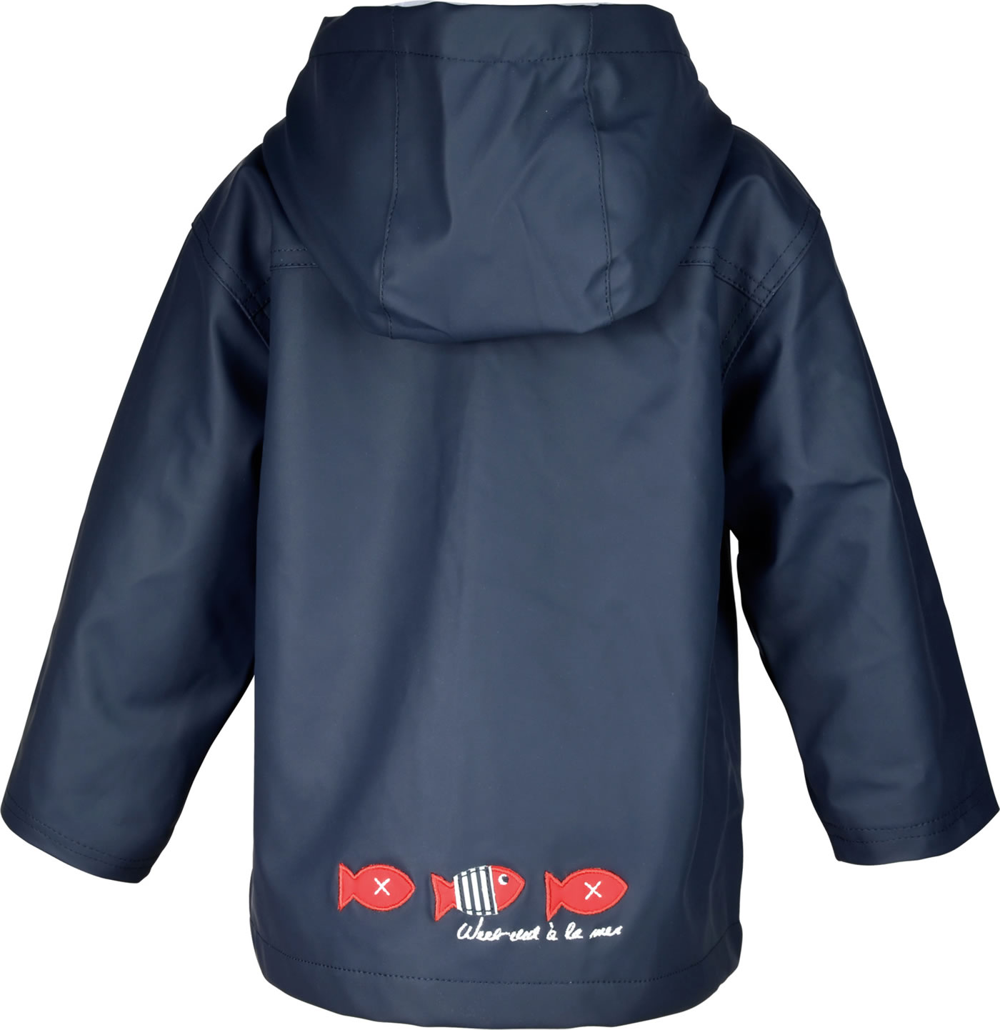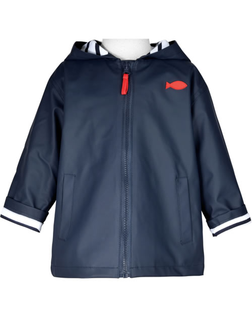 A hooded rain jacket by WEEKEND A LA MER for boys and girls in dark blue. The material is windproof and water-repellent. It is closed with a zipper. There are two pockets and a small fish sewn on the front. Three funny fish are embroidered on the back. The jacket is lined with soft and light cotton jersey in navy blue and white stripes.