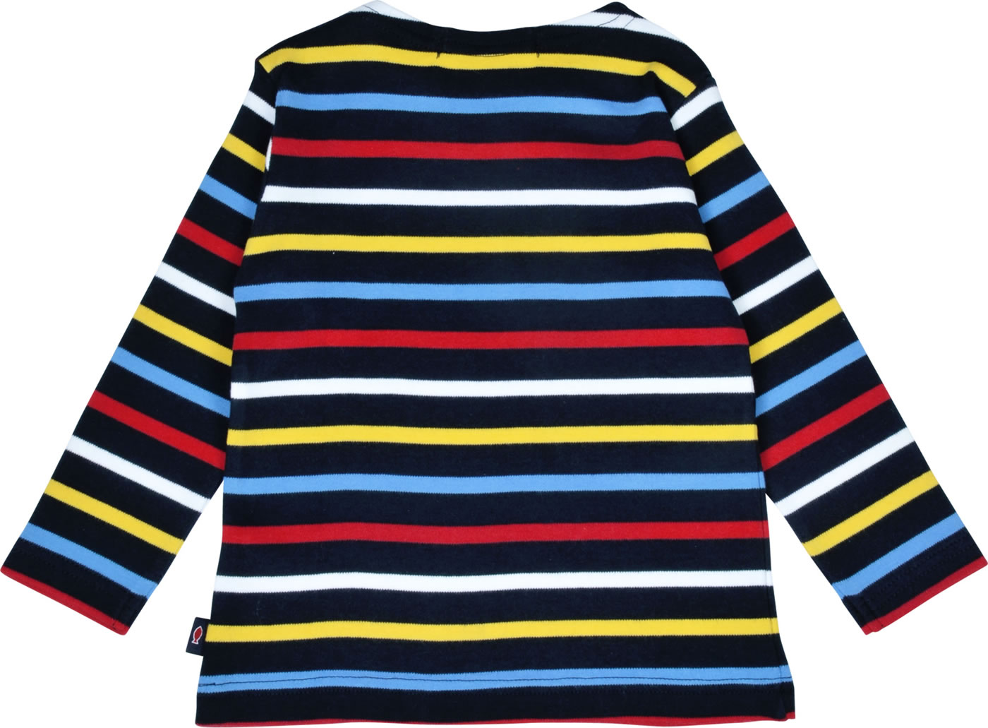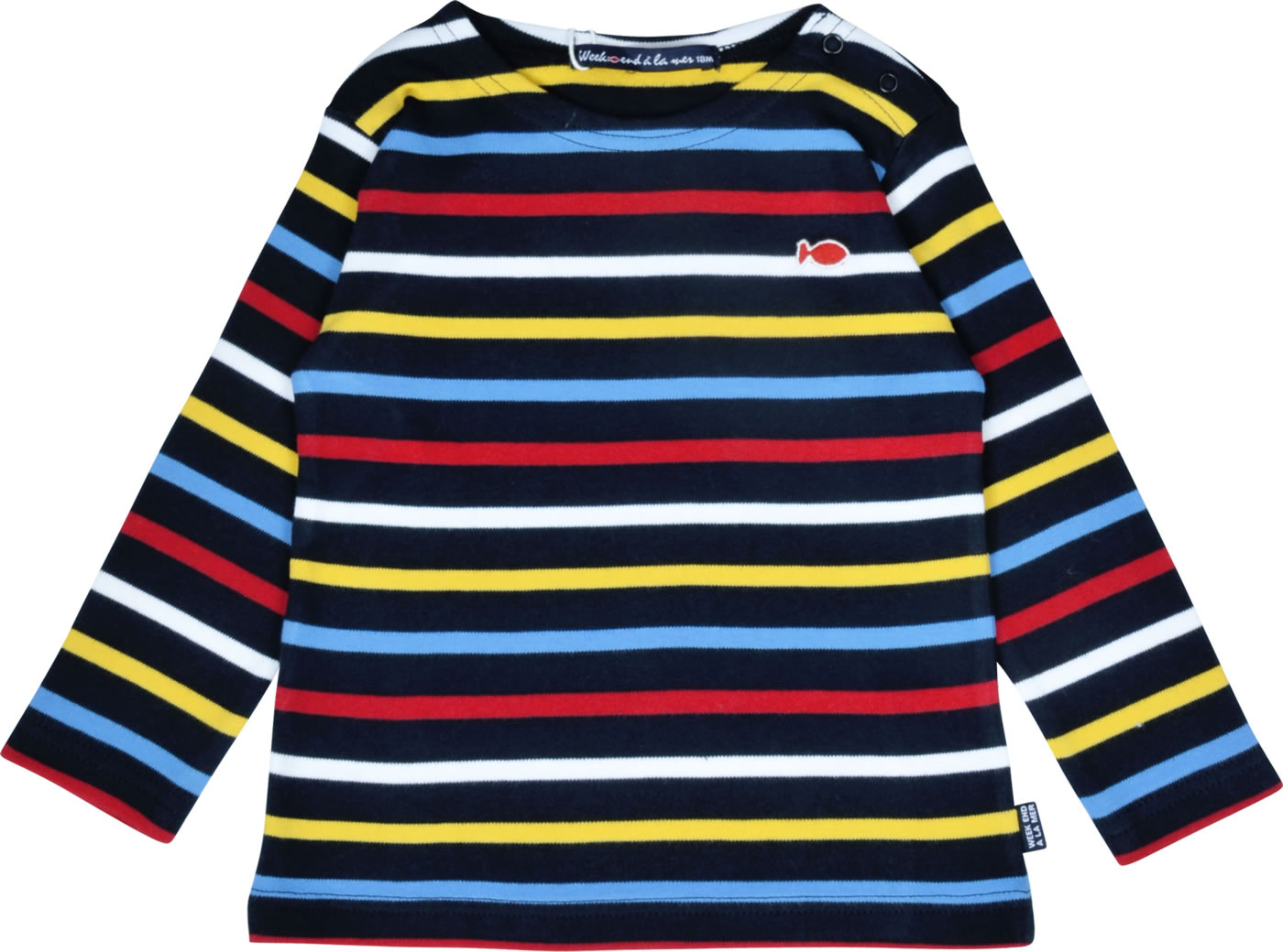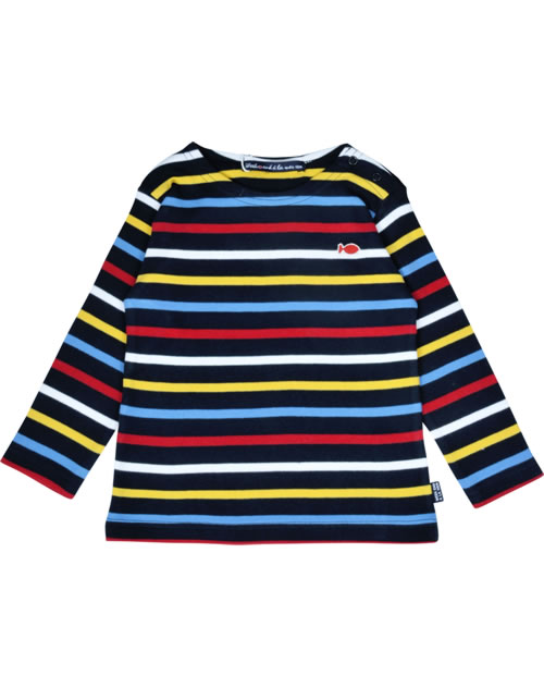 The colorful striped basic long-sleeved shirt by WEEKEND A LA MER warms you on cool summer days. The soft material ensures a high level of comfort. The red embroidered fish is outlined in white and decorates the left breast. Thanks to the two press studs on the neckline, putting on and taking off is child's play.