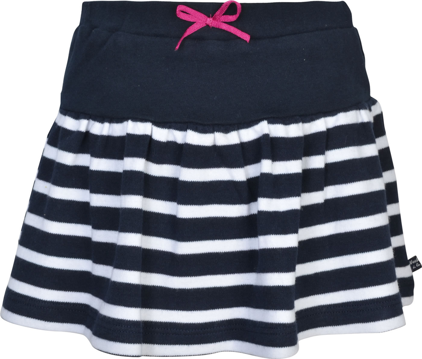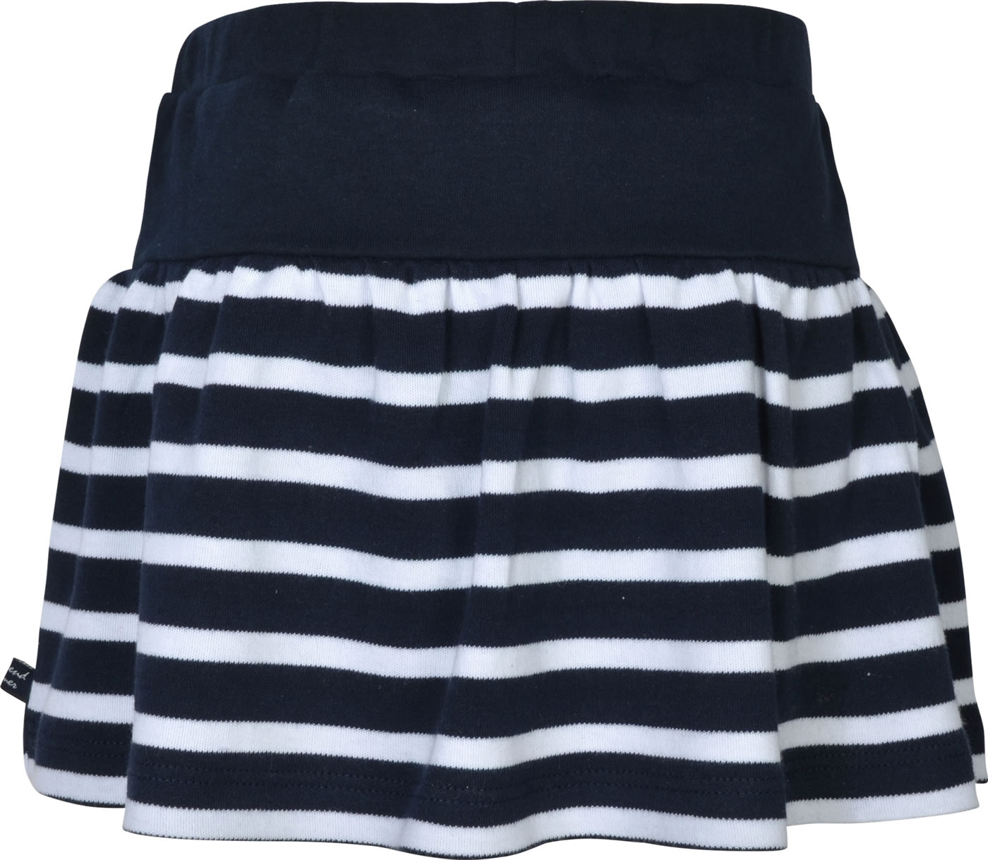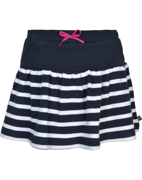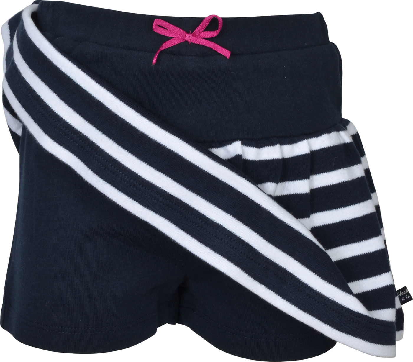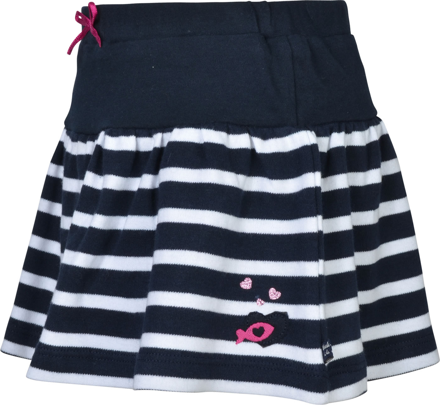 Skirt with shorts from WEEKEND A LA MER. The skirt made of striped Swet fabric has a wide cut. The shorts underneath are made of jersey. Beautiful details are the decorative bow on the elastic waistband and the small fish appliqué with glittering hearts.