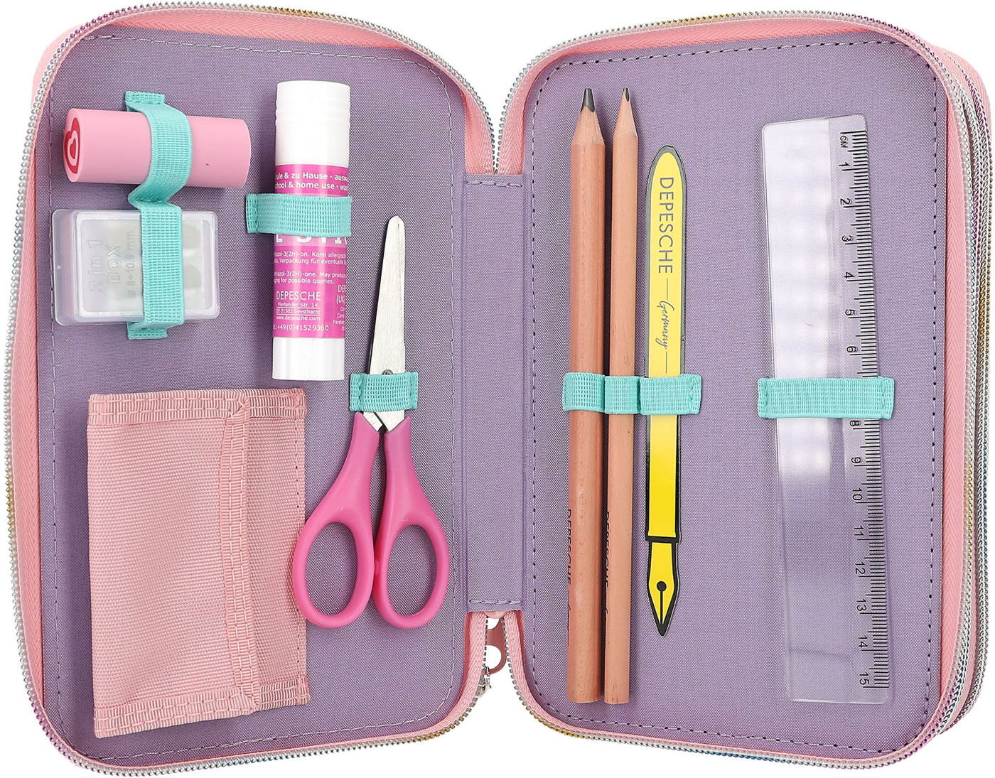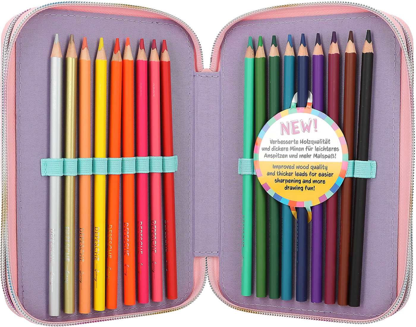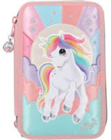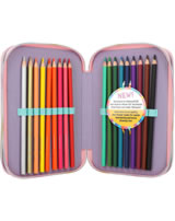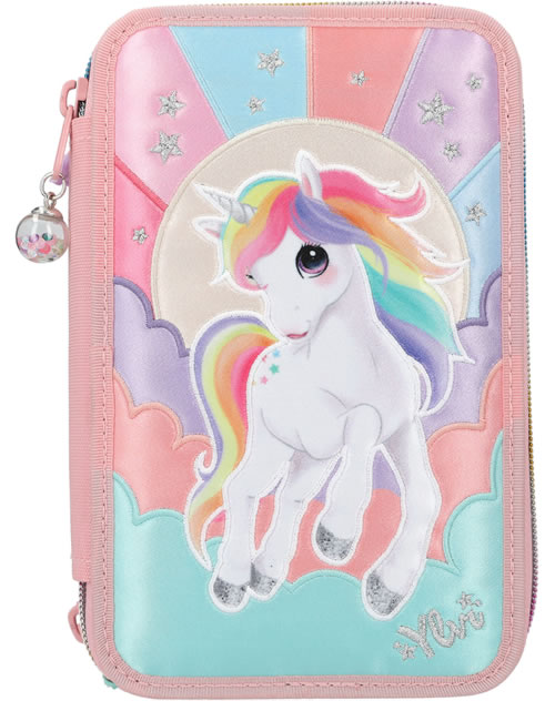 For real unicorn fans: The pencil case from Ylvi has a large unicorn motif on the front in front of a collage-like background made of quilted satin in beautiful turquoise, pink and purple tones. Sweet plus: the glittering ball pendant on the zipper. The three separate compartments of the pencil case are completely filled with 18 colored pencils and felt-tip pens, 2 pencils, sharpener, eraser, ruler, scissors, glue stick and a small Velcro bag.
