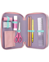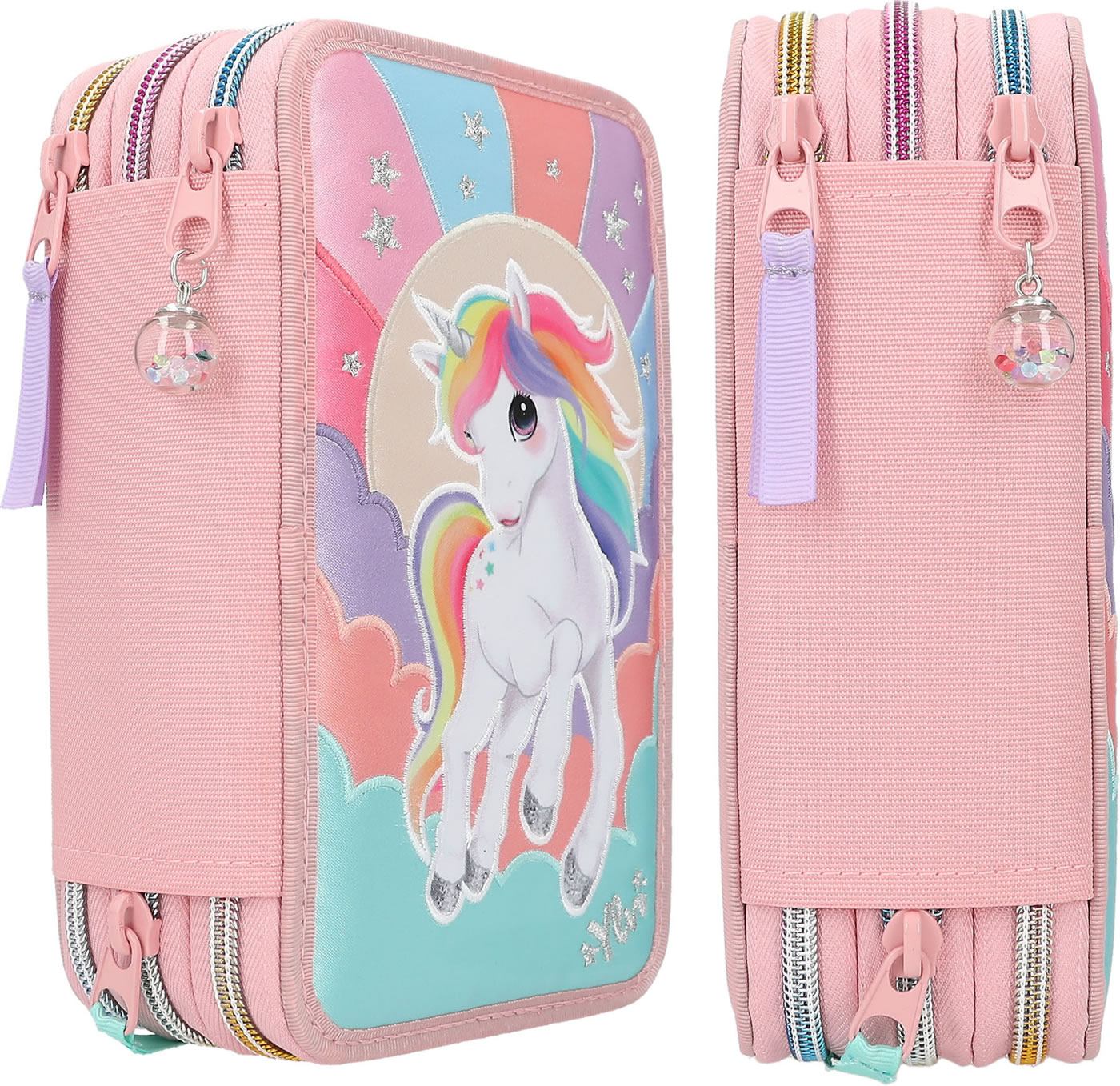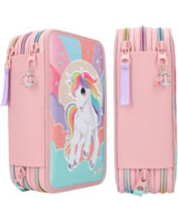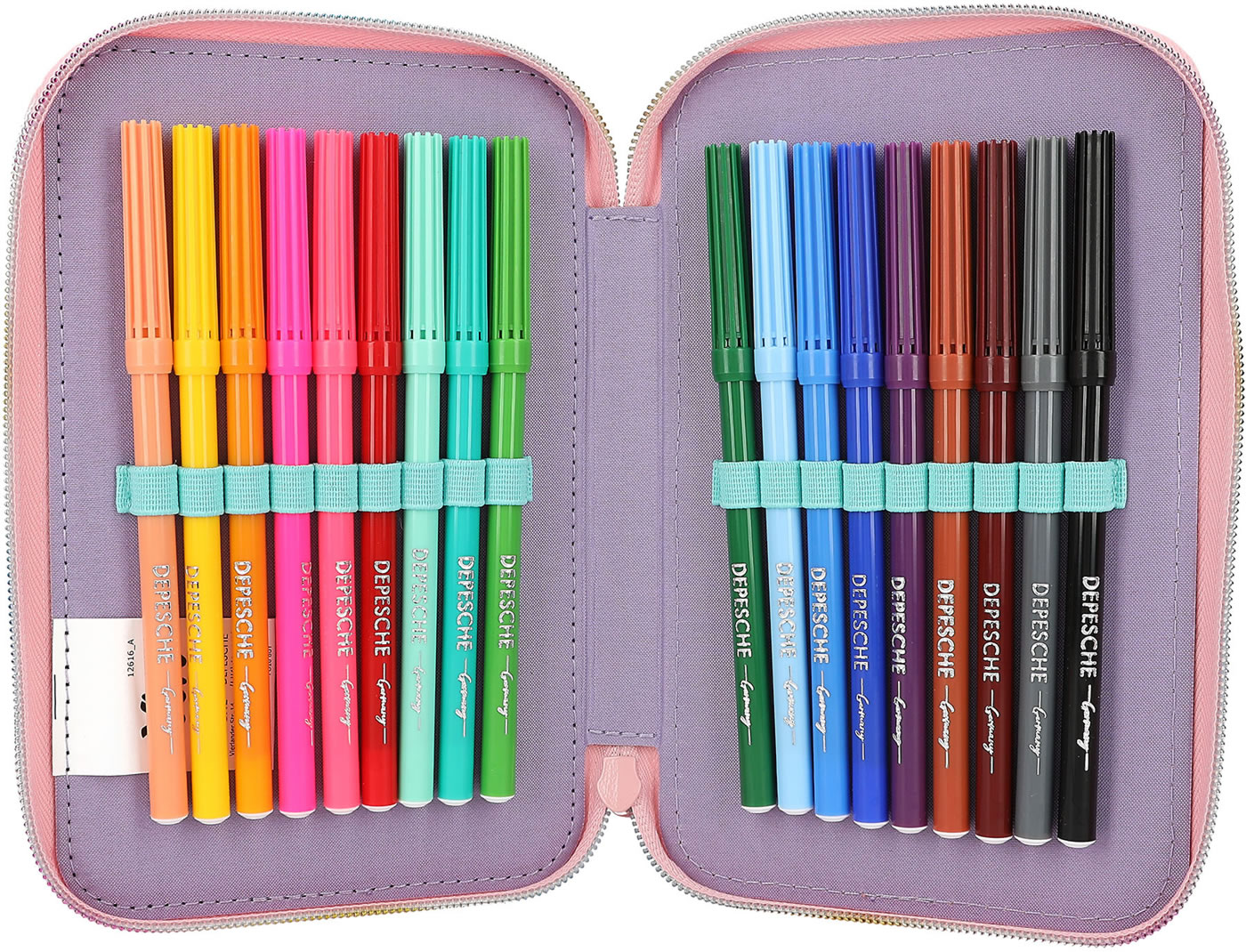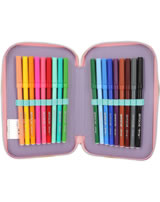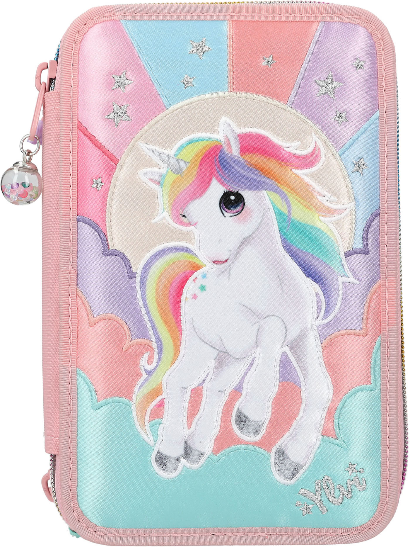 For real unicorn fans: The pencil case from Ylvi has a large unicorn motif on the front in front of a collage-like background made of quilted satin in beautiful turquoise, pink and purple tones. Sweet plus: the glittering ball pendant on the zipper. The three separate compartments of the pencil case are completely filled with 18 colored pencils and felt-tip pens, 2 pencils, sharpener, eraser, ruler, scissors, glue stick and a small Velcro bag.