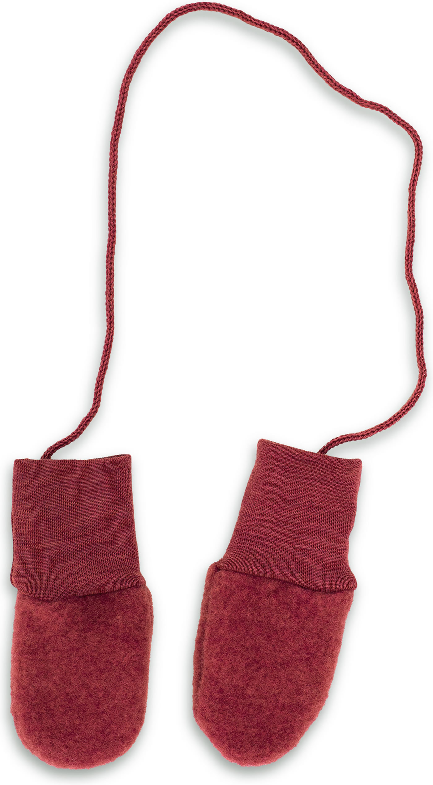 Kuschelweiche und flauschige Baby-Fleecefäustlinge ohne Daumen aus Schurwolle, welche die Finger schön warm halten und durch ein gestricktes Band zusammengebunden sind.