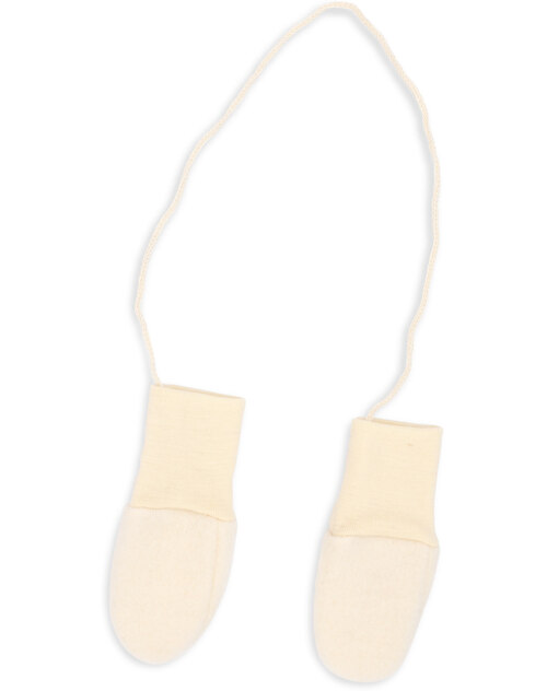 Kuschelweiche und flauschige Baby-Fleecefäustlinge ohne Daumen aus Schurwolle, welche die Finger schön warm halten und durch ein gestricktes Band zusammengebunden sind.