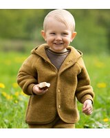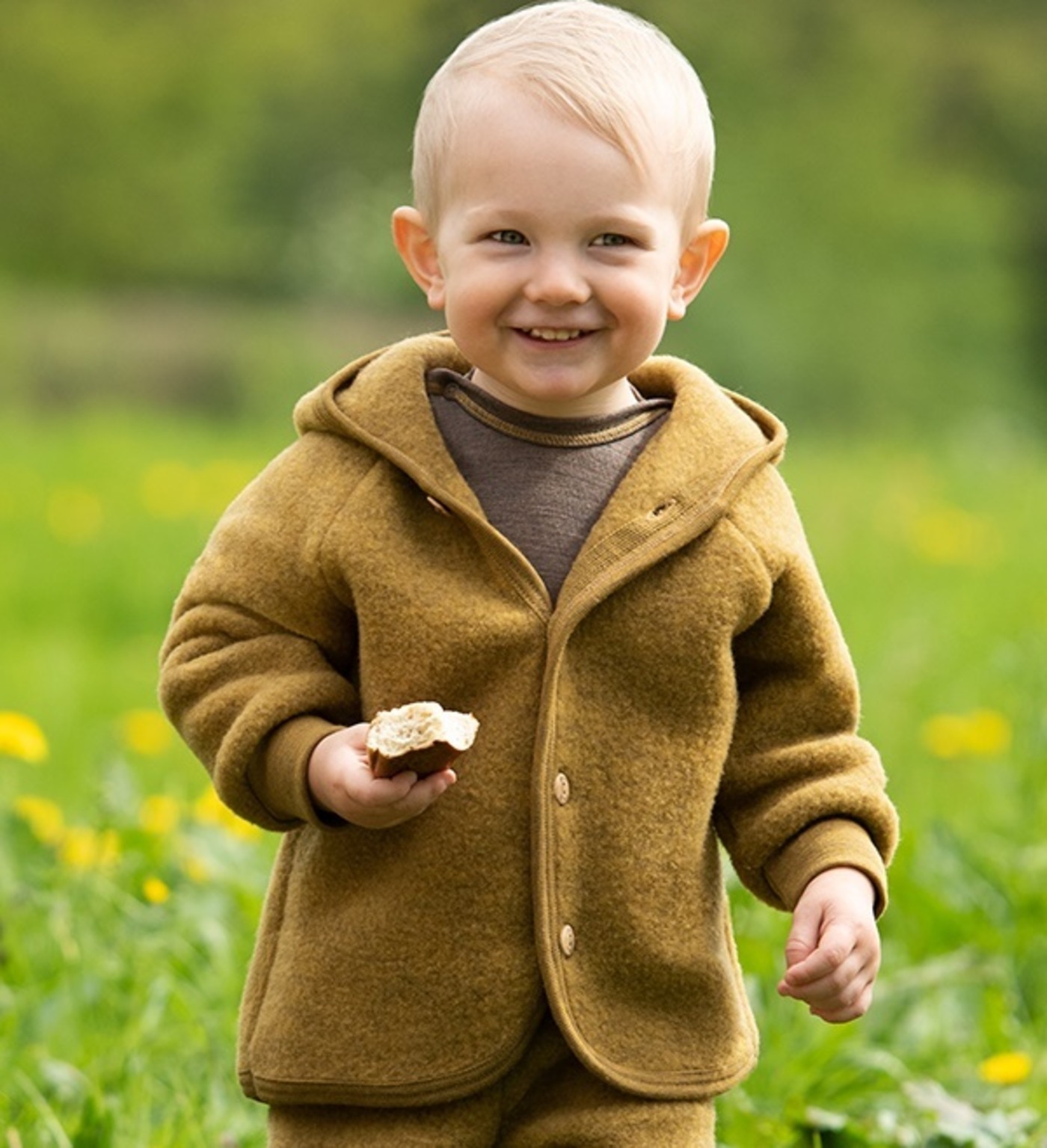 Diese Fleecejacke mit Kapuze von Engel ist aus reiner, weicher Schurwolle gefertigt und hält Kinder angenehm warm, ohne zu überhitzen.