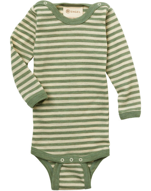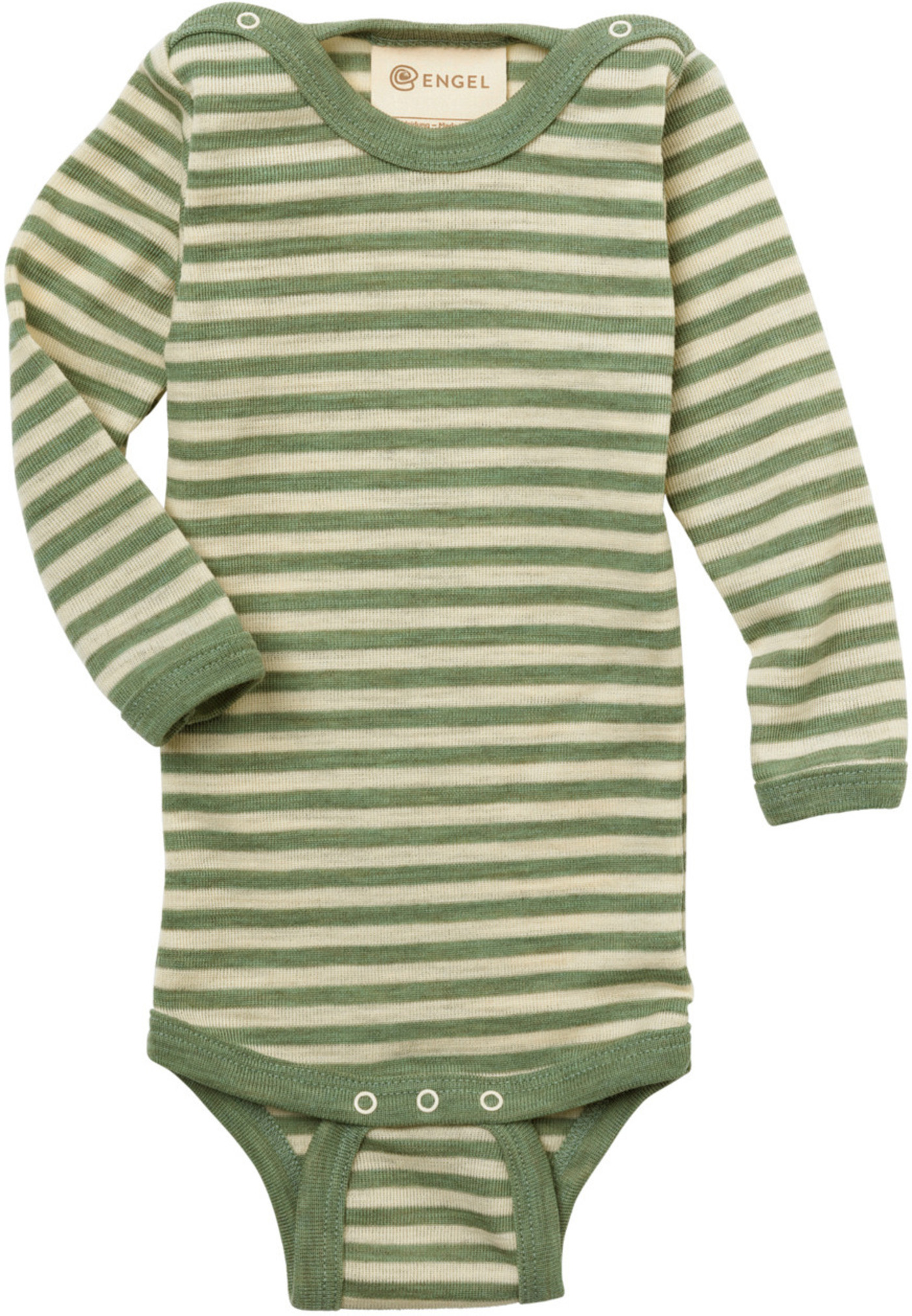 Dieser angenehm weiche Babybody mit langen Ärmeln und Schlupfausschnitt von ENGEL besteht aus 100% Schurwolle und ist gestreift.