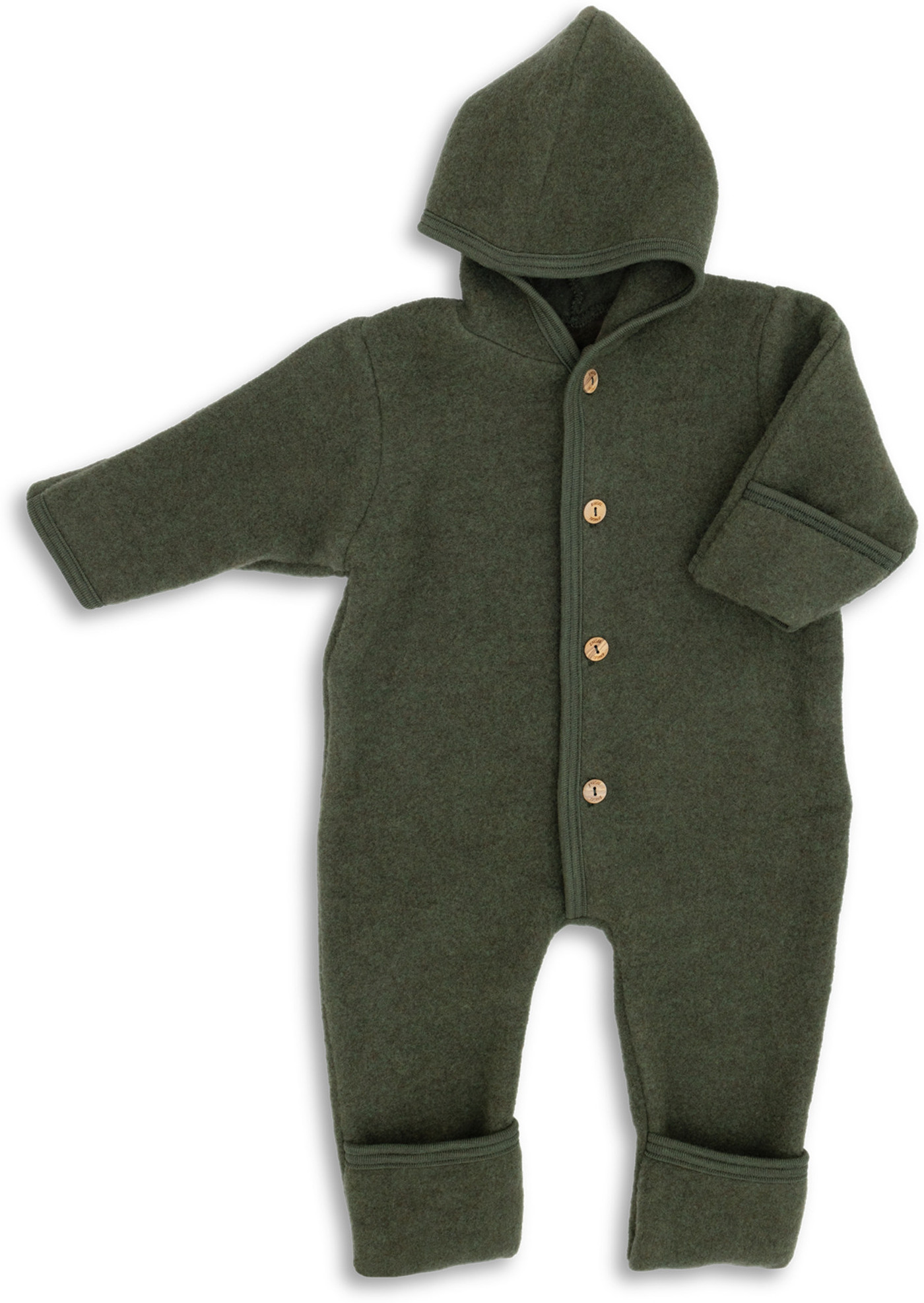 Kuschelweicher und flauschiger Schurwolle-Fleeceoverall von ENGEL mit Holzknöpfen. Das Material unterstützt ein gesundes Hautklima. Die umschlagbaren Stulpen an den Ärmeln ersetzen die Handschuhe und an den Füßen schützen sie vor kaltem Wind.